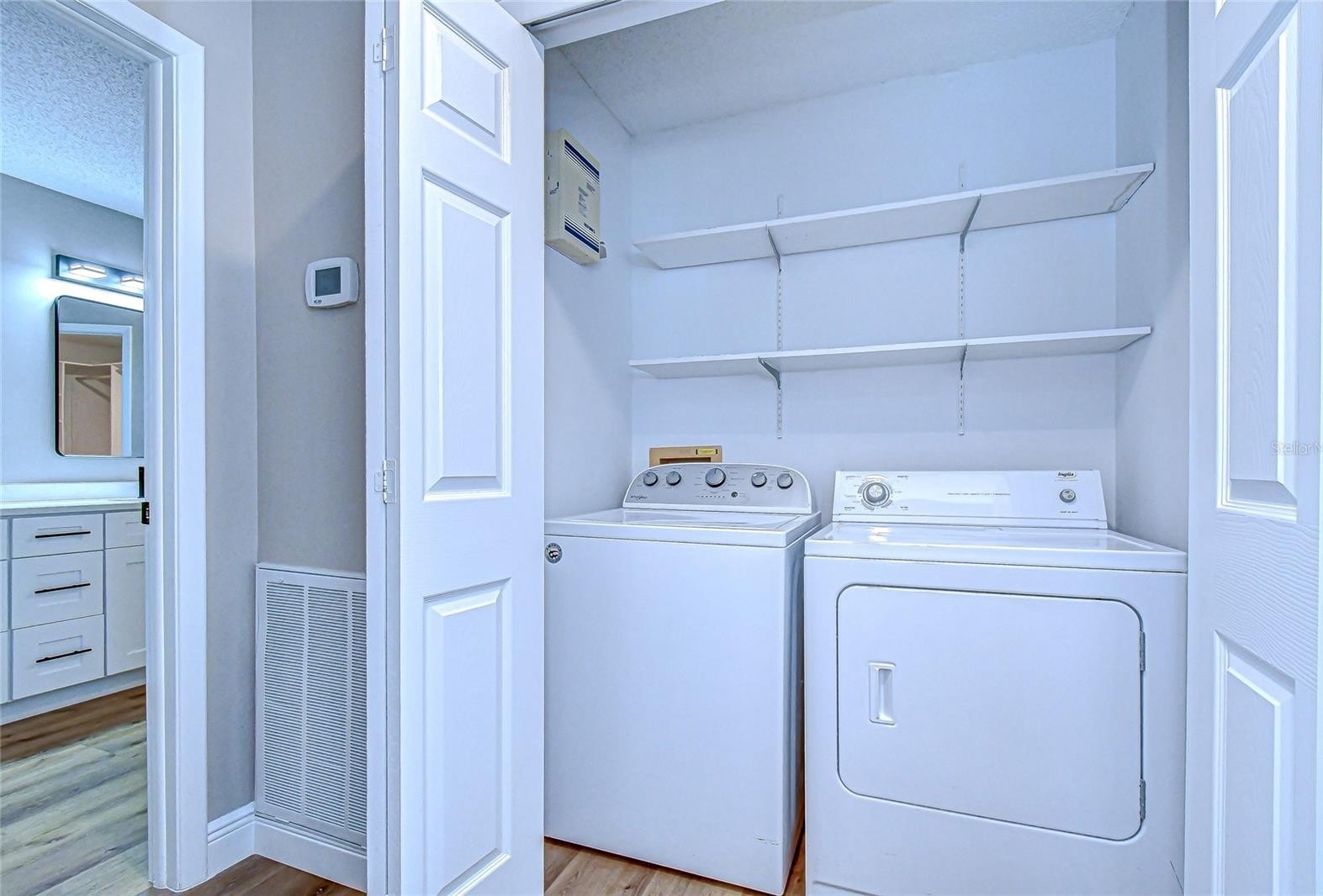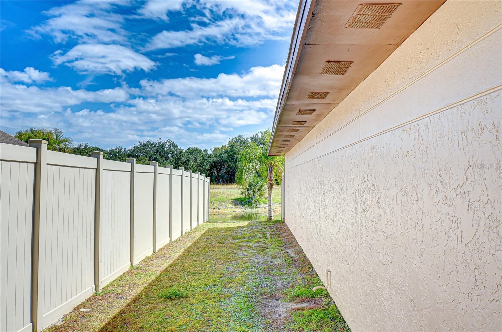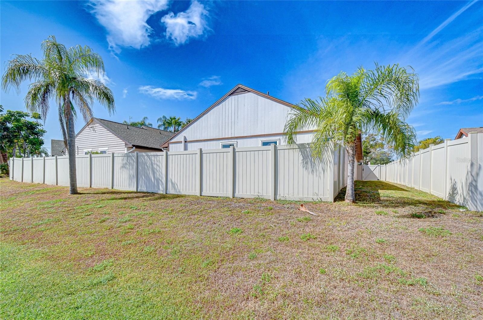 The laundry area is conveniently located in the hallway behind bifold doors. From the great room double sliding glass doors complete with vertical blinds open to a covered lanai and extended patio, surrounded by fresh landscaping and a beautiful place for entertaining or relaxing outdoors.