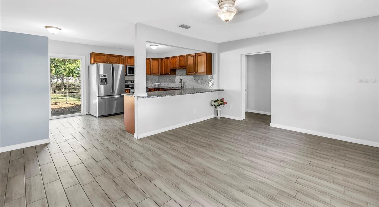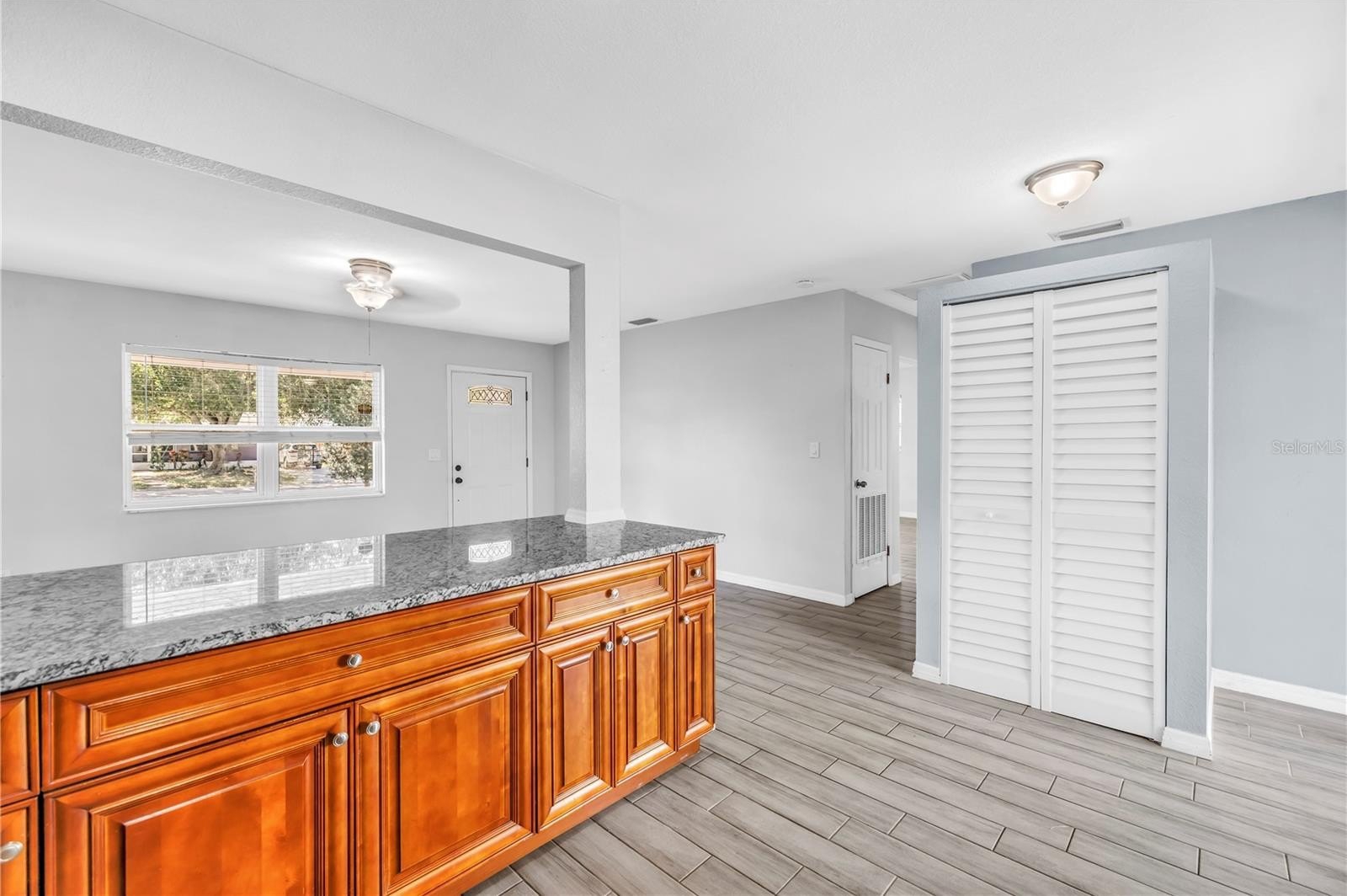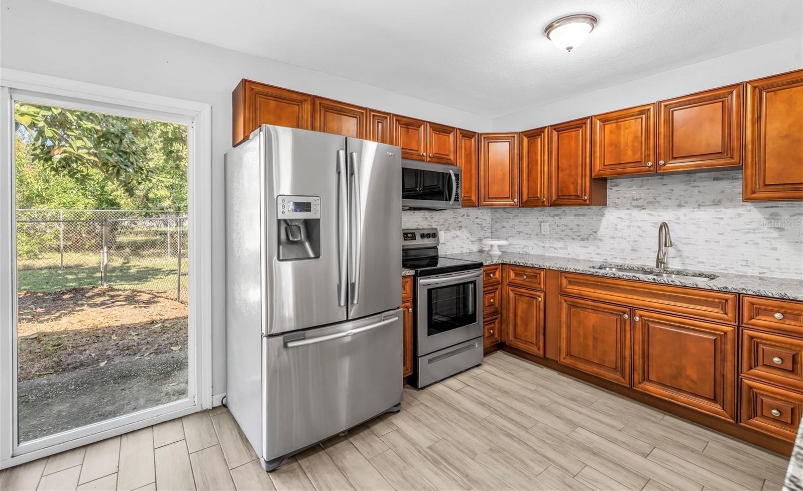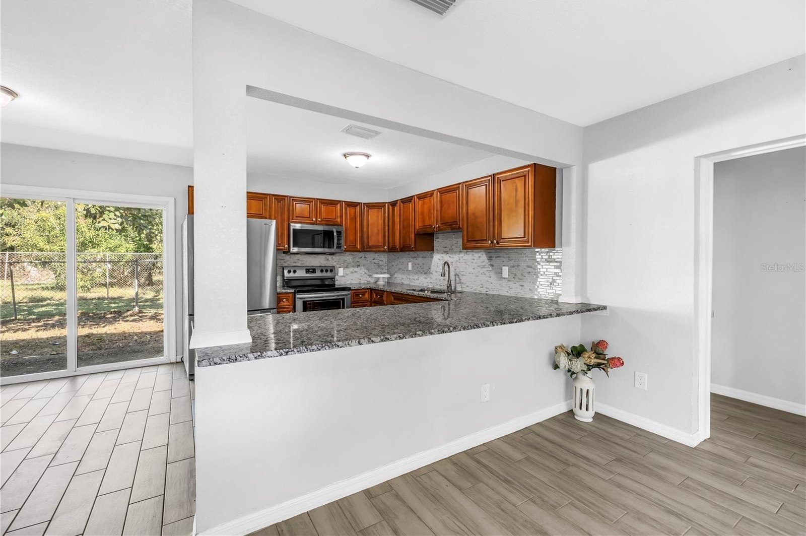 Inside you'll discover a spacious, light-filled kitchen designed for connection and creativity. A generous breakfast bar invites family and friends to gather while meals are prepared, and the warm wood cabinetry, granite countertops, and stainless-steel appliances create a space that’s as functional as it is beautiful. There’s room here for two true chefs to cook side by side—and still have space to laugh and linger.