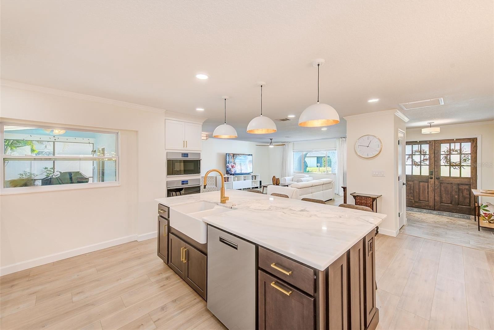 The chef’s suite of appliances includes an induction cooktop, stainless range hood, double oven with built-in air fryer and convection microwave, a large farmhouse sink with touchless faucet, and brushed-gold hardware that complements the soft-close cabinetry and custom tile backsplash. Crown moulding adds a refined finishing touch, while the dining and living areas flow seamlessly toward the pool for effortless entertaining.