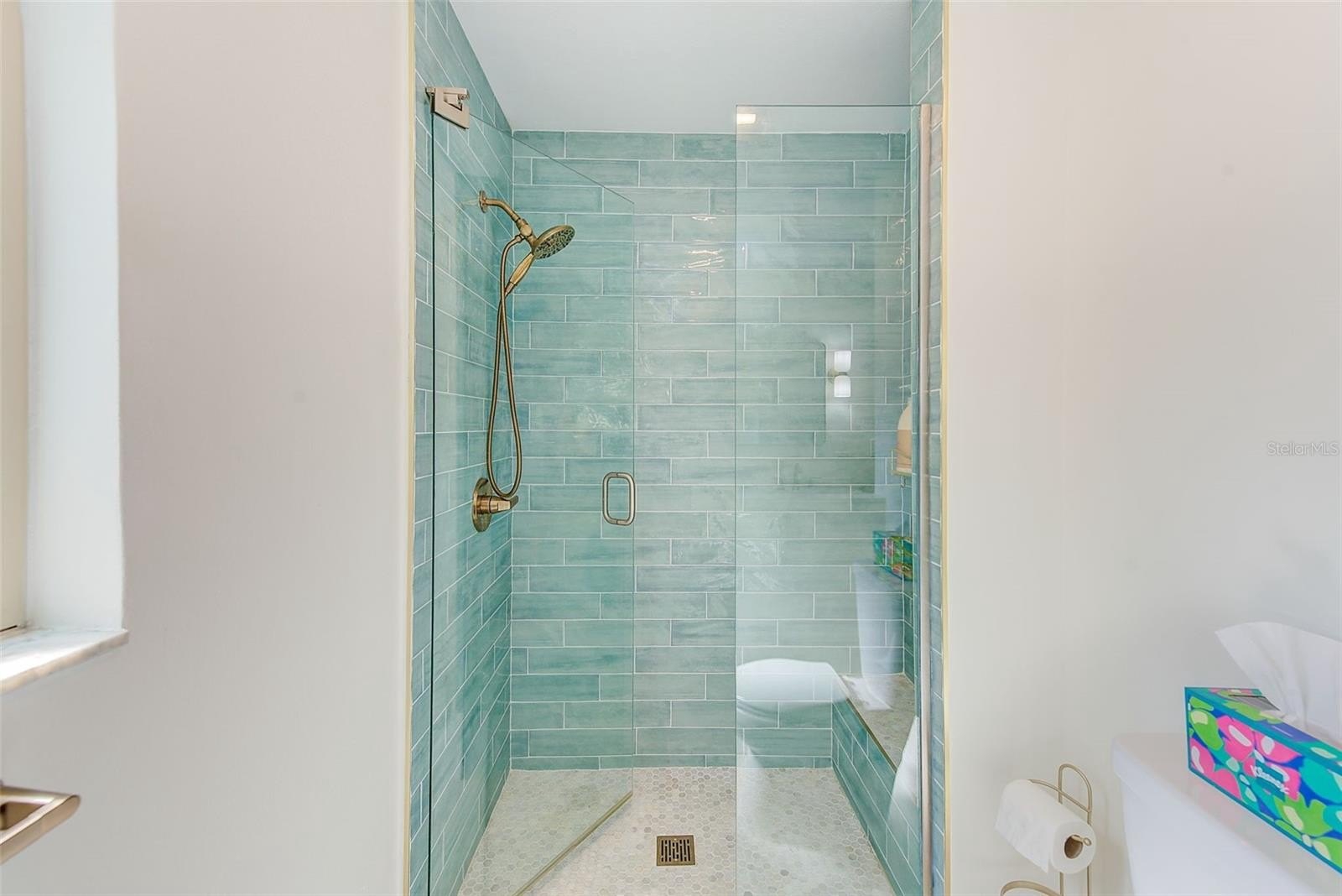 Luxury vinyl plank flooring extends throughout the home, with designer tile in the entry and baths. The spacious primary suite features sliding glass doors to the pool, a walk-in custom closet, double linen closet, and a modern barn-style frosted-glass door leading to the ensuite bath. The newly renovated bathroom feels like a spa retreat with a large frameless glass shower surrounded by tranquil, sea-glass-colored tile, a double wood vanity with quartz counters, a wide rectangular mirror, and stylish side-light sconces that create a warm, zen-like ambiance.