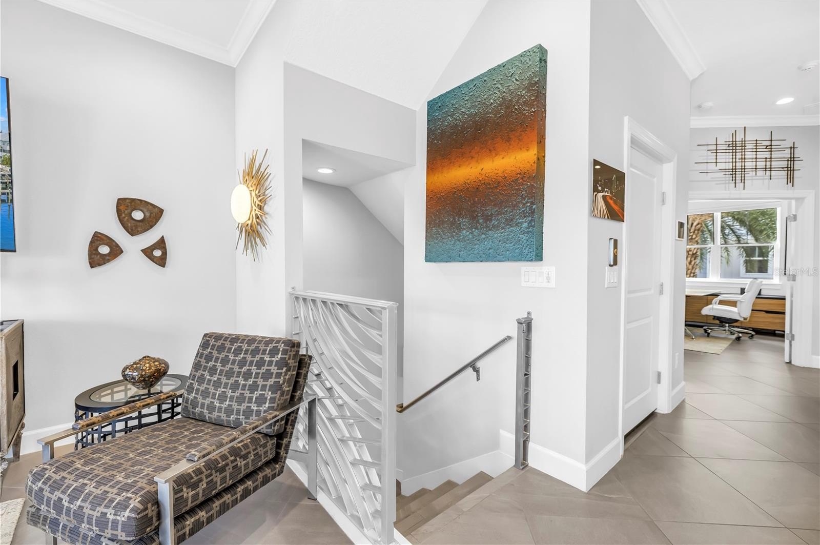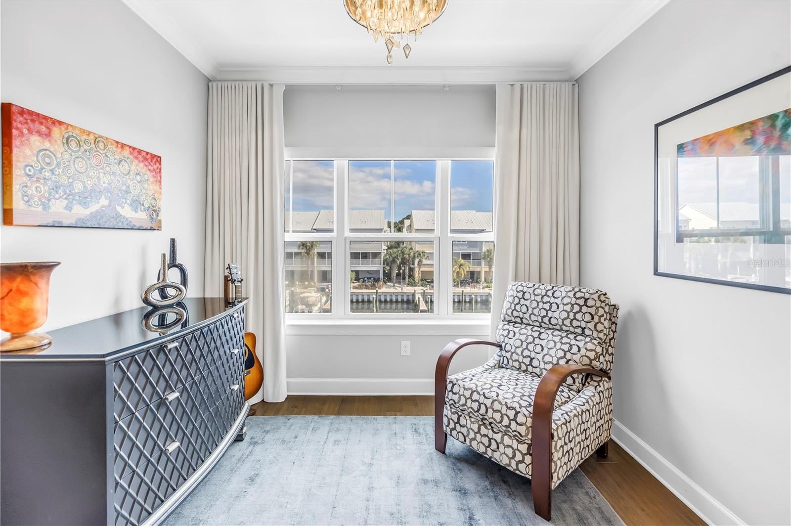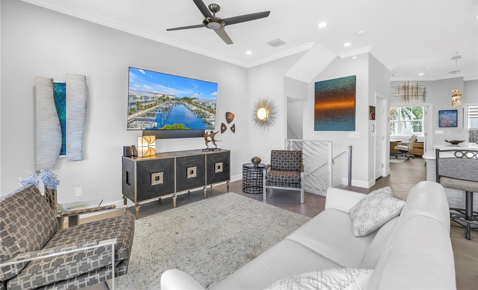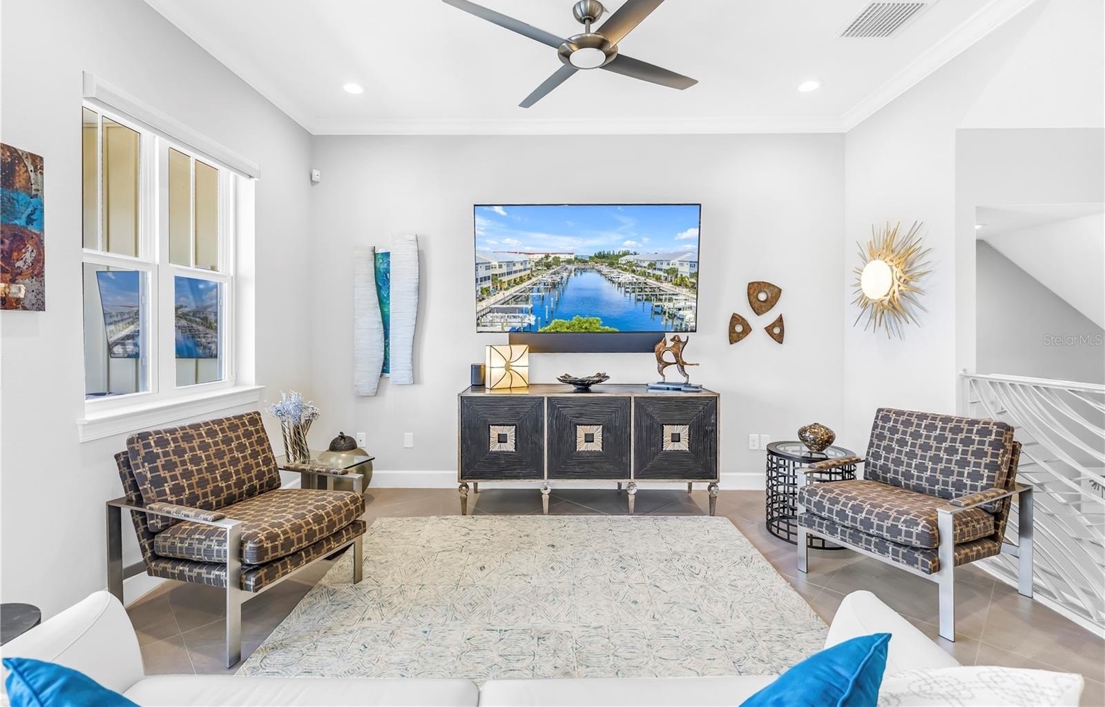 Architecturally designed for both beauty and function, the custom kitchen serves as the centerpiece of this waterfront townhome in The Cove at Loggerhead Marina — a private, gated community inspired by Key West charm. Experience refined coastal living at its finest in this impeccably upgraded residence, perfectly suited for boaters and nature lovers alike. The community is uniquely situated within the grounds of Loggerhead Marina, offering convenient access to its full-service marina and open waterways including Tampa Bay, Boca Ciega Bay, and the Gulf. This three-story home features a private elevator, 3 bedrooms, 2.5 baths, and a versatile bonus room ideal for a home office, den, or guest space. The main living level showcases an open-concept design with volume ceilings and the home’s bespoke, architecturally designed kitchen, featuring a 7-foot island, 42” cabinetry, quartz countertops, and premium stainless steel appliances including a built-in Thermador refrigerator/freezer and induction range. The adjoining living and dining areas flow seamlessly to a screened-in porch overlooking the water, where you can relax or entertain while taking in views of the marina and watching dolphins and manatees glide by. A custom stair railing with integrated gate extends throughout all levels of the home, adding both architectural character and functional design.Upstairs, the spacious primary suite offers tranquil water views, a cozy sitting area, walk-in closet, and a luxurious en-suite bath with dual vanities, a seamless walk-in shower, and a private water closet. Two additional bedrooms, a remodeled guest bath with custom vanity and walk-in shower (no tub), and a convenient laundry room complete the upper level. The oversized tandem two-car garage offers abundant storage for bikes, paddleboards, and beach gear. The extended lanai, equipped with outdoor televisions and speakers, provides the perfect setting for year-round entertaining. Enjoy peaceful water views and gentle breezes from this inviting space — ideal for unwinding at the end of the day or hosting friends in a relaxed coastal setting. Both the lanai and screened-in porch are equipped with outdoor speakers and televisions, enhancing every gathering — from quiet morning coffee to sunset cocktails. This property also offers peace of mind, having experienced no flooding during recent Hurricanes Helene and Milton. Community amenities include a resort-style pool with Tiki hut (equipped with cable TV and power), the Captain’s Lounge for gatherings, scenic walking trails, and community-wide mosquito control — all included in the HOA dues along with other covered services and utilities. Unbeatable location: just 8 minutes to vibrant downtown St. Petersburg, 10 minutes to world-famous St. Pete Beach, and 25 minutes to Tampa via I-275. Discover where coastal elegance meets effortless living — at The Cove at Loggerhead Marina.