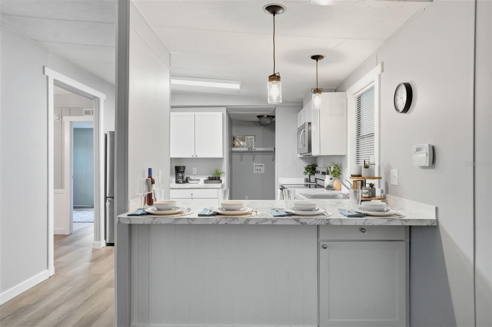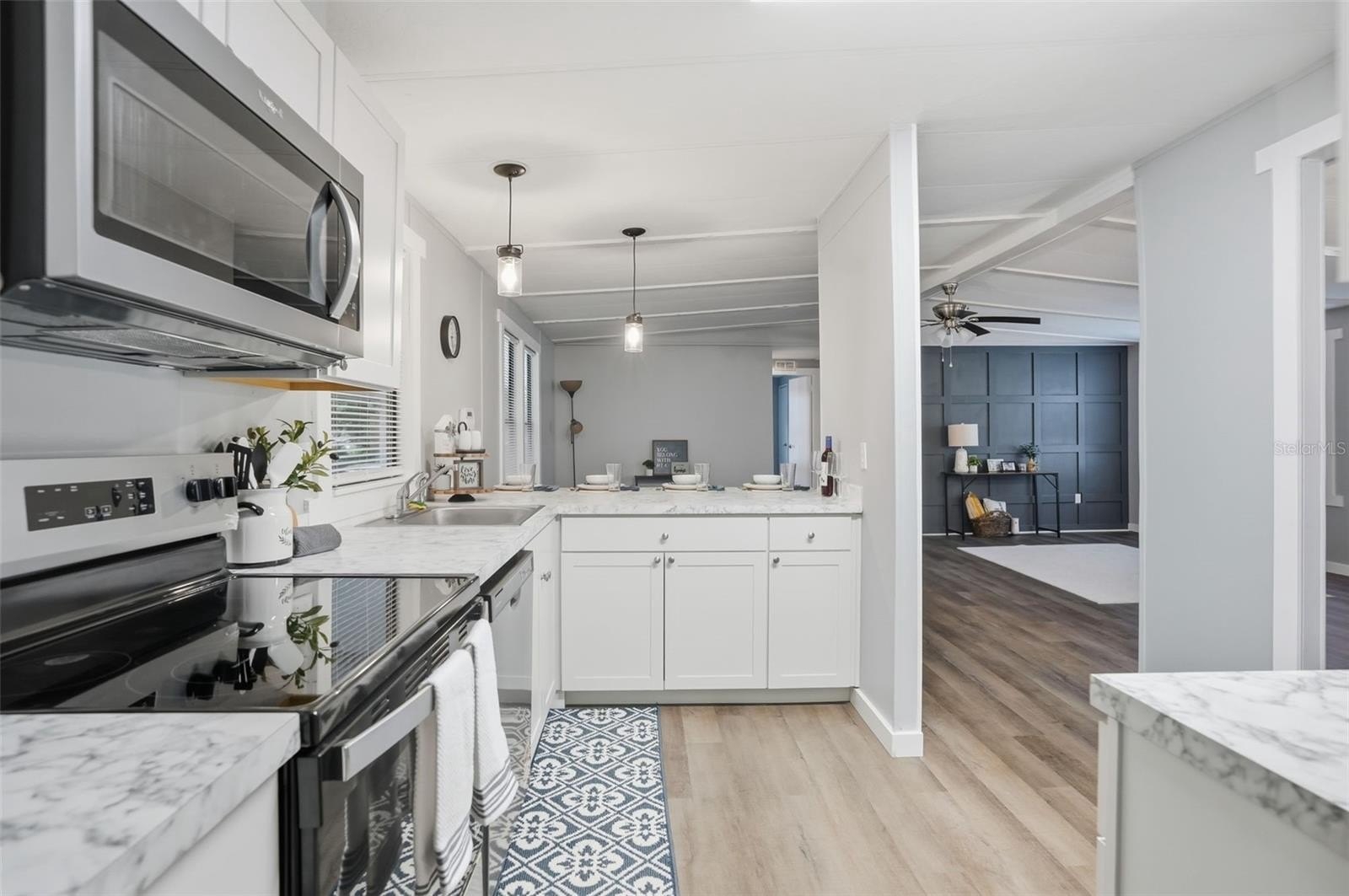 This is a beautiful home that has been all remodeled - gorgeous finishes with accent wall in the living room, too! All NEW stainless steel appliances! New real wood white, shaker kitchen cabinets with breakfast bar for extra seating!! The kitchen is open to the dining room, large family room making this home feel light, bright, and spacious -- great for entertaining family and friends!! You have an extra room to use as a dining room or office/den!! Split floorplan offers privacy to the master suite! Master has ensuite bathroom and large walk-in closet! Bedrooms 2 and 3 also have walk-in closets!! Inside laundry room! Large storage area in the screened porch area for all your tools and storage needs!