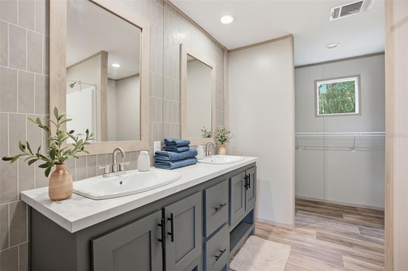 The primary suite is a true retreat, featuring a spacious bedroom and a luxury en-suite bathroom with tub and shower combo, dual designer sinks and mirrors. This master bathroom is super spacious and truly an impressive upgrade for the home!! Large walk-in closet in the master suite!!