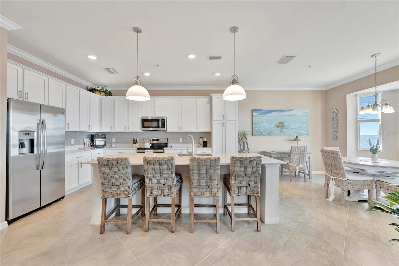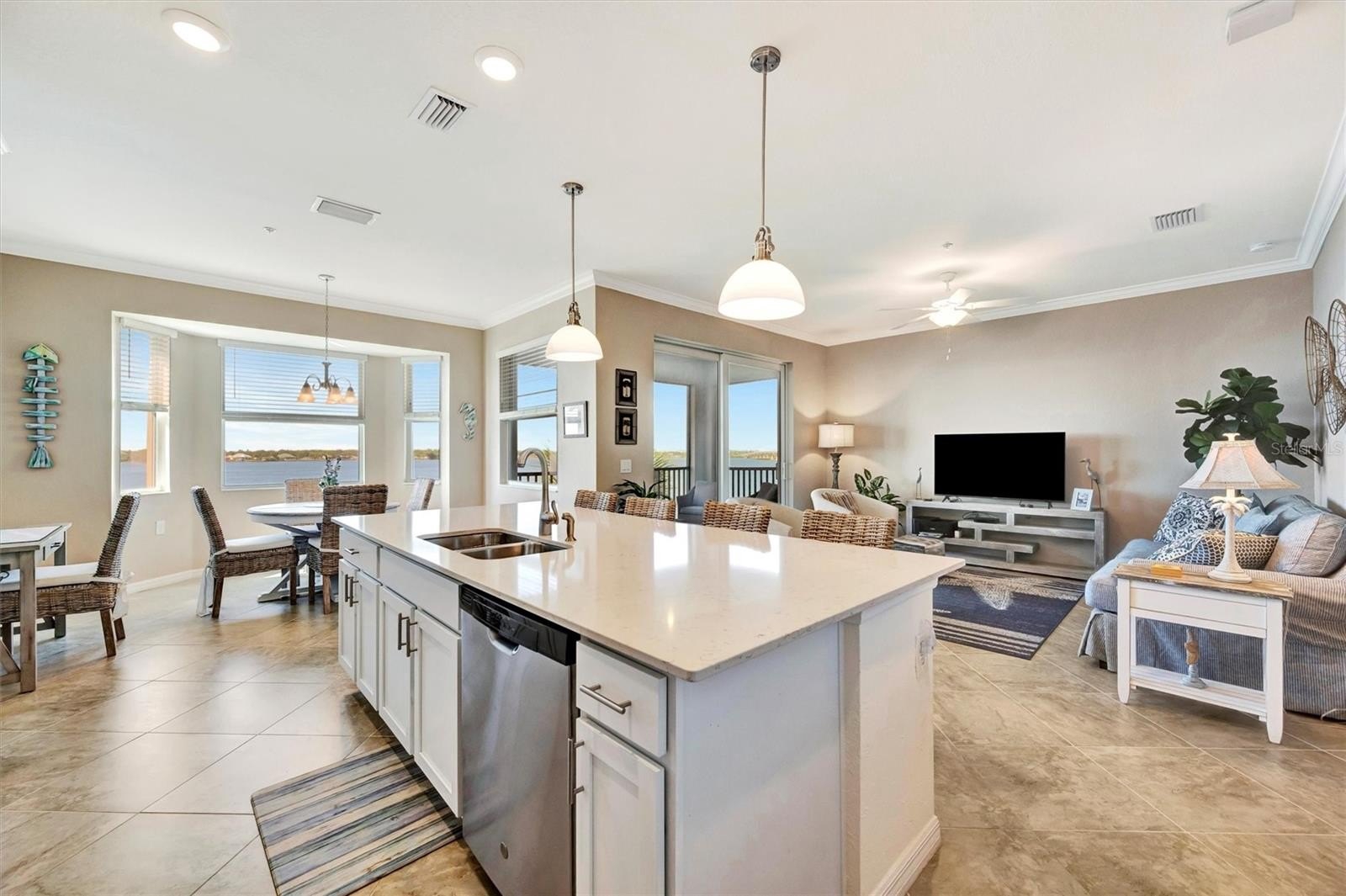 Enjoy nightly sunsets, watch boats drift by, and spot dolphins swimming—all from your window or private balcony. Tidewater Preserve is one of Bradenton’s most sought-after riverfront boating communities along the scenic Manatee River! This 4th-floor, fully furnished 2-bedroom, 2-bath penthouse condo—accessible by elevator or stairs—features hurricane impact windows and offers breathtaking panoramic water views. The kitchen showcases quartz countertops, stainless steel appliances, and ample cabinet space. The primary suite includes a walk-in closet, wall-mounted TV, and an en-suite bath. Tile flooring flows through the kitchen, living, and dining areas, with plush carpet in the bedrooms for added comfort. Additional conveniences include central A/C, an in-unit washer and dryer, a covered parking space, and a private storage unit—where beach chairs, an umbrella, and a cooler are ready and waiting for your next waterfront adventure. Experience resort-style living with amenities that include a marina, three sparkling pools, two fitness centers, a clubhouse, tennis courts, a dog park, and scenic riverfront walking trails. Launch a kayak directly into the river or explore the option to secure a boat slip at the marina. Tidewater Preserve is a 24-hour guard-gated community, providing peace of mind and a true lock-and-leave lifestyle.