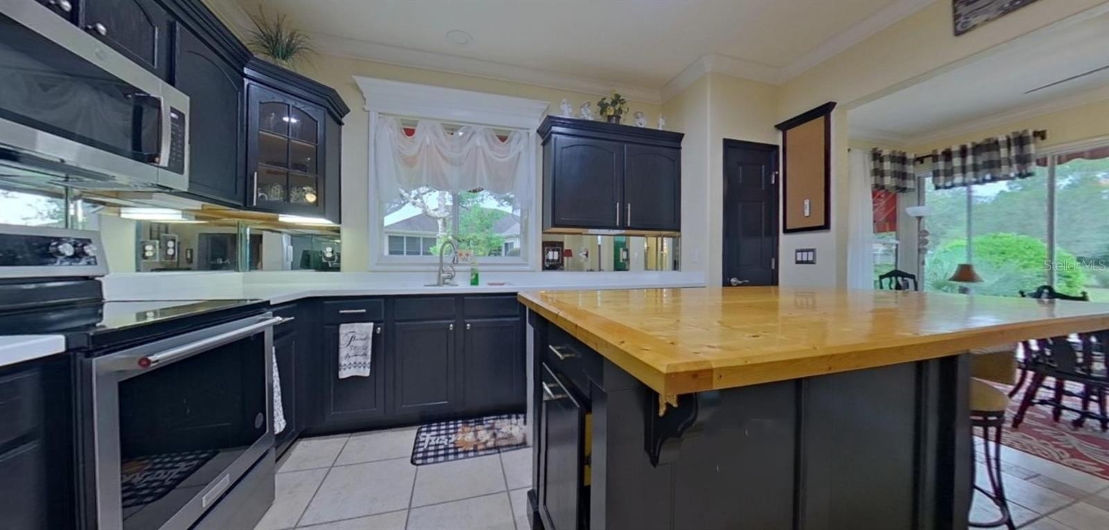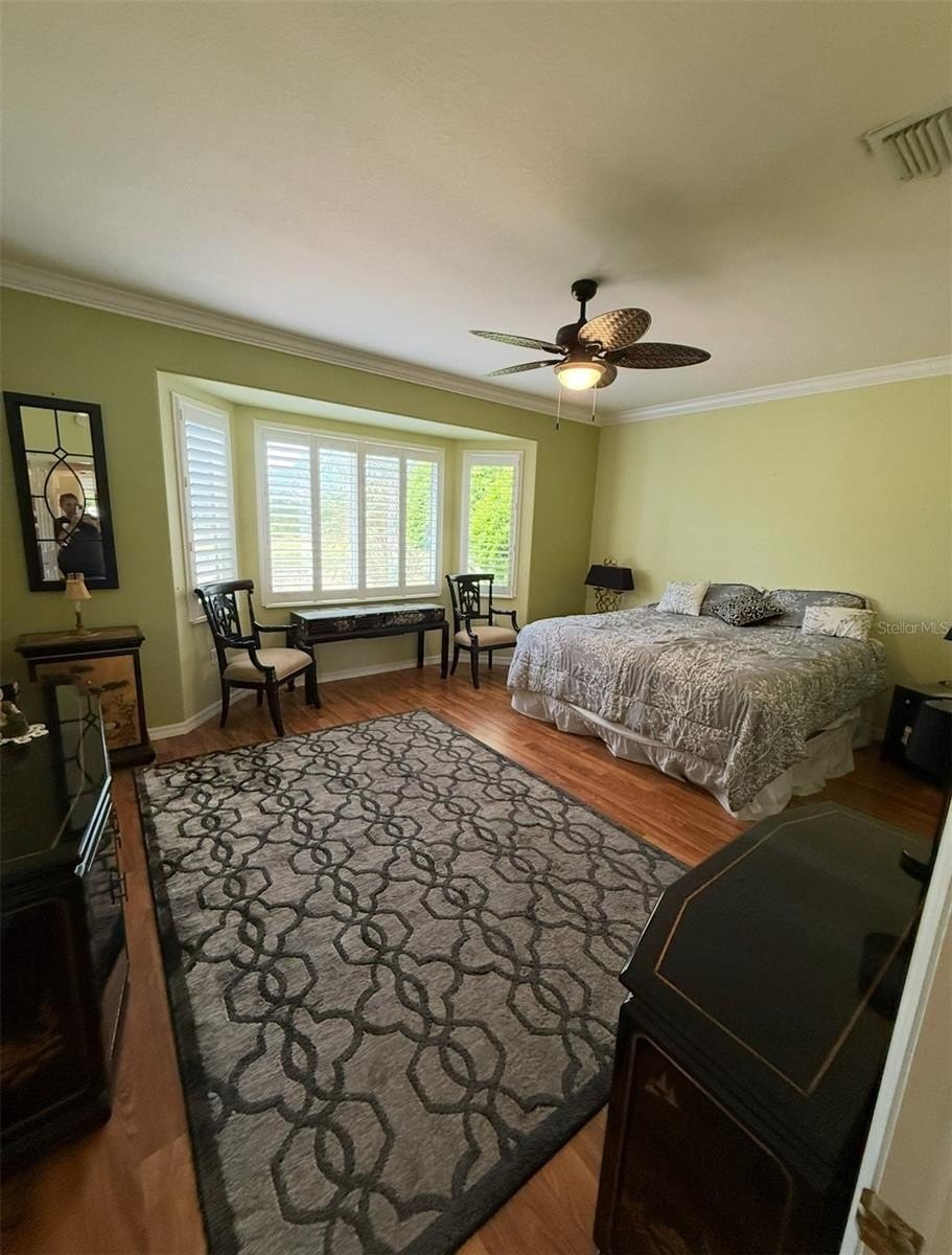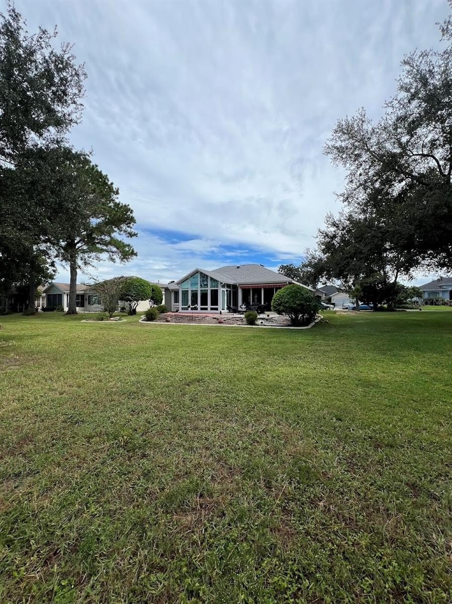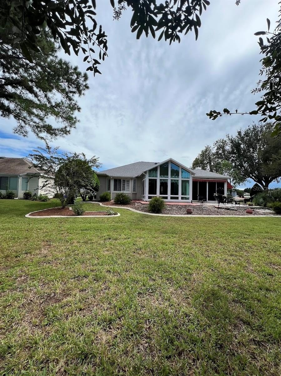 One or more photo(s) has been virtually staged. This SAN MATEO home in the gated, guarded active adult community offers 2 bedrooms and 2 baths, a two-car garage, and an open floor plan. Crown molding runs throughout the home. The living room features tile flooring, a ceiling fan, and sliding doors to the sunroom, which was added in 2016 and includes a portable AC with views of lush green space. The kitchen is bright and functional, with crown molding, a ceiling fan, a solar tube added in 2017, a custom island, stainless steel appliances including a new refrigerator, and ample bar seating. The primary bathroom features crown molding, dual vanities at varying heights, a solar tube, safety grab bars, and abundant mirrors. The secondary bath includes a ceiling fan, medicine cabinet, and shower/tub combination. The second bedroom offers a Murphy bed, built-in mirrored closet, crown molding, ceiling fan, and natural light. The backyard is private with pavers highlighting the sunroom addition and a retractable awning for shade. The front porch and entryway provide a welcoming space for outdoor seating. Roof replaced in 2023.