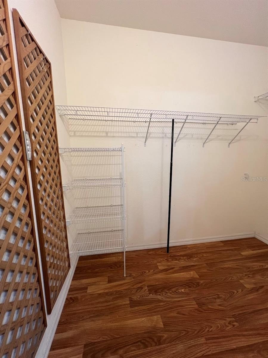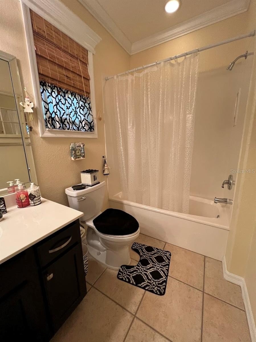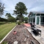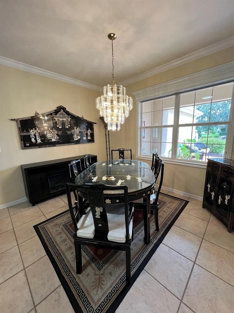 One or more photo(s) has been virtually staged. This SAN MATEO home in the gated, guarded active adult community offers 2 bedrooms and 2 baths, a two-car garage, and an open floor plan. Crown molding runs throughout the home. The living room features tile flooring, a ceiling fan, and sliding doors to the sunroom, which was added in 2016 and includes a portable AC with views of lush green space. The kitchen is bright and functional, with crown molding, a ceiling fan, a solar tube added in 2017, a custom island, stainless steel appliances including a new refrigerator, and ample bar seating. The primary bathroom features crown molding, dual vanities at varying heights, a solar tube, safety grab bars, and abundant mirrors. The secondary bath includes a ceiling fan, medicine cabinet, and shower/tub combination. The second bedroom offers a Murphy bed, built-in mirrored closet, crown molding, ceiling fan, and natural light. The backyard is private with pavers highlighting the sunroom addition and a retractable awning for shade. The front porch and entryway provide a welcoming space for outdoor seating. Roof replaced in 2023.