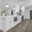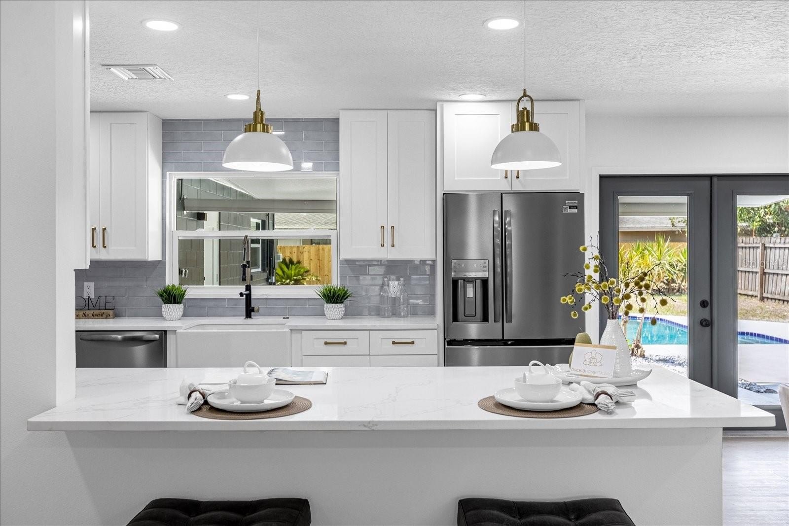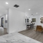 At the heart is a kitchen designed for both show and function. Calcutta quartz counters stretch across sleek cabinetry, anchored by a farmhouse sink, stainless steel appliances, and a peninsula that turns everyday dining into a social moment. A dedicated pantry adds the convenience every modern cook craves, keeping the space as practical as it is beautiful. The flow is seamless—living and dining areas designed for connection, all framed by recessed lighting and modern details.