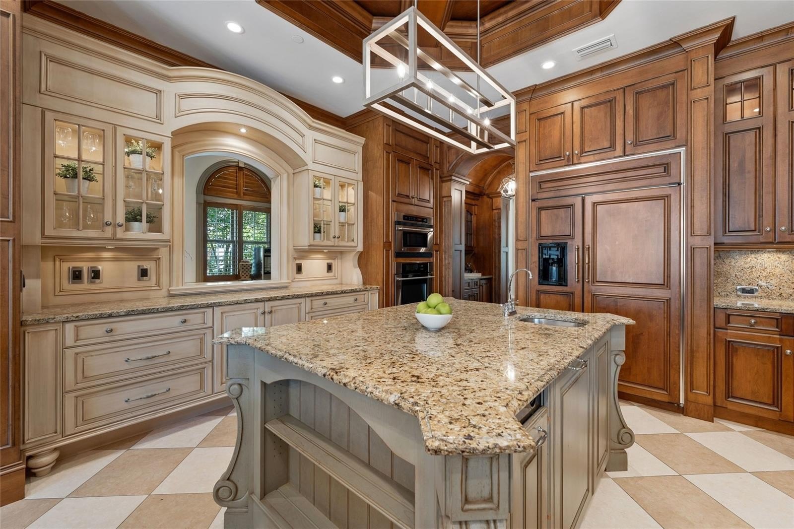 The chef’s Busby kitchen is a true centerpiece, boasting granite countertops and backsplash, dual dishwashers, a Miele built-in coffee maker, GE Monogram 6-burner dual-fuel range with double ovens, and a butler’s walk-in pantry and scullery—perfect for seamless entertaining and hidden prep. A designated wet bar with glass cabinetry, ice maker, trash compactor, beverage coolers complements the wine cellar, making this home ideal for the refined entertainer.