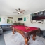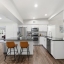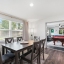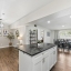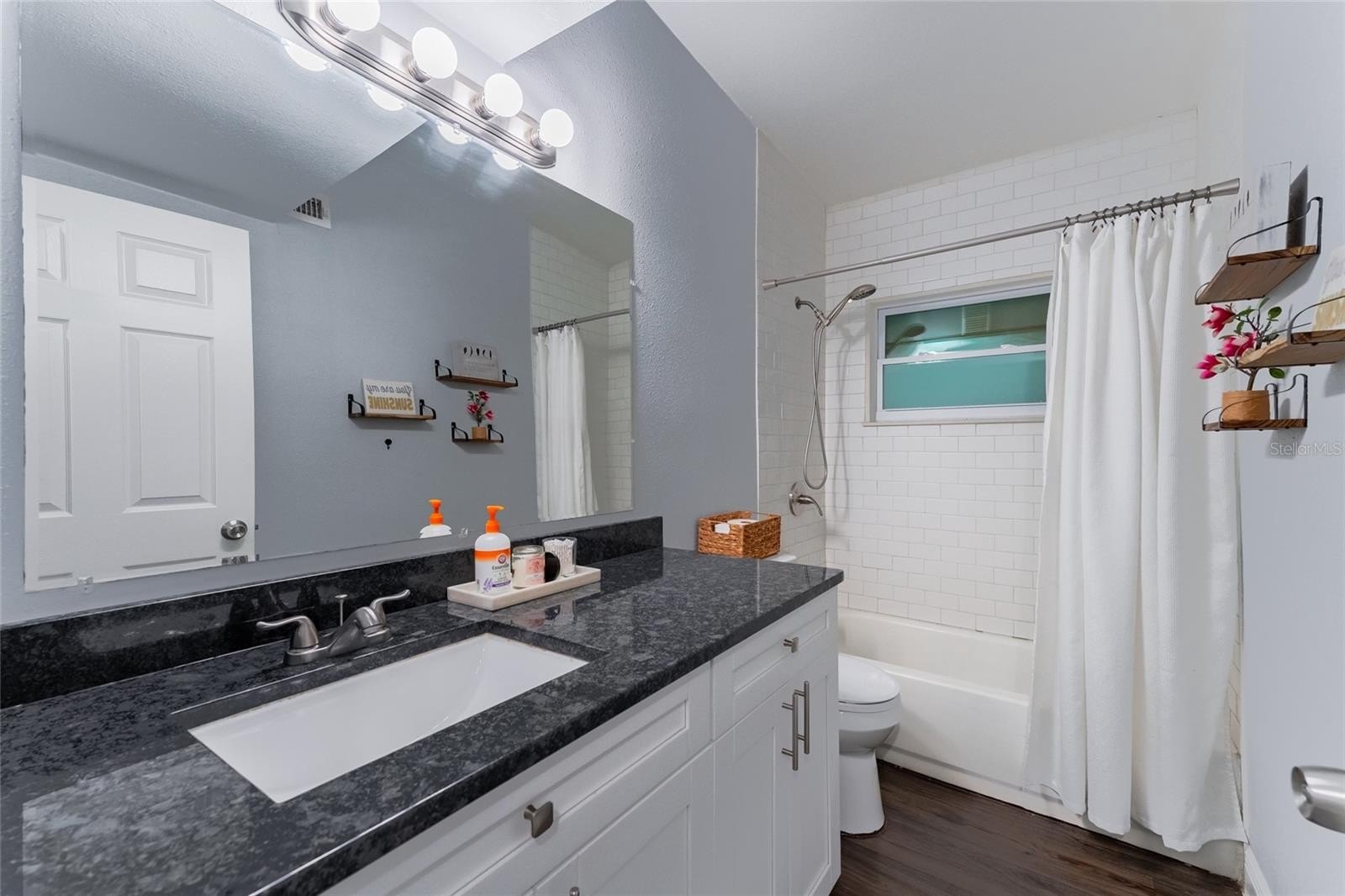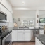The fully remodeled kitchen features granite countertops, stainless steel appliances, white shaker cabinets, and a breakfast bar that opens to the spacious living and dining areas.