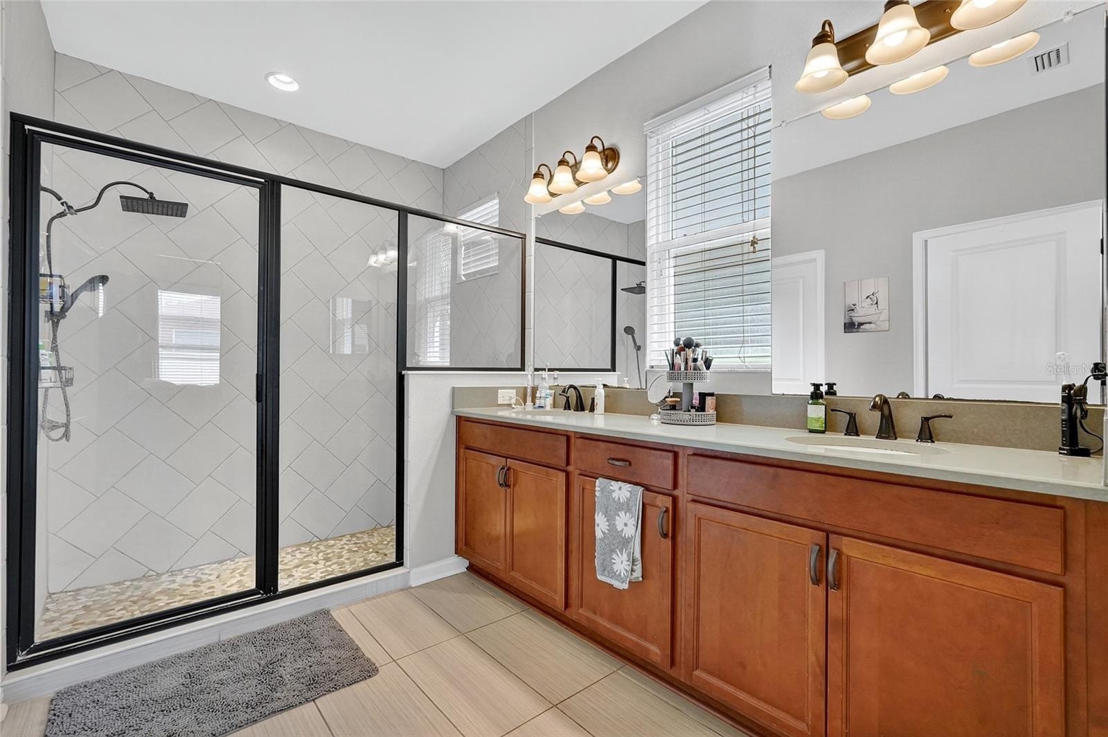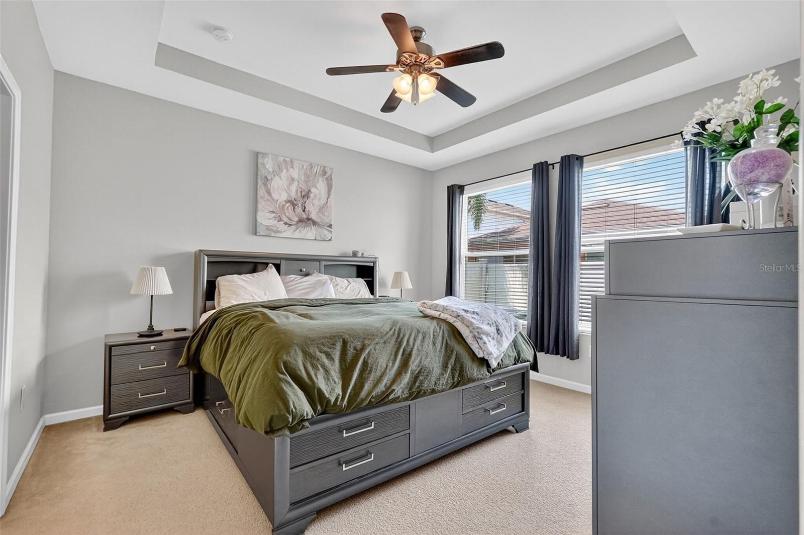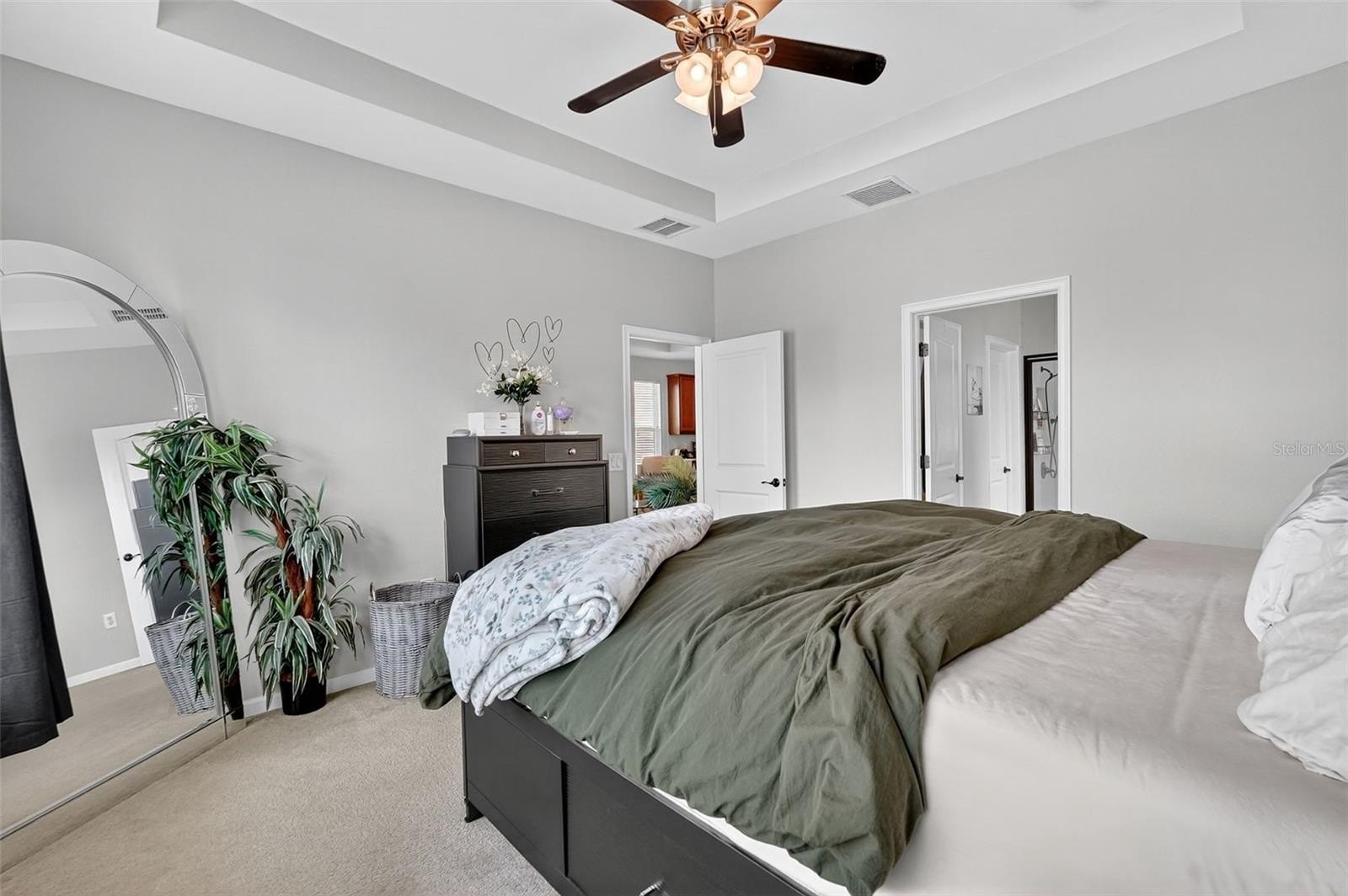 The split floor plan offers both comfort and privacy. The primary suite feels like a getaway with its tray ceiling, spa-inspired bathroom, oversized walk-in shower, and a closet designed to keep life organized. On the other side of the home, two spacious bedrooms share a full bathroom, making it perfect for family, guests, or even a home office.