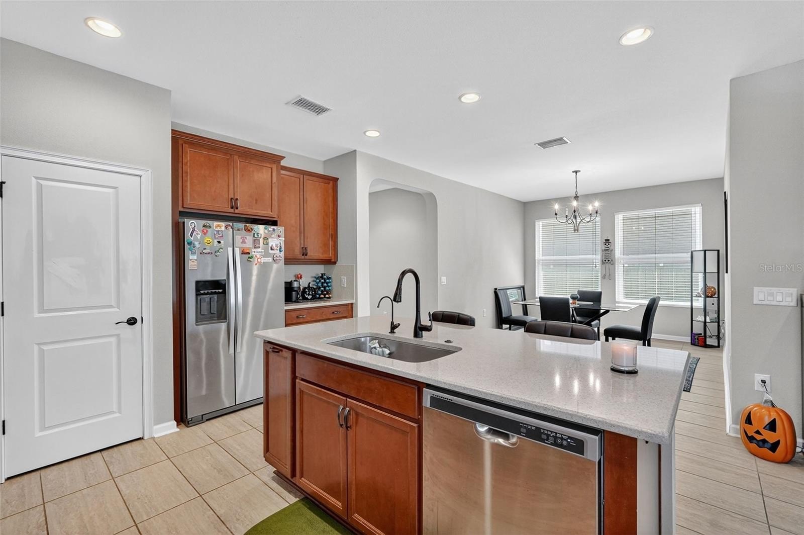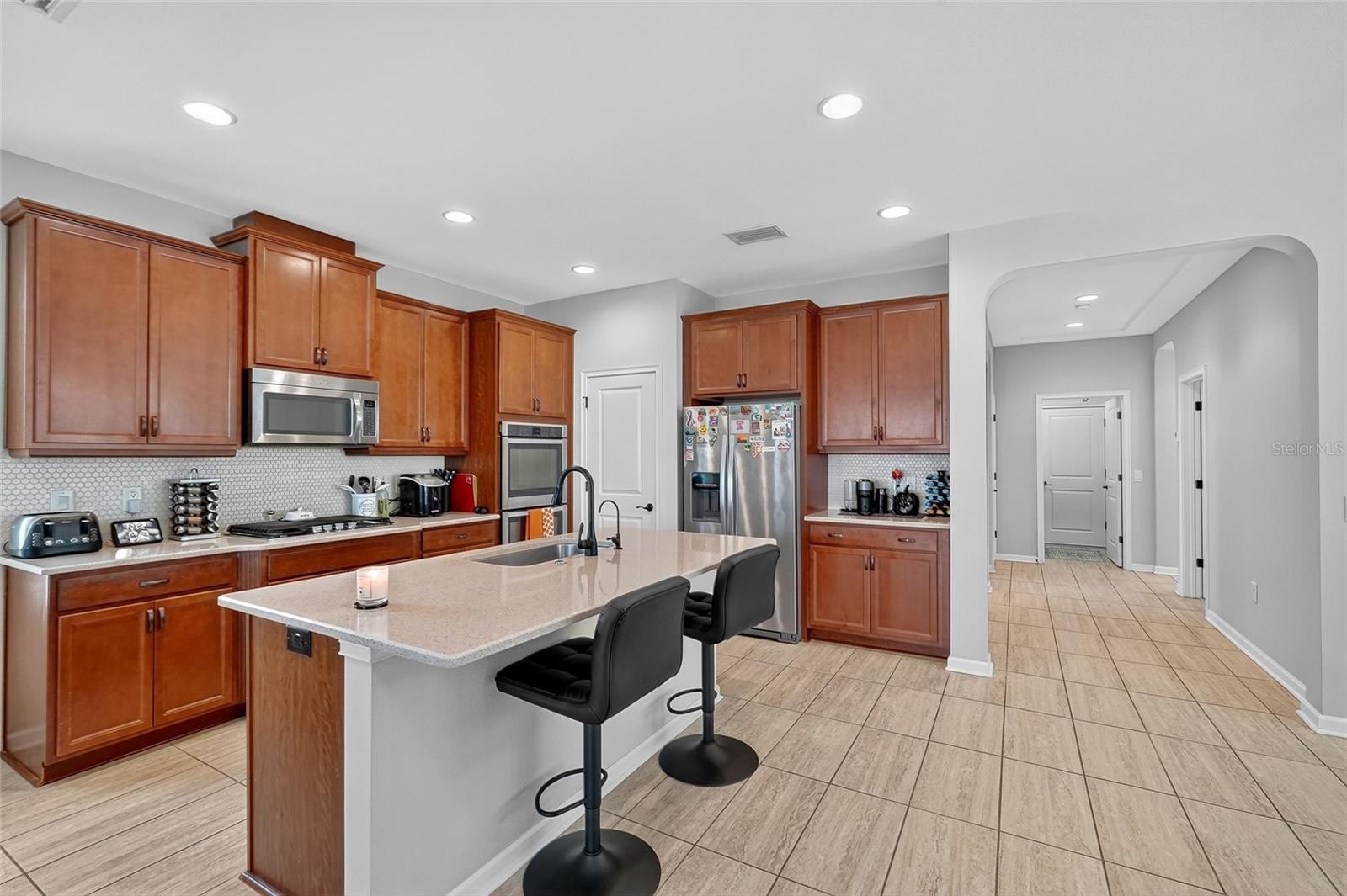 As you walk through the door, the hidden foyer creates a sense of privacy, opening into a bright, open-concept living space. The kitchen is the heart of the home, with quartz countertops, 42-inch cabinets, a gorgeous backsplash, and stainless-steel appliances with a reverse osmosis water-softening system. Whether it’s preparing weeknight dinners or hosting friends around the central island, this space was designed to bring families and friends together.