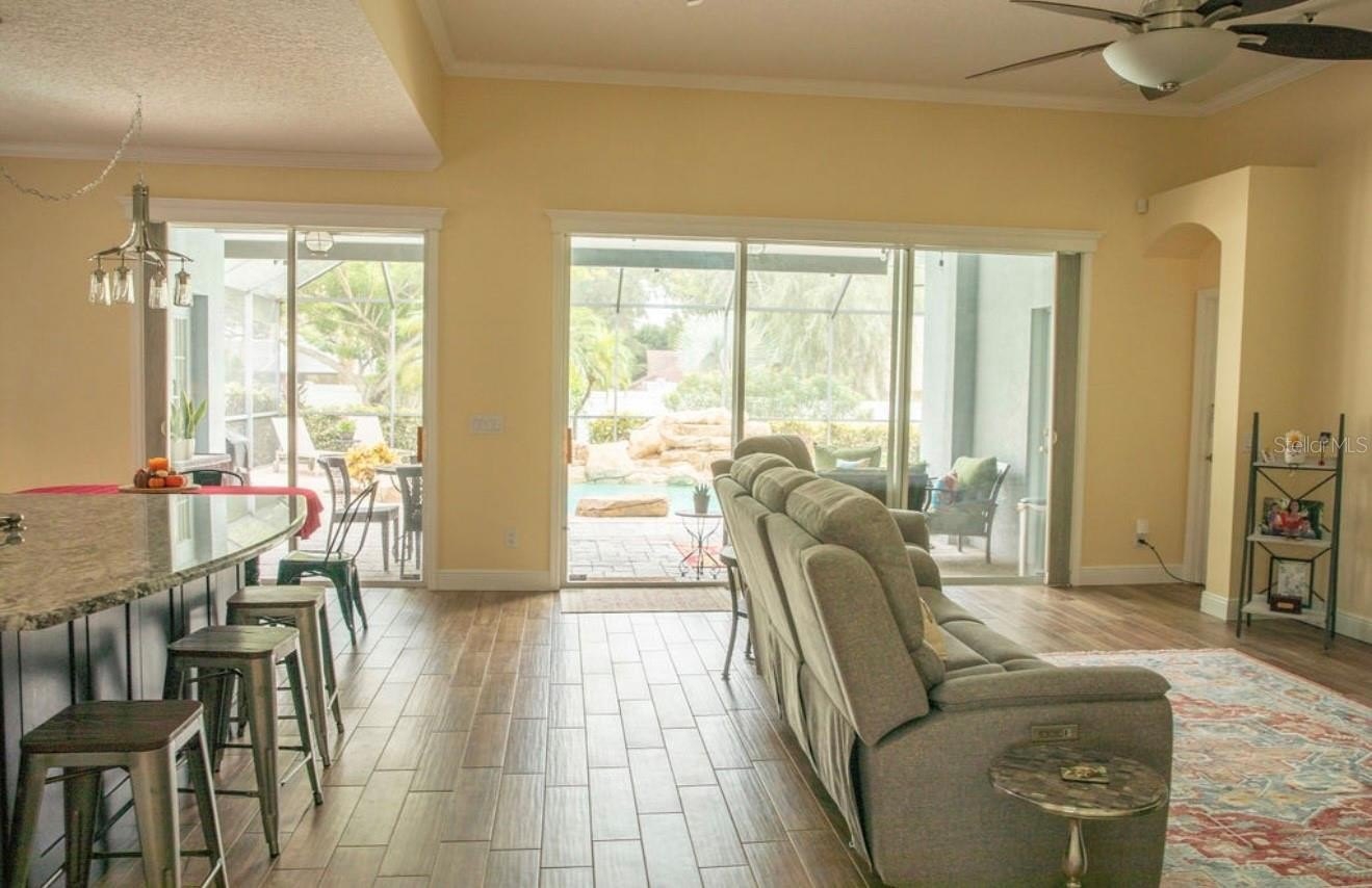 PRICE REDUCED!!!****ATTENTION BUYERS!!!!****Our preferred Lender is offering up to 1% closing cost assistance, a free appraisal up to $900 and rates from 5.8% to 5.99% for well qualified buyers. THIS BEAUTIFUL POOL HOME is conveniently located near "A" Rated Bloomingdale High School and features 3 bedrooms, 3 full bathrooms, a den, dining room, great room, kitchen combination with separate eating area and seating at the island. The two secondary bedrooms have been updated with hurricane windows; a full bathroom is on one side of the home and the primary bedroom and sitting area with cozy stone fireplace and custom bookshelves on the other. The master ensuite features double sinks, a stand-up shower, sunken tub, linen closet and private water closet. A generously sized closet completes this spa like space. The kitchen, great room and primary bedroom all open up to a gorgeous pool area with rock formation water feature and private fenced in backyard. The backyard green area has plenty of space for a playset, outdoor toys or room for pets to safely roam. There is also a full bathroom conveniently located off of the enclosed patio and pool area. This one owner home has been lovingly cared for with new paint, a new AC unit in 2020. new porcelain tile flooring throughout and carpeting in the third bedroom. The full hall bathroom was completely renovated in 2022. This home boasts upgrades such as beautiful crown molding throughout, kitchen tile backsplash with undercabinet, lighting, gorgeous granite countertops, plantation shutters, wide baseboards, updated kitchen island with ample storage, new dishwasher, front hurricane windows and finished knee walls. The 3-car garage features organizational systems perfect for keeping all of your outdoor gear This home has amazing curb appeal with mature and very lush landscaping including palm trees in the pool area and backyard!