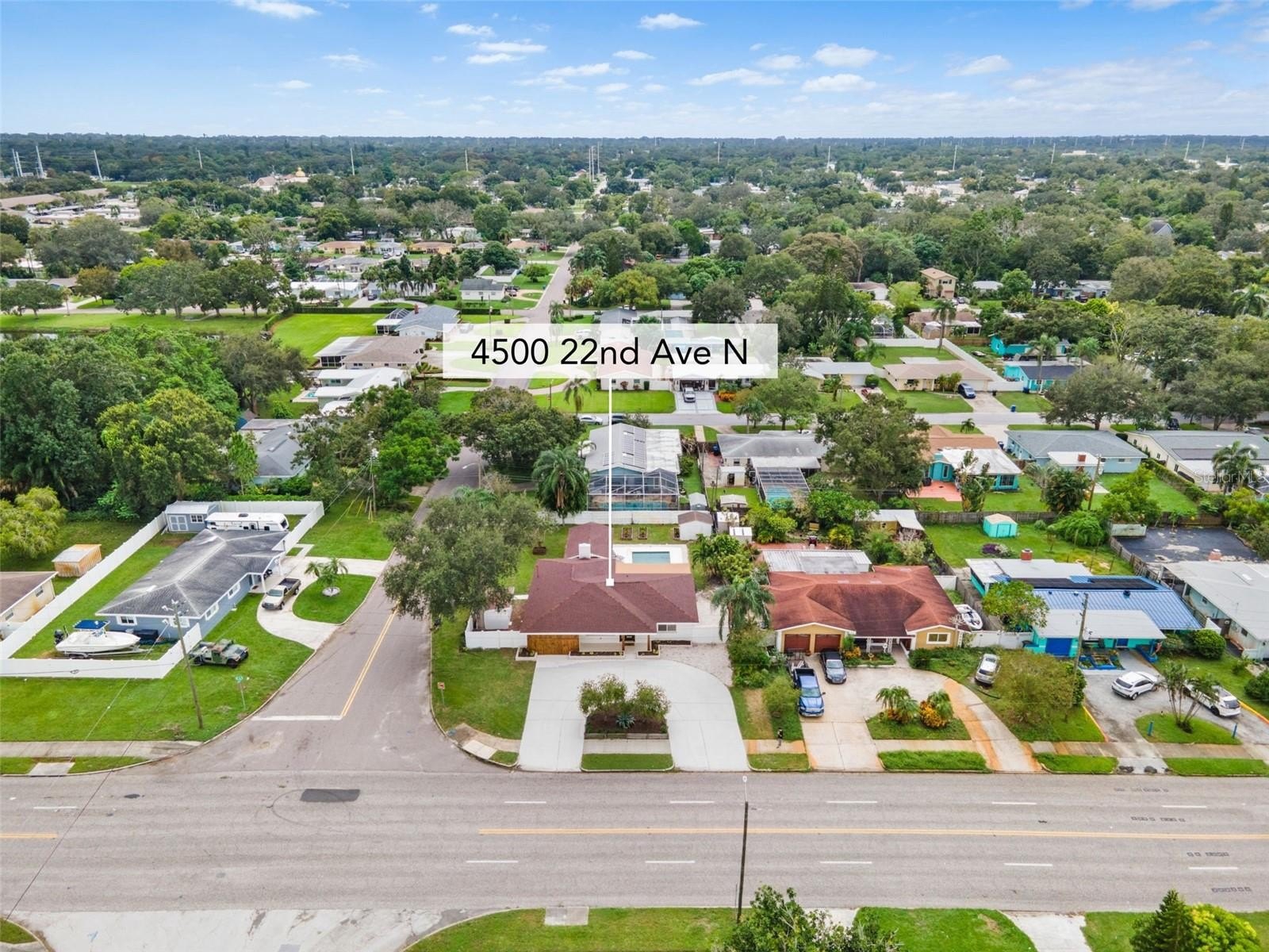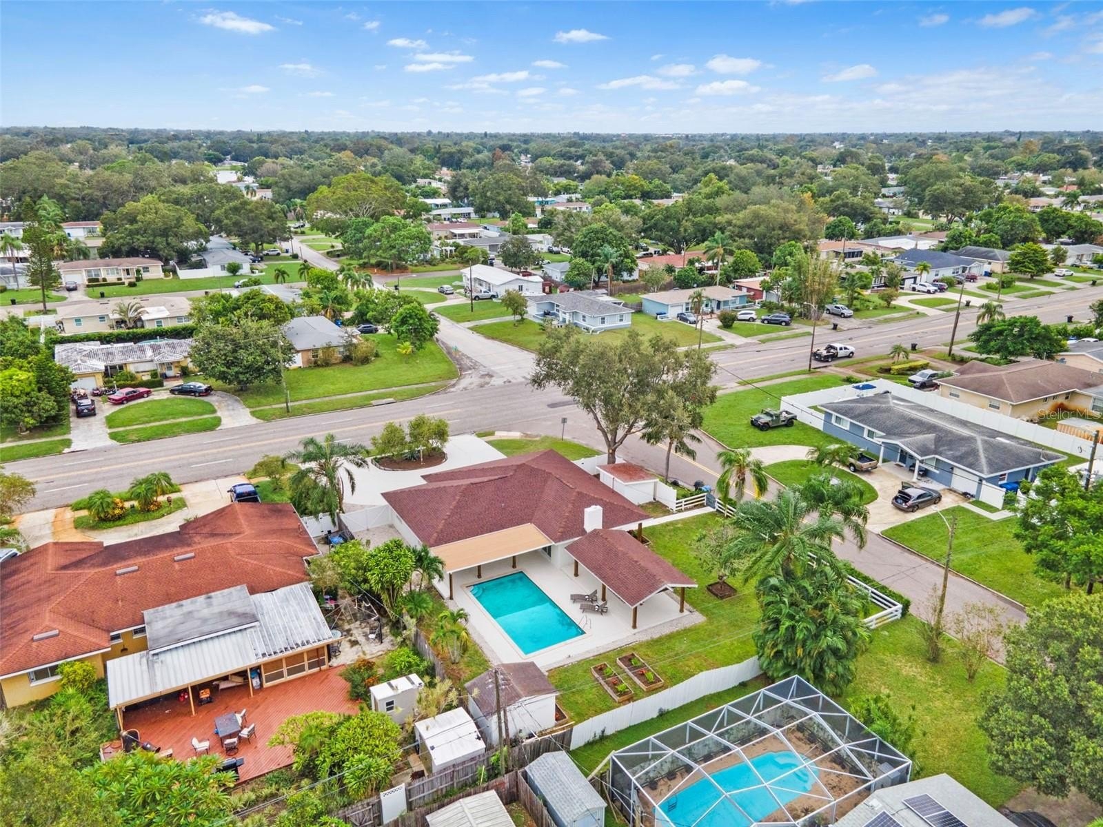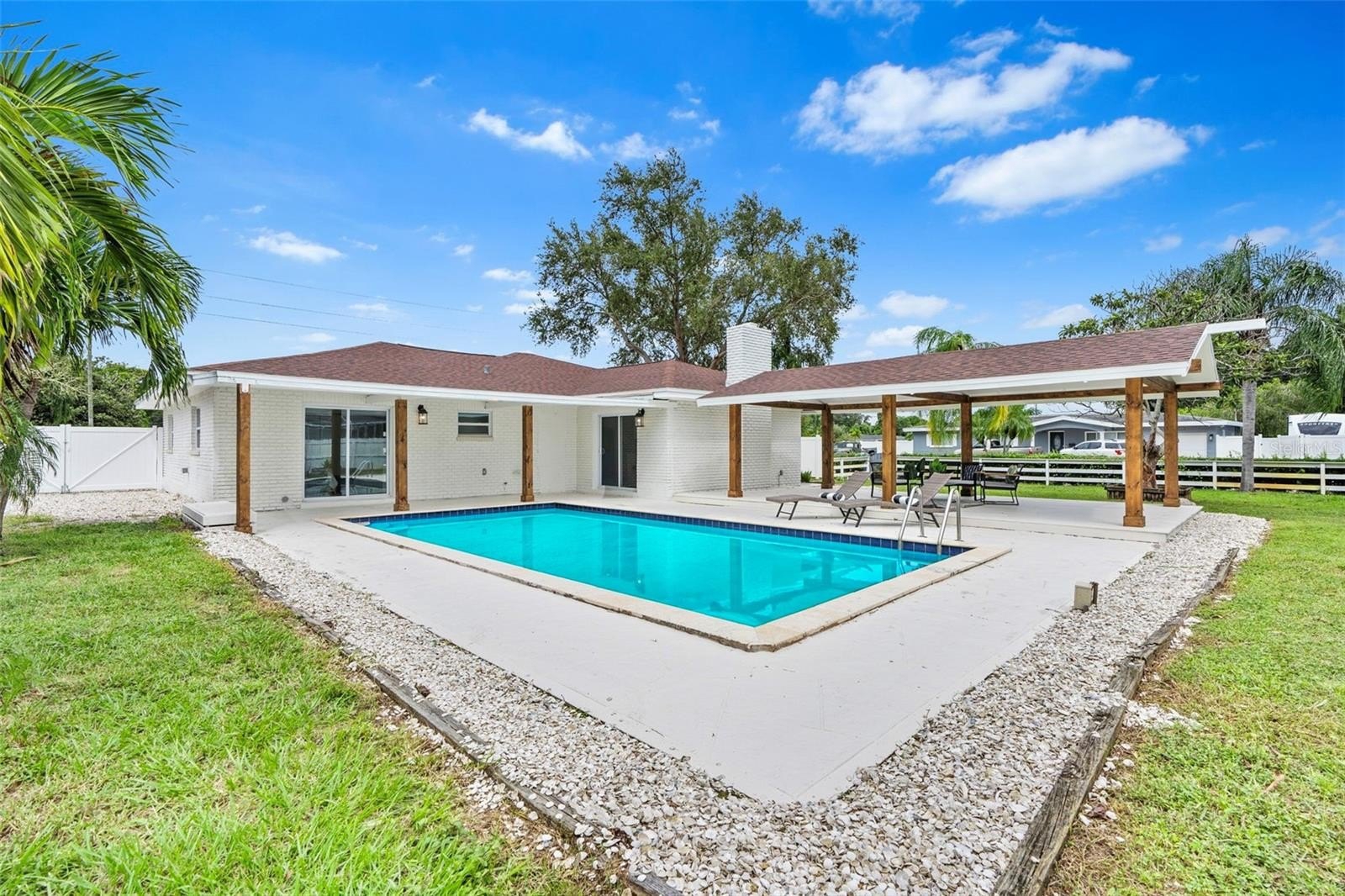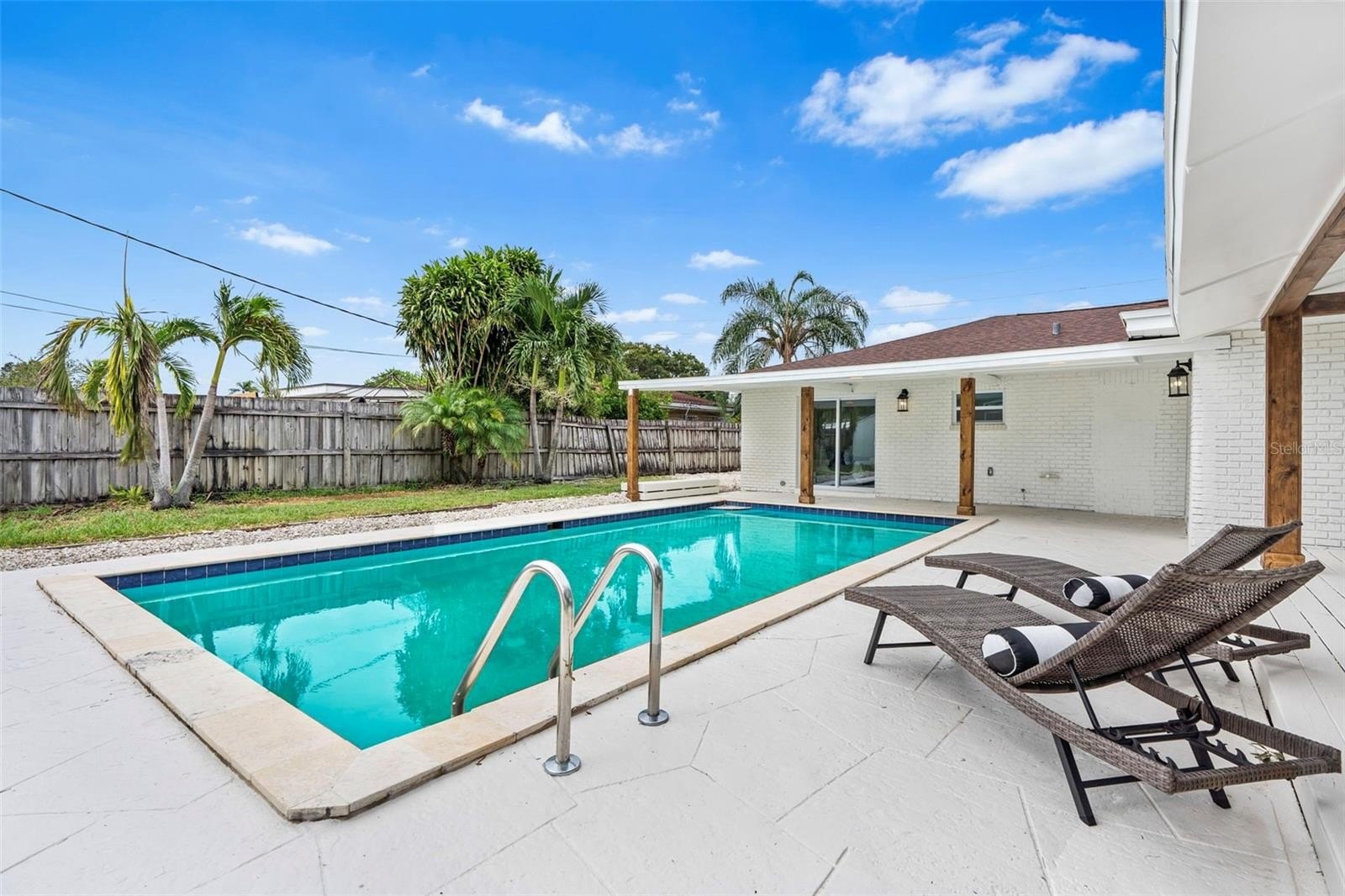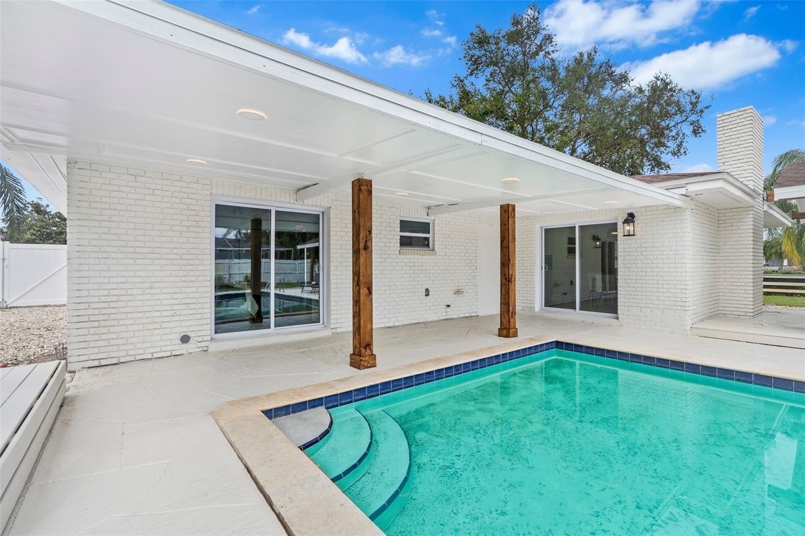 Turnkey St. Petersburg pool home with fresh curb appeal, new roof, and fenced yard. This 3BR/2BA features an open, light-filled layout with recessed night-light ceiling LEDs and a designer kitchen with modern cabinetry, stainless appliances, wine cooler, and Calacatta quartz counters/backsplash with a waterfall edge. Both baths are tastefully updated. Outdoors, enjoy a private rectangular pool, large gazebo for entertaining, two storage sheds, and dedicated boat/RV parking beside the home. U-shaped driveway provides ample off-street parking. Fresh exterior paint and lush landscaping complete the look. Central location with convenient access to shopping, dining, parks, and major routes. Stylish, low-maintenance living ready for immediate enjoyment.