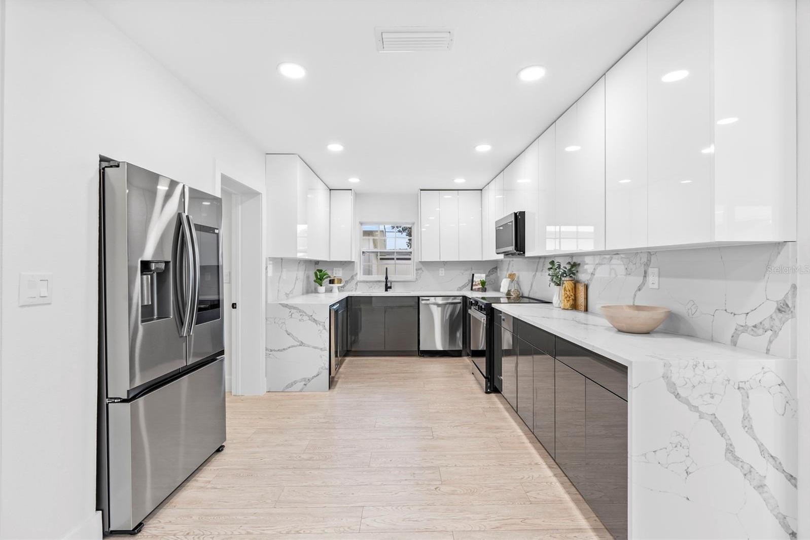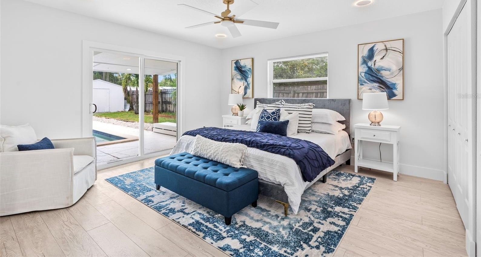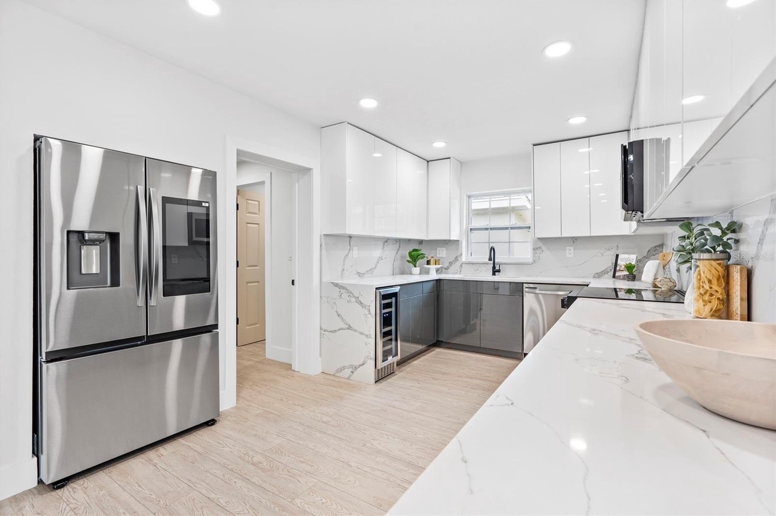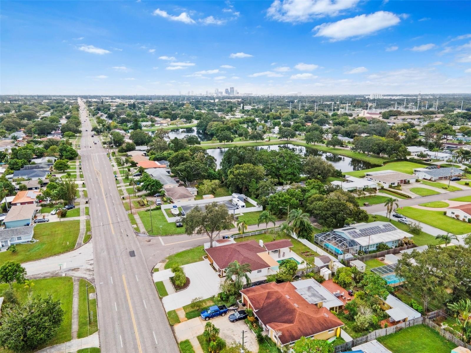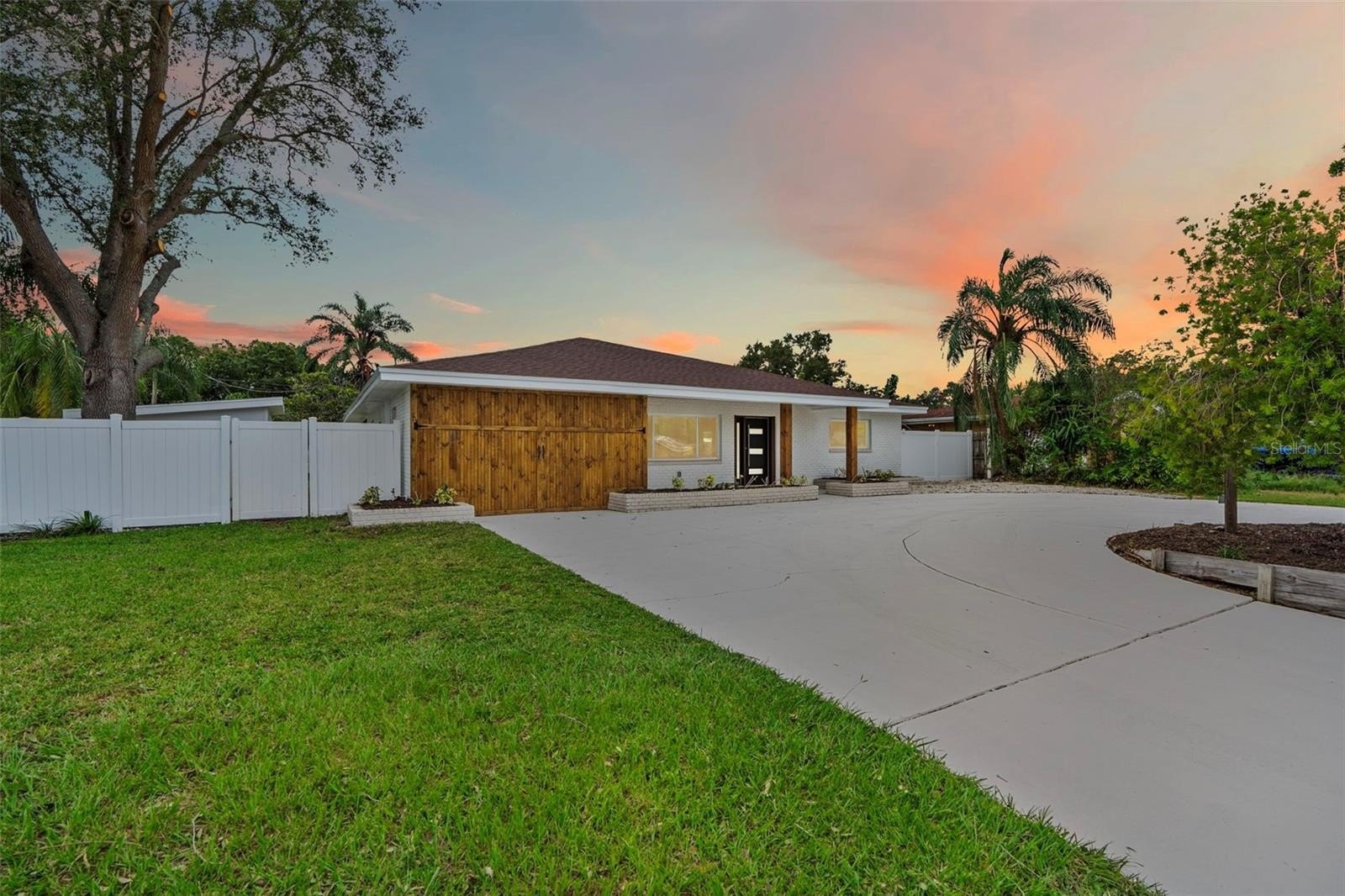 Turnkey St. Petersburg pool home with fresh curb appeal, new roof, and fenced yard. This 3BR/2BA features an open, light-filled layout with recessed night-light ceiling LEDs and a designer kitchen with modern cabinetry, stainless appliances, wine cooler, and Calacatta quartz counters/backsplash with a waterfall edge. Both baths are tastefully updated. Outdoors, enjoy a private rectangular pool, large gazebo for entertaining, two storage sheds, and dedicated boat/RV parking beside the home. U-shaped driveway provides ample off-street parking. Fresh exterior paint and lush landscaping complete the look. Central location with convenient access to shopping, dining, parks, and major routes. Stylish, low-maintenance living ready for immediate enjoyment.