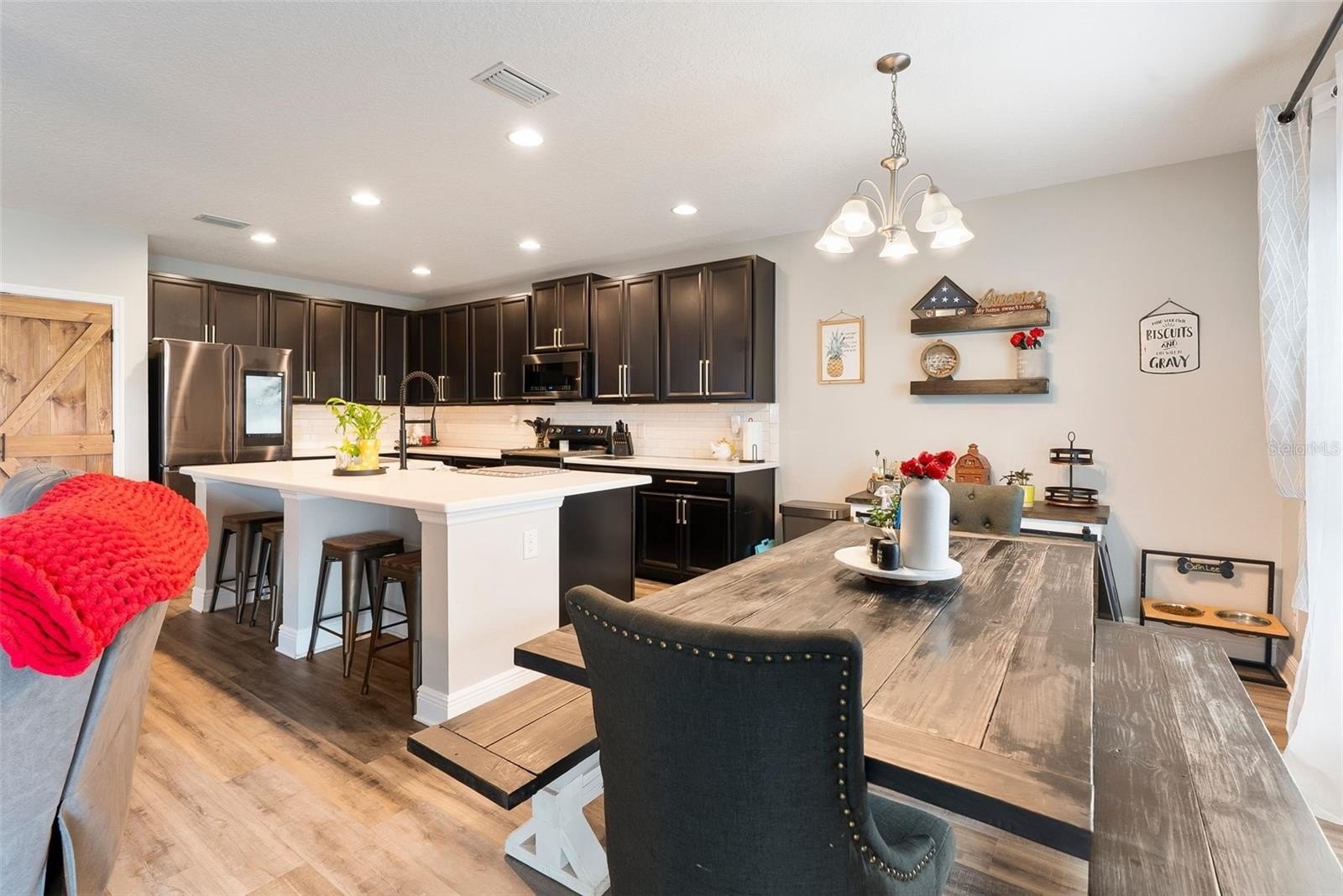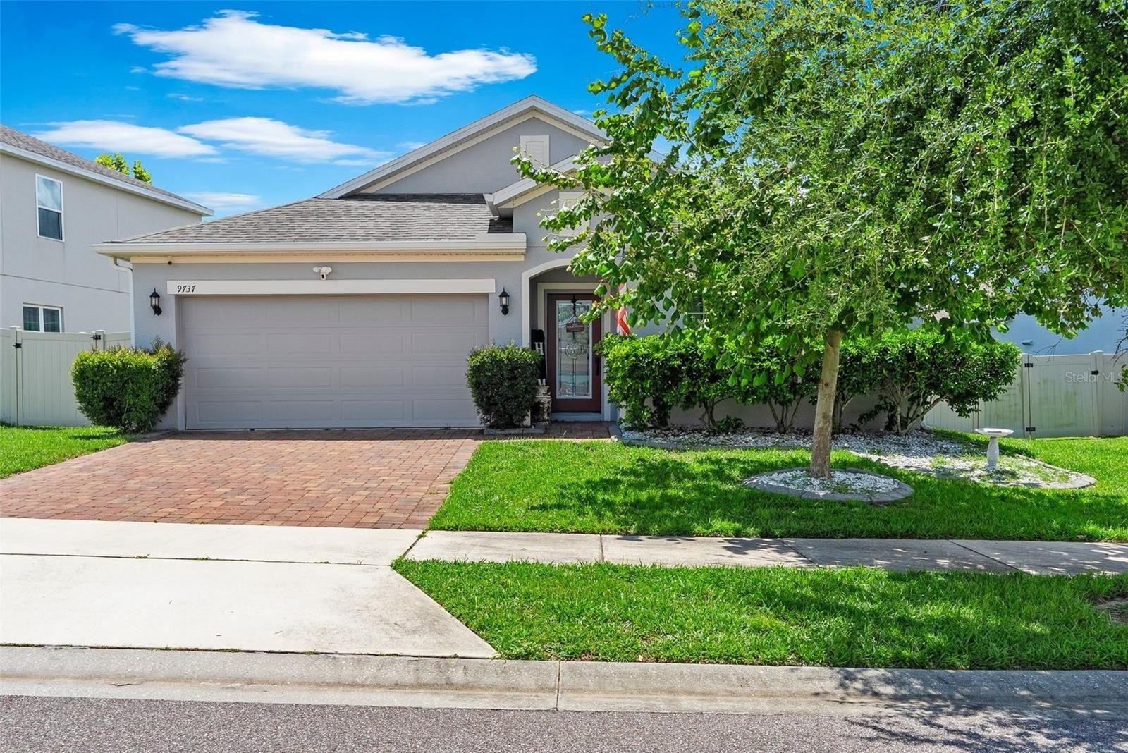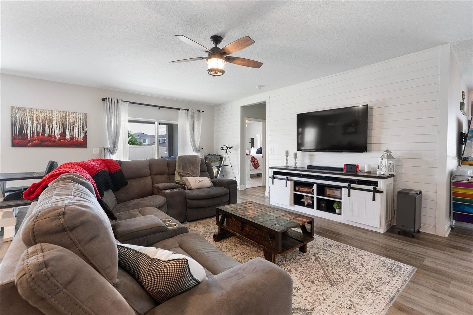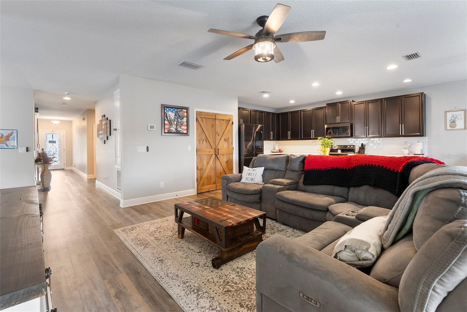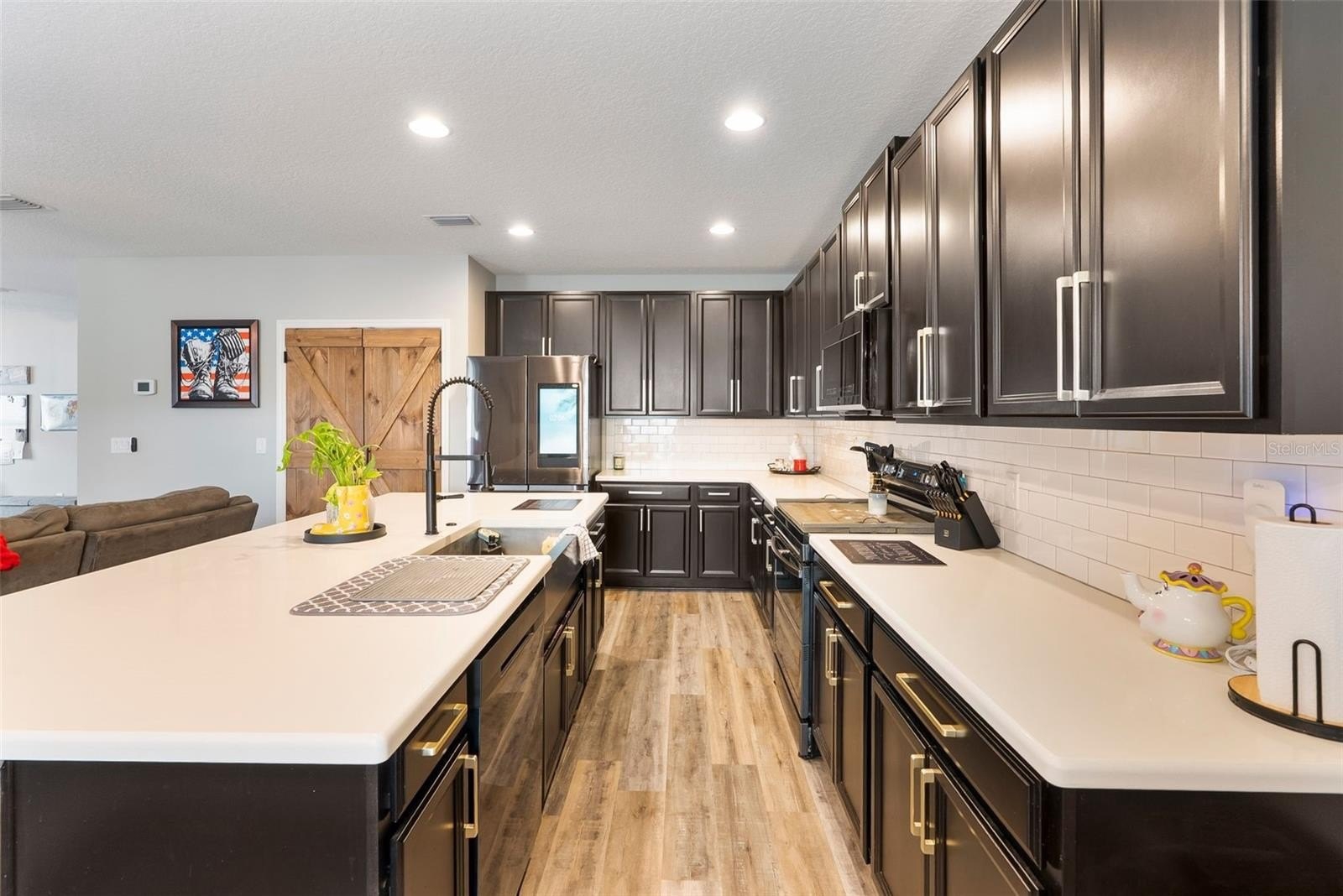Back on the Market. Welcome to this stunning Kensington Flex model home, located in the highly sought-after community of Cypress Oaks—just 6 minutes from charming Downtown Clermont and 40 minutes from Disney! This meticulously maintained 4-bedroom, 2-bathroom home sits on an oversized lot backing up to recreational space, offering both privacy and convenience. Step inside to find luxury vinyl flooring throughout all common areas, upgraded 5.25” baseboards, and an open-concept design with an expanded kitchen island—perfect for entertaining. The eat-in kitchen boasts quartz countertops, upgraded 2023 stainless steel appliances (including refrigerator, dishwasher, washer & dryer), a stainless-steel apron farmhouse sink, and custom cabinetry, including a custom pantry and laundry room with ample storage. Enjoy versatile living with a spacious flex room featuring a built-in bench and bookshelf, ideal for an office, playroom, or second living space. The family room showcases a beautiful shiplap accent wall that adds character and warmth. The primary suite offers a serene retreat with a walk-in closet, quartz countertops, and a luxurious en-suite bathroom complete with a digital and rain shower system. Three additional bedrooms feature custom closets for organized living. Step outside to the covered lanai and enjoy the fully fenced backyard, complete with three gated entries (two in front, one in back), rain gutters and downspouts, and ample room for outdoor fun. Additional features include,