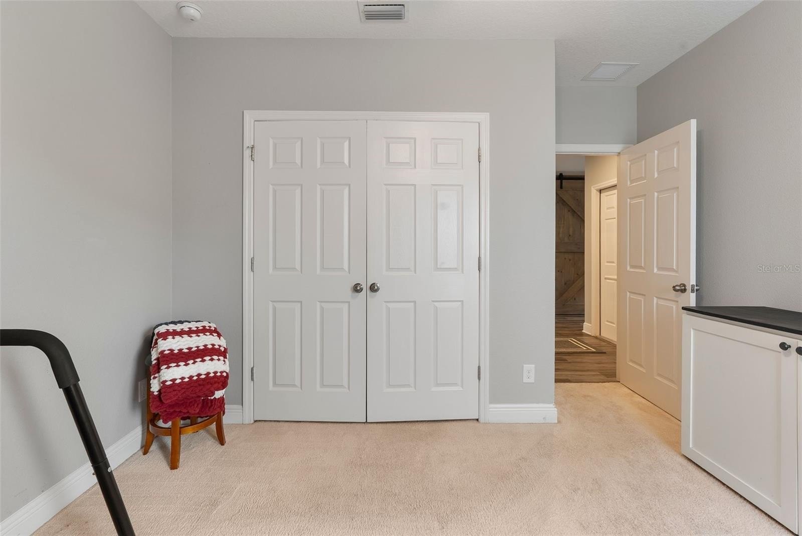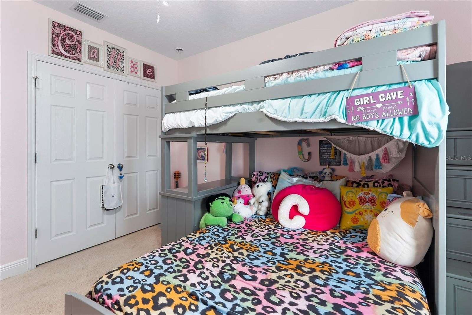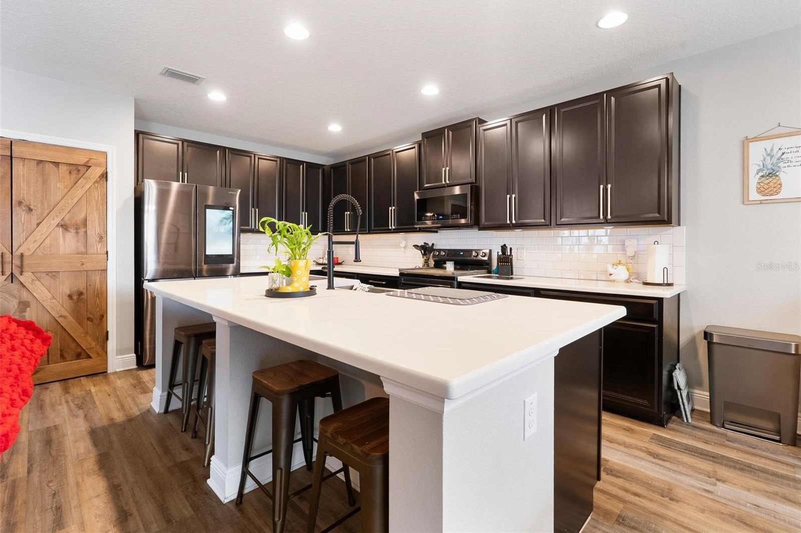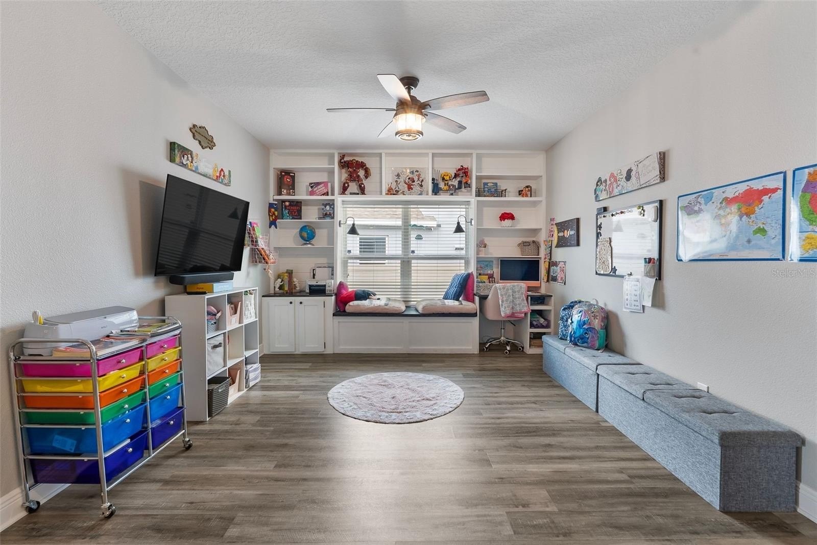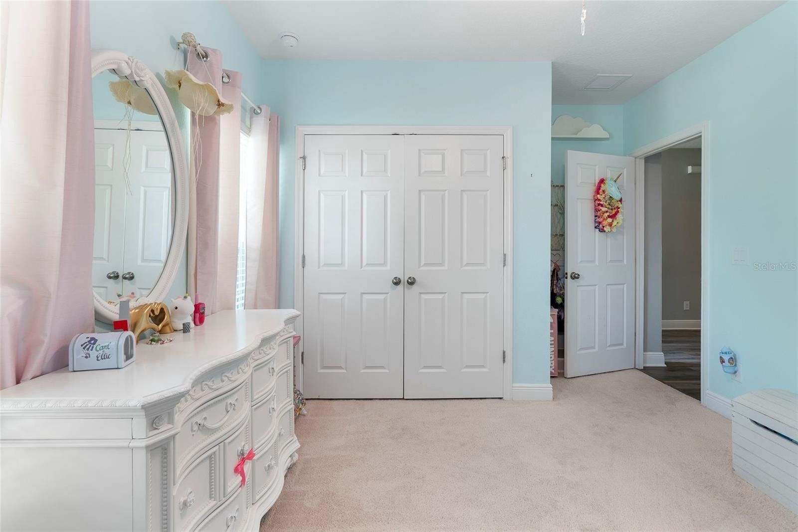 Back on the Market. Welcome to this stunning Kensington Flex model home, located in the highly sought-after community of Cypress Oaks—just 6 minutes from charming Downtown Clermont and 40 minutes from Disney! This meticulously maintained 4-bedroom, 2-bathroom home sits on an oversized lot backing up to recreational space, offering both privacy and convenience. Step inside to find luxury vinyl flooring throughout all common areas, upgraded 5.25” baseboards, and an open-concept design with an expanded kitchen island—perfect for entertaining. The eat-in kitchen boasts quartz countertops, upgraded 2023 stainless steel appliances (including refrigerator, dishwasher, washer & dryer), a stainless-steel apron farmhouse sink, and custom cabinetry, including a custom pantry and laundry room with ample storage. Enjoy versatile living with a spacious flex room featuring a built-in bench and bookshelf, ideal for an office, playroom, or second living space. The family room showcases a beautiful shiplap accent wall that adds character and warmth. The primary suite offers a serene retreat with a walk-in closet, quartz countertops, and a luxurious en-suite bathroom complete with a digital and rain shower system. Three additional bedrooms feature custom closets for organized living. Step outside to the covered lanai and enjoy the fully fenced backyard, complete with three gated entries (two in front, one in back), rain gutters and downspouts, and ample room for outdoor fun. Additional features include,