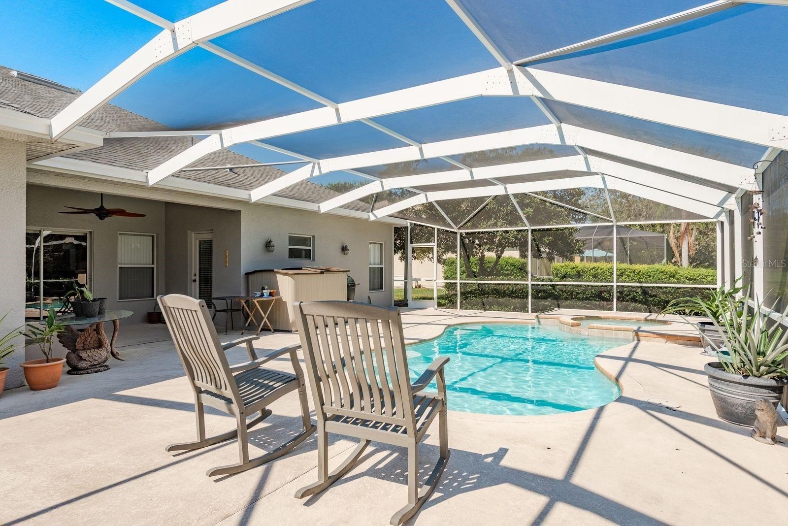 Through sliding glass doors, your private outdoor escape awaits. The screened lanai opens to a sparkling pool and a sit-in spa the perfect spot to unwind after a long day. Thoughtful design means there’s direct access from the guest bath, family room, and owner’s suite, so wet swimsuits never cross the living room floors. The owner’s retreat is a sanctuary of its own, with dual sinks, a glass shower, a garden soaking tub, and a walk-in closet you’ll love.