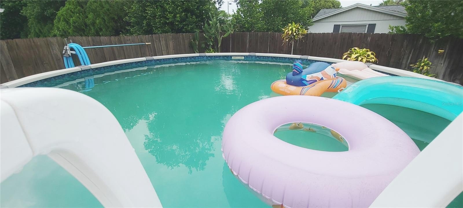 In the evening, you can gather on the lanai. As the sun begins to set, casting a warm orange glow across the sky, you can already see your future unfolding. This house is more than just three bedrooms and two baths; it is a home with a large lanai, an open patio, and an above-ground pool—a place where you could truly begin your new life.