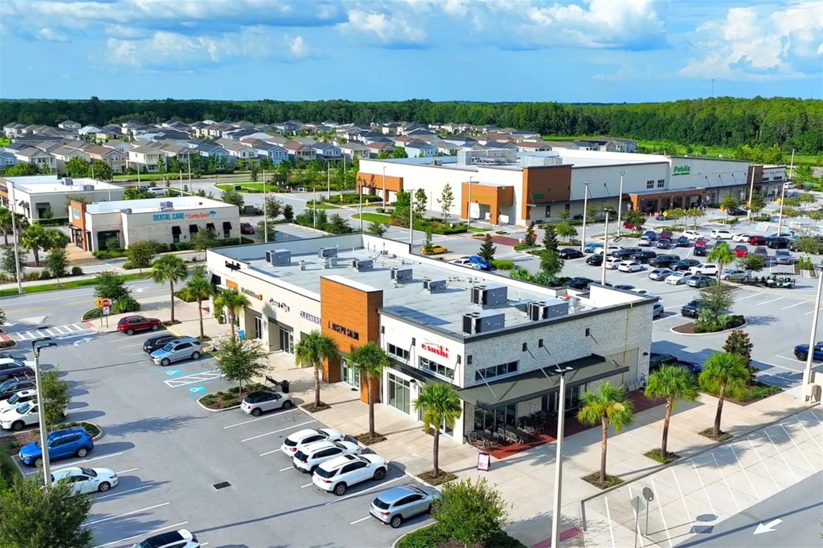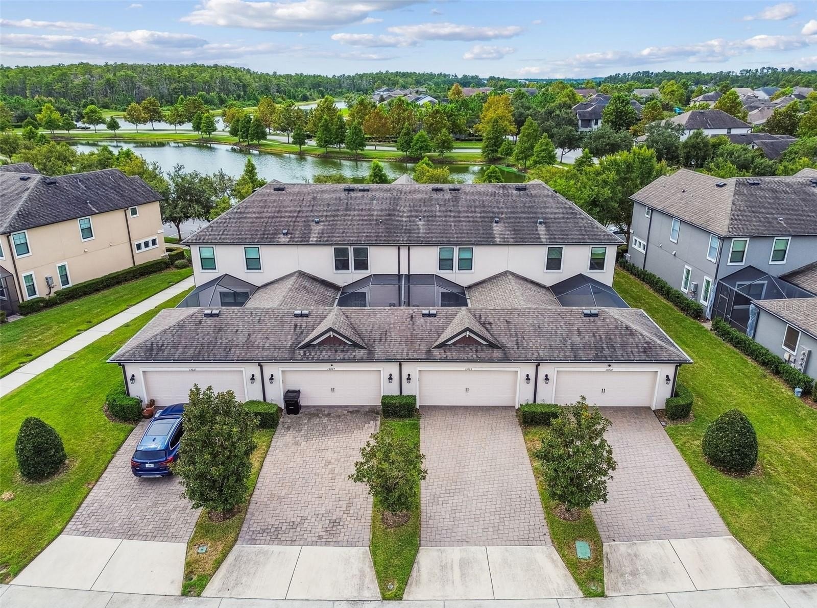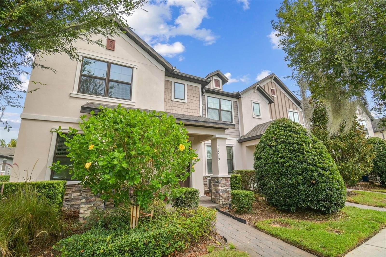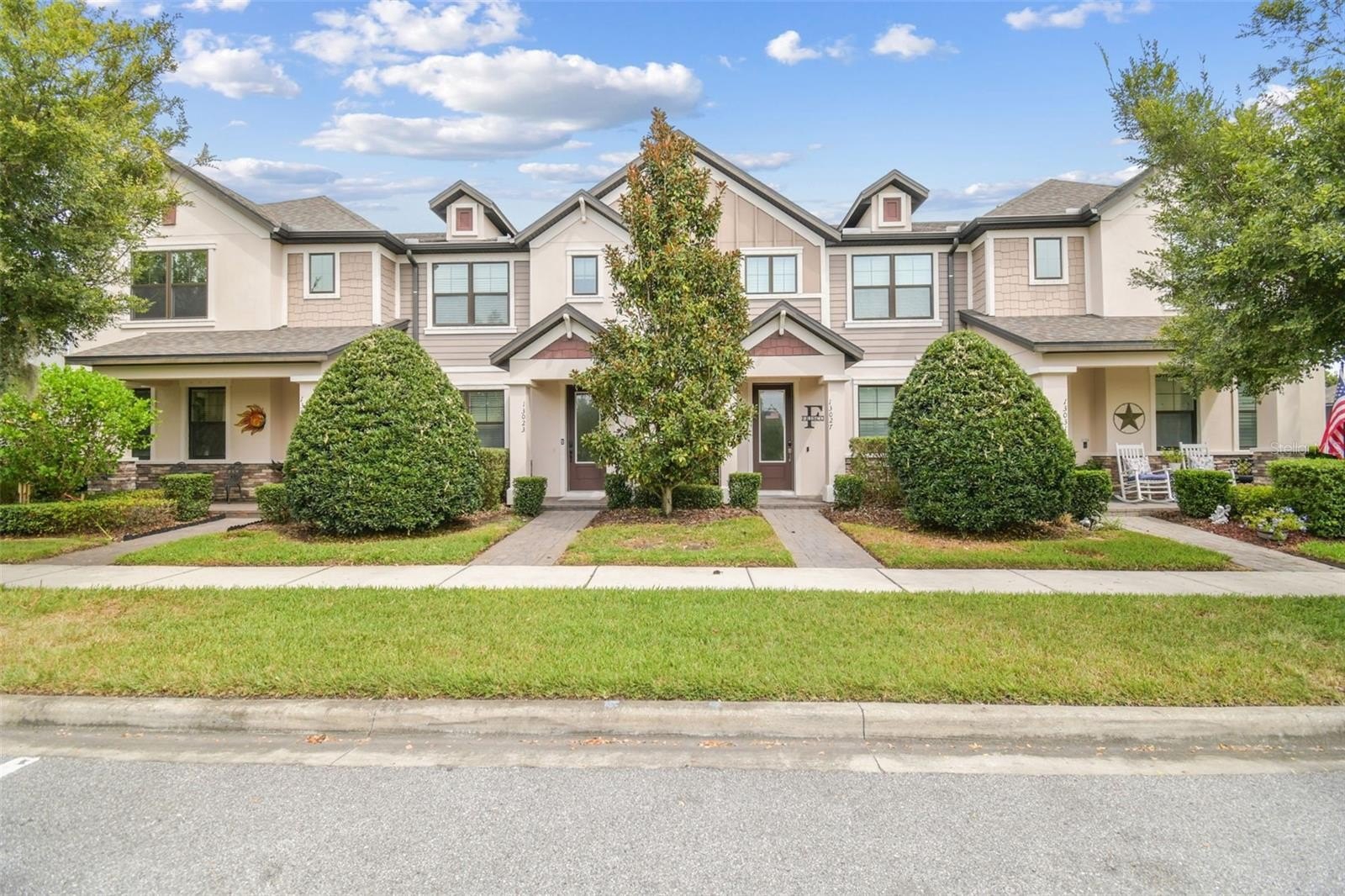 EXTERIOR MAINTENANCE FREE and move-in ready south facing townhome in highly sought-after Starkey Ranch in Odessa, FL, is now available. This STUNNING 2017 craftsman style townhome offers 3 bedrooms, plus flex/office space/ 2.5 bathrooms, a 2 car garage and is an END UNIT offering a water view, beautiful native landscaping and a spacious paver front porch. Once inside, take note of the show stopping 2-story entrance with BALCONY and gorgeous engineered espresso hard-wood staircase. There is UVA security film on upstairs windows and front door to protect them should they be hit and also helps in maintaining a cooler temperature. Modern wood-like tile flooring throughout the main level. Upgraded 5 1/4 inch baseboards. Newer interior paint. Continuing through to your left you have the flex space with french doors perfect for an office, craft room, play room, or a 4th bedroom (no closet). Designer lighting lights up the foyer that leads you to the heart of the home. Laundry room is on main floor providing additional storage area. Washer and dryer included. 1/2 bath for convenience. The living room is light and bright and connects to the kitchen for easy entertaining/conversation. Unique SHIPLAPPED electric fireplace with mantle makes for a cozy and inclusive space. Shiplapped granite island for additional seating, ample counter space with custom backsplash and under cabinet lighting. 42 inch espresso cabinets with thicker trim molding adds elegance. Spacious pantry. Upstairs enjoy NO CARPET and the newer luxury vinyl flooring detailed with quarter round. On one side you have a large bedroom that is very quiet and private. Full bathroom is shared with this room and the 2nd spacious room and has a tiled shower with listello details, a built-in wall niche, and granite sink. On the other end is the primary retreat with beautiful window views and privacy. Ensuite bathroom provides walk-in shower with tile and listello details and built-in wall niche. Both bathrooms have custom mirrors. From the kitchen, open the side door to you outdoor oasis that is screened in. This is certainly an additional space to relax and unwind in and you can utilize it all year! Off of the porch/lanai is the 2 car garage with epoxy flooring. This home is situated perfectly within the community nearing both entrances. The Starkey K8 school is close as well as grocery, restaurants, medical, and entertainment. You have access to the 3 community pools, green space, parks, and trails. Parking spaces along the front of the townhomes are there for convenience. BRAND NEW exterior paint 9/2025.