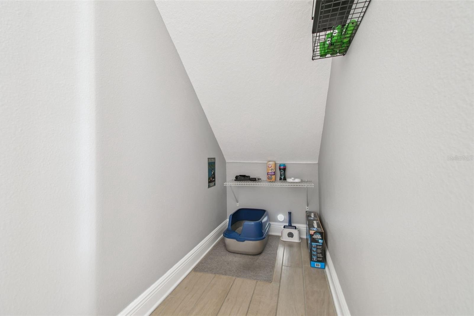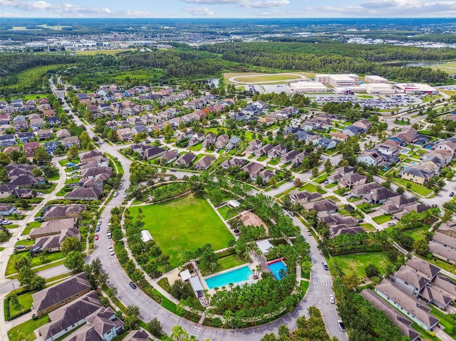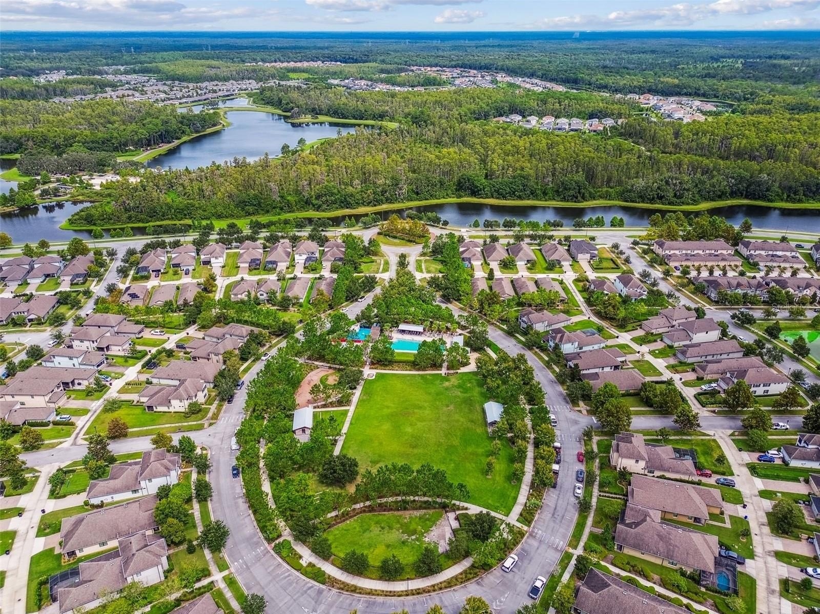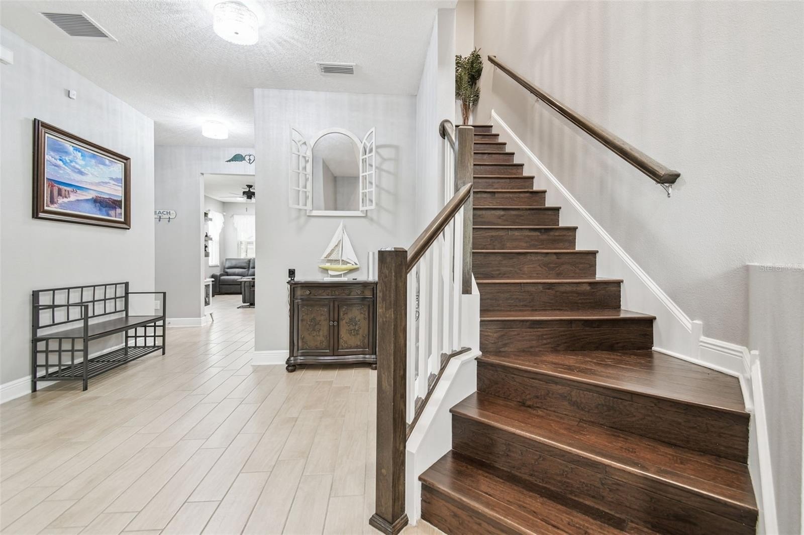 EXTERIOR MAINTENANCE FREE and move-in ready south facing townhome in highly sought-after Starkey Ranch in Odessa, FL, is now available. This STUNNING 2017 craftsman style townhome offers 3 bedrooms, plus flex/office space/ 2.5 bathrooms, a 2 car garage and is an END UNIT offering a water view, beautiful native landscaping and a spacious paver front porch. Once inside, take note of the show stopping 2-story entrance with BALCONY and gorgeous engineered espresso hard-wood staircase. There is UVA security film on upstairs windows and front door to protect them should they be hit and also helps in maintaining a cooler temperature. Modern wood-like tile flooring throughout the main level. Upgraded 5 1/4 inch baseboards. Newer interior paint. Continuing through to your left you have the flex space with french doors perfect for an office, craft room, play room, or a 4th bedroom (no closet). Designer lighting lights up the foyer that leads you to the heart of the home. Laundry room is on main floor providing additional storage area. Washer and dryer included. 1/2 bath for convenience. The living room is light and bright and connects to the kitchen for easy entertaining/conversation. Unique SHIPLAPPED electric fireplace with mantle makes for a cozy and inclusive space. Shiplapped granite island for additional seating, ample counter space with custom backsplash and under cabinet lighting. 42 inch espresso cabinets with thicker trim molding adds elegance. Spacious pantry. Upstairs enjoy NO CARPET and the newer luxury vinyl flooring detailed with quarter round. On one side you have a large bedroom that is very quiet and private. Full bathroom is shared with this room and the 2nd spacious room and has a tiled shower with listello details, a built-in wall niche, and granite sink. On the other end is the primary retreat with beautiful window views and privacy. Ensuite bathroom provides walk-in shower with tile and listello details and built-in wall niche. Both bathrooms have custom mirrors. From the kitchen, open the side door to you outdoor oasis that is screened in. This is certainly an additional space to relax and unwind in and you can utilize it all year! Off of the porch/lanai is the 2 car garage with epoxy flooring. This home is situated perfectly within the community nearing both entrances. The Starkey K8 school is close as well as grocery, restaurants, medical, and entertainment. You have access to the 3 community pools, green space, parks, and trails. Parking spaces along the front of the townhomes are there for convenience. BRAND NEW exterior paint 9/2025.