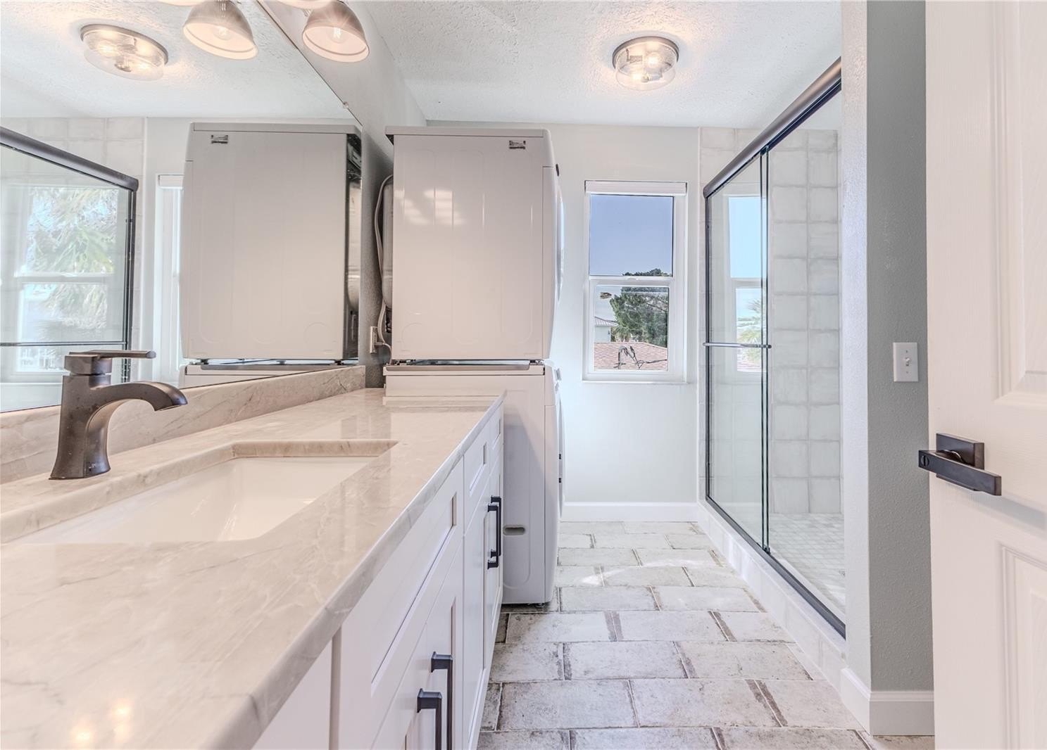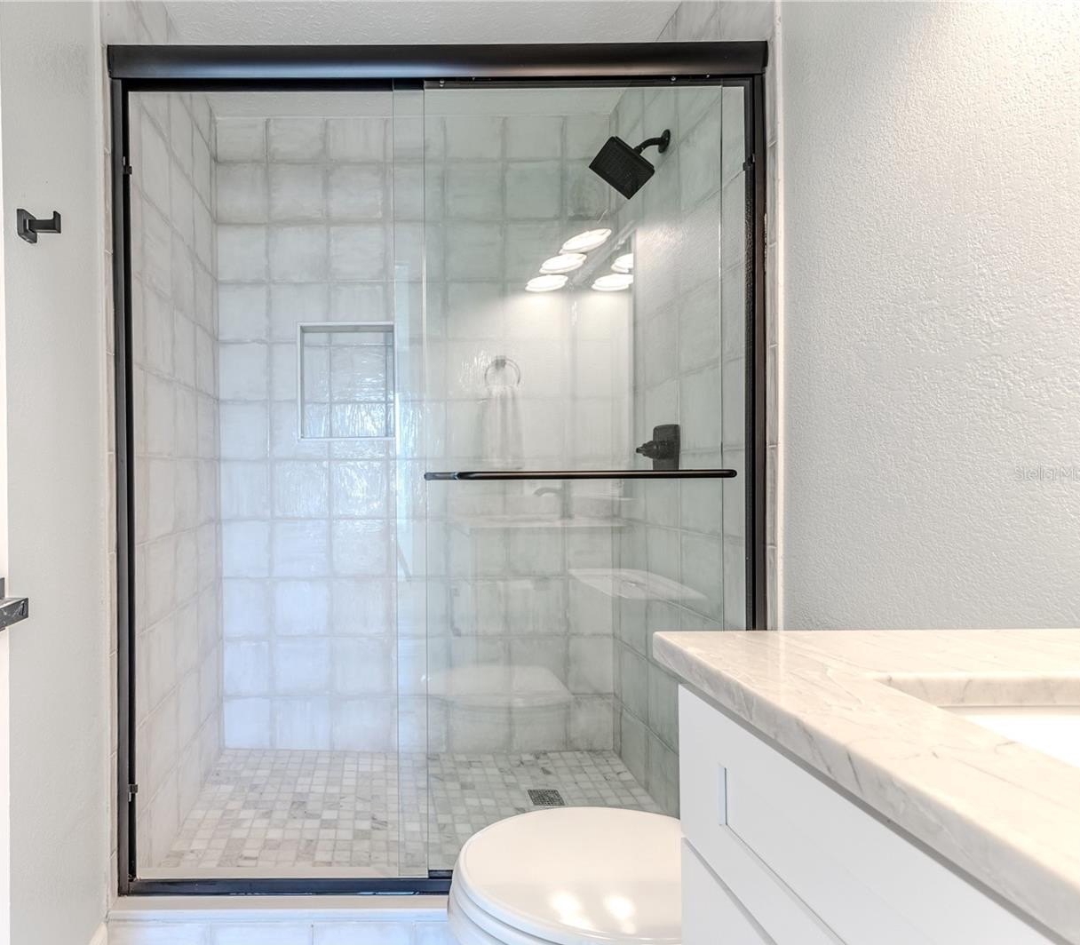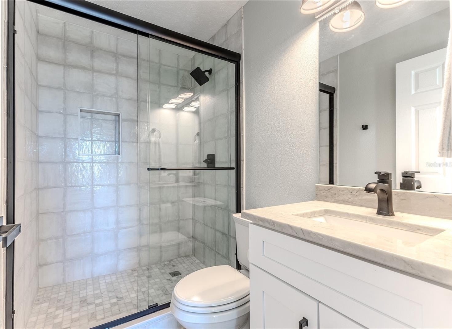 Enjoy two newly renovated bathrooms with custom tile showers, glass doors, and matching granite finishes. The primary suite features a walk-in closet, ensuite bathroom with rain showerhead and designer details throughout.