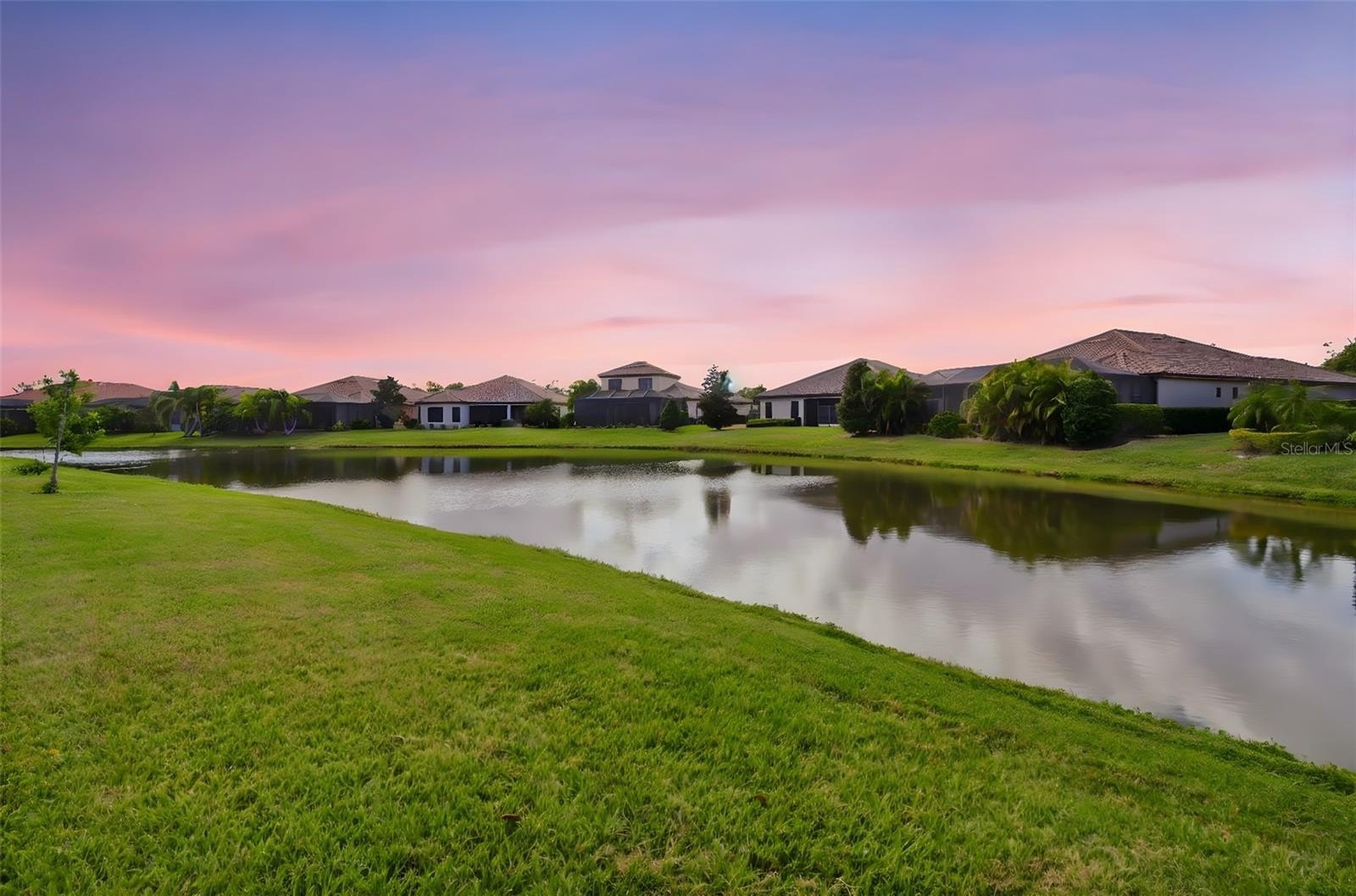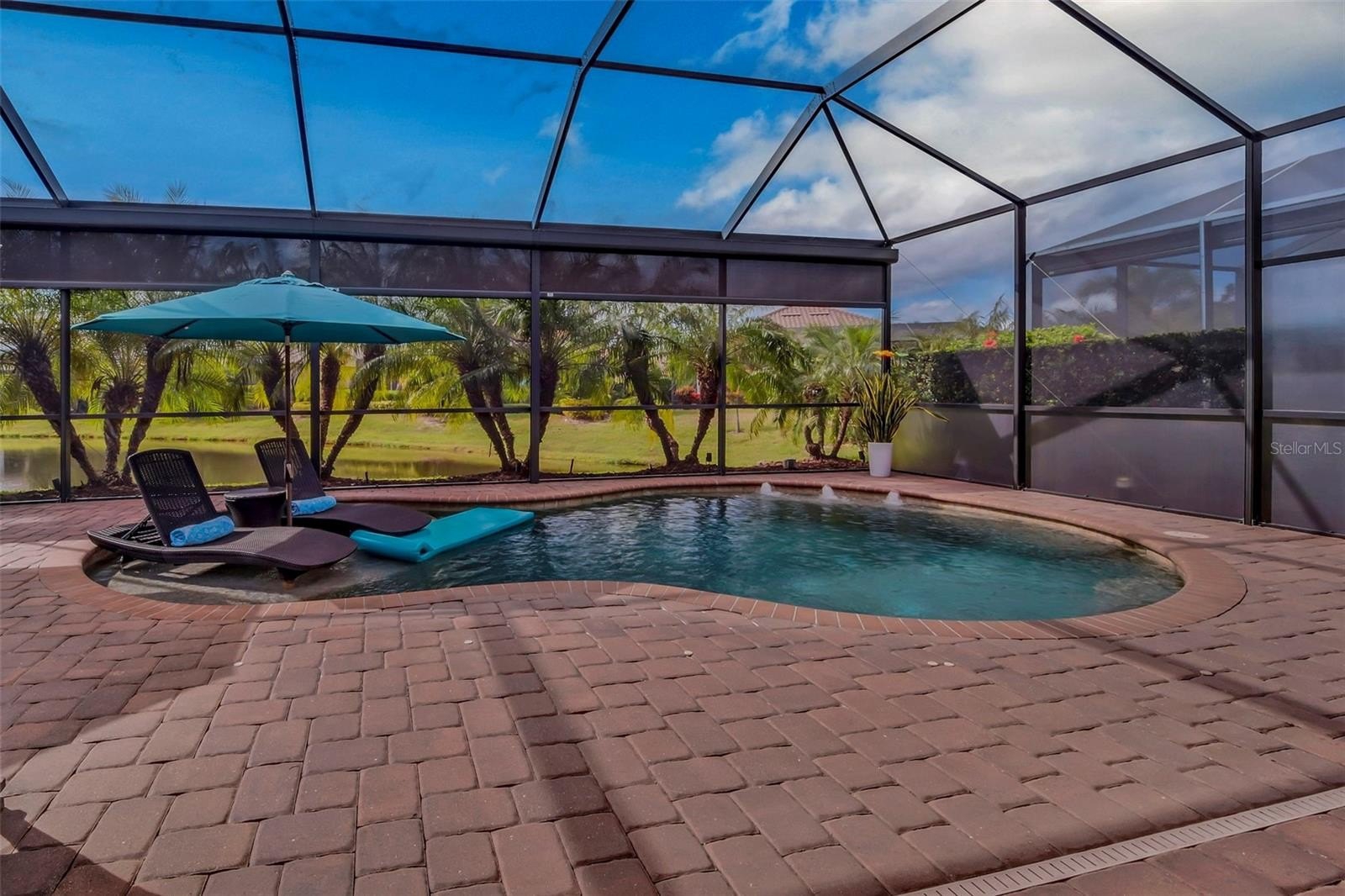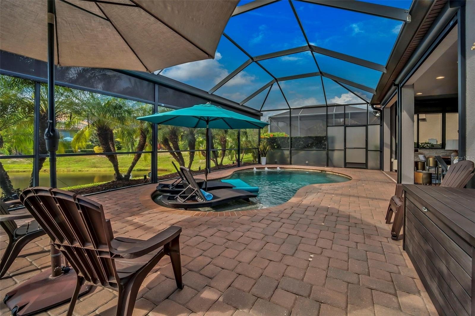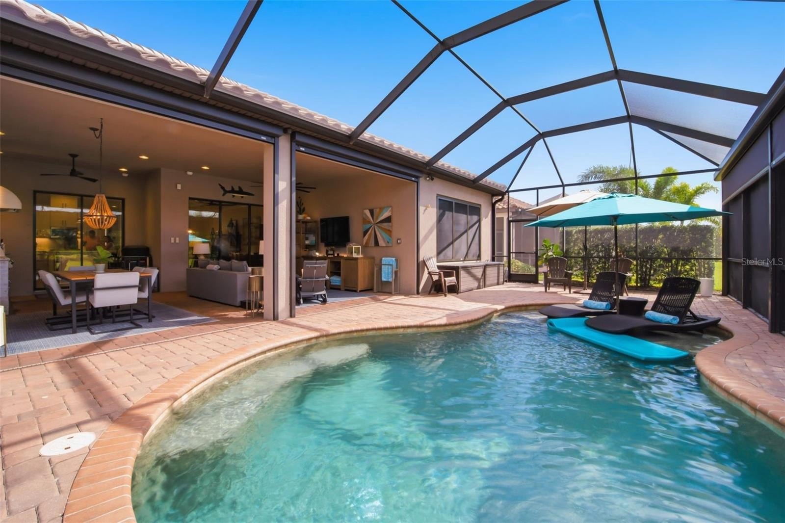 Discover affordable luxury living in this exceptional Lazio model with rare 3-car garage at Esplanade at Artisan Lakes. Every detail blends elegance, comfort, and modern convenience across 2,275+ sq. ft. of refined living space with 3 ensuite bedrooms, a versatile bonus room, and an open-concept layout overlooking a private lake. From the moment you enter through the shiplap-trimmed foyer, you’ll feel the sense of tranquility that defines this home. Nearly every builder option was selected, and thoughtful post-construction upgrades take it to the next level of luxury. The gourmet kitchen features a custom pantry with built-ins along with GE Café appliances, including a 6-burner gas range, under-counter wine/beverage fridge, and refrigerated drawers—ideal for entertaining. The chef in your family is going to love this feature! A large island provides generous prep, under-counter storage, and seating space flowing into spacious living and dining areas with oversized sliders and serene lake views. Elegant finishes include crown molding, coffered ceilings, designer lighting, and porcelain wood-look tile throughout. The owner’s suite offers custom blackout draperies, a large walk-in closet with built-ins, a spa like bath with dual vanities, a dual-entry shower with triple shower heads (including rainfall), and extra cabinetry. Outdoor living shines with a rescreened lanai with 17x20 polyester Super Screen® designed to safeguard against tiny pests such as "no-see-ums", freeform saltwater pool with sun shelf, custom pavers, and lush landscaping. Enjoy a built-in outdoor kitchen with grill, power burner, vent hood, and remote-controlled solar shades on the pool cage for privacy and comfort. Additional upgrades: whole-house Bahama Screen hurricane shutters, remote-controlled Hurricane Shades to protect covered lanai, screened front entry that provides wonderful cross-breeze, 3-car garage with epoxy floor and abundant ceiling rack storage, EV charger so bring your TESLA or favorite electric vehicle, whole-house water filtration, enhanced HVAC purification, custom closets, rain gutters, and fresh landscaping. Resort-style amenities: tennis, pickleball, bocce, dog park, two clubhouses with pools, fitness center, spa, card & massage rooms. HOA includes lawn care, landscaping, irrigation, cable, and internet. This home delivers luxury, functionality, and peace of mind—a rare opportunity to enjoy the Esplanade lifestyle in true comfort.
