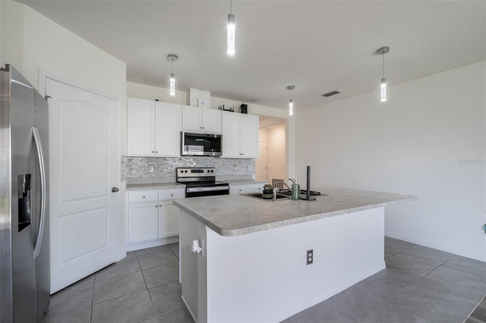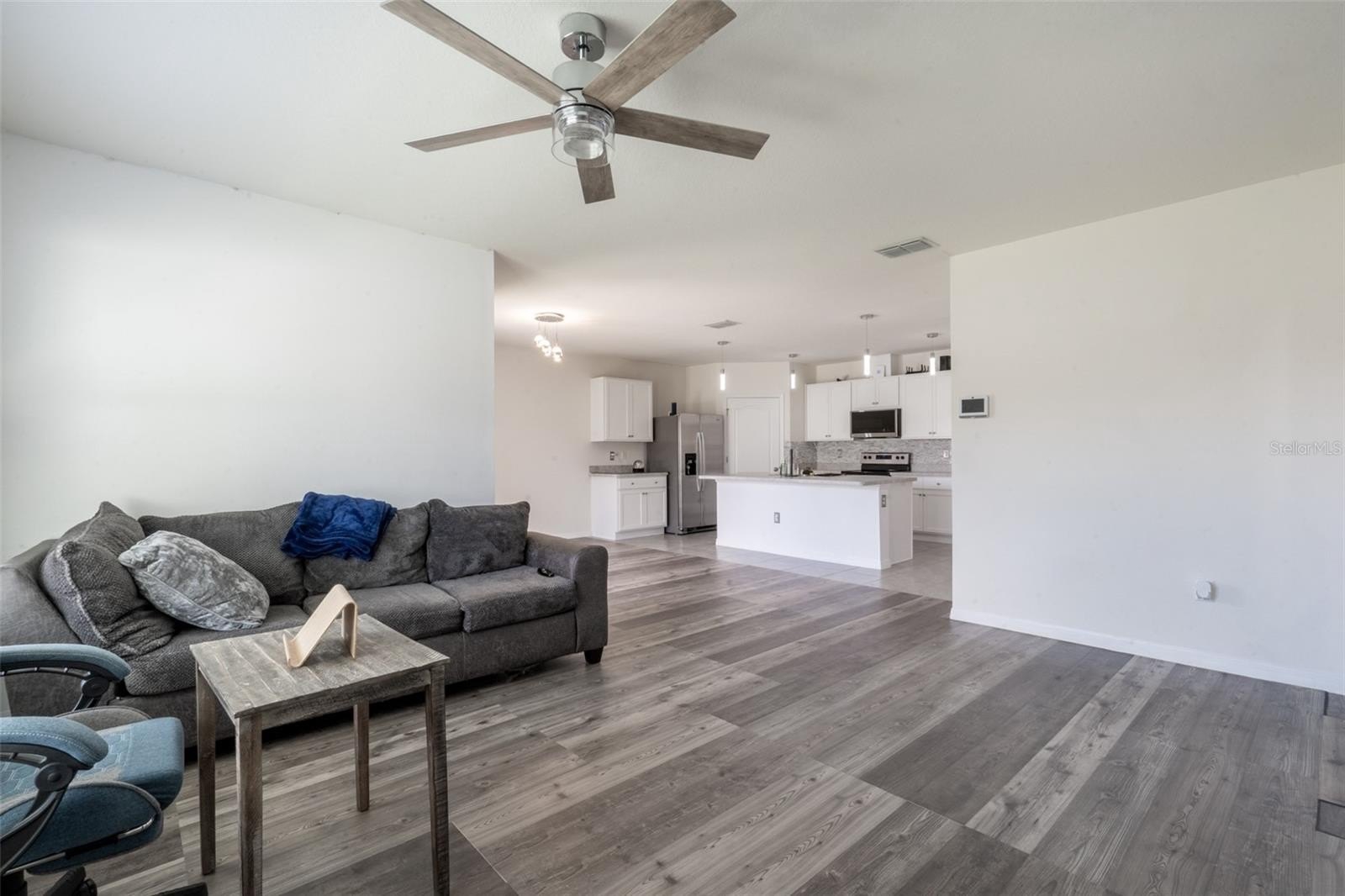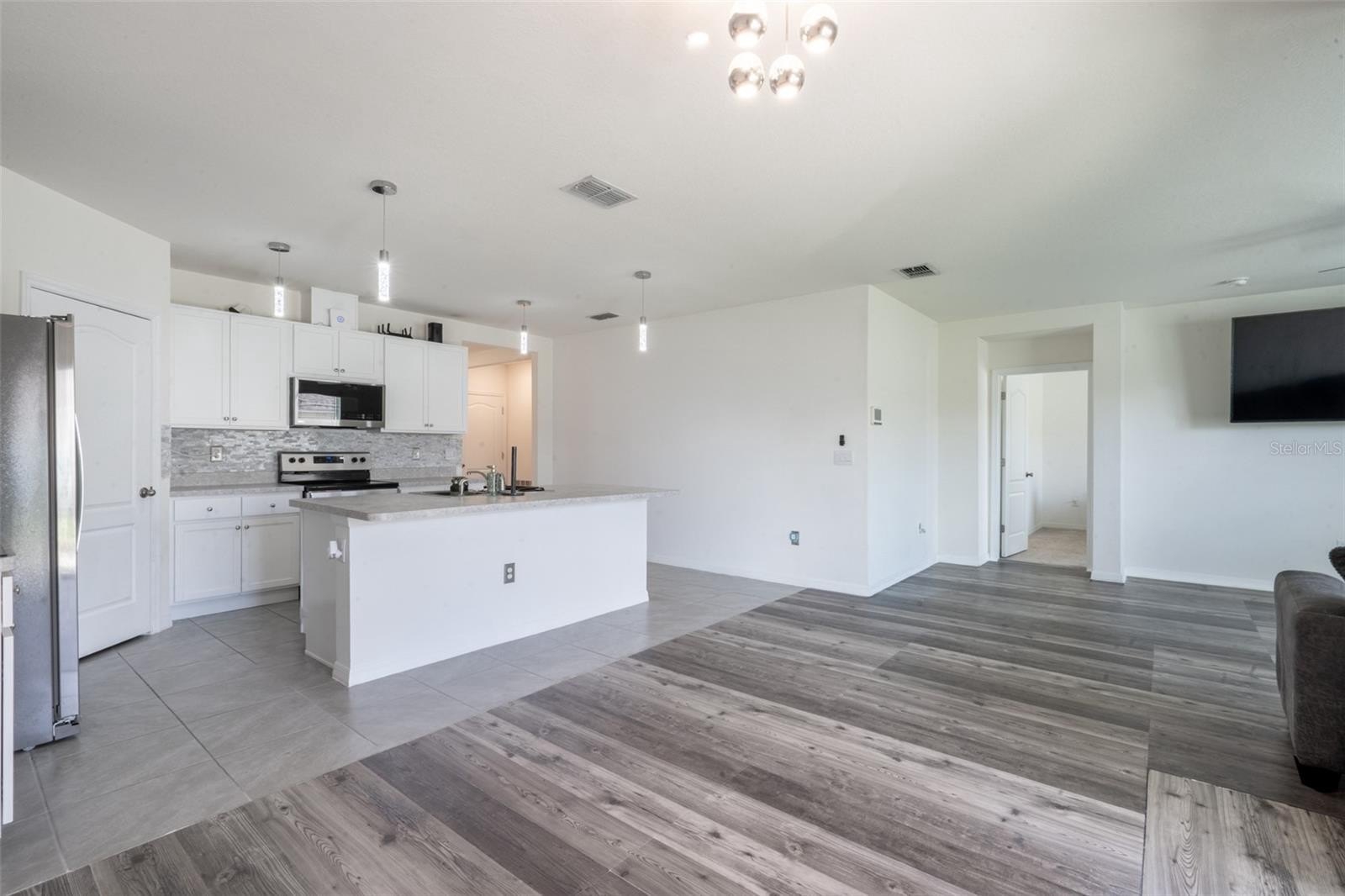 This is one of D.R. Horton's beautiful Cali models, open floor plan, with an open concept kitchen overlooking the living area, dining room, and outdoor lanai. This home is like new, built in 2023. It has been upgraded with interior lighting and hardwood flooring. There is also tile, and some carpet throughout the home. The space is amazing for entertaining. The spacious kitchen has upgraded backsplash, a lovely island, stainless steel appliances and great cabinetry. This home has 4 bedrooms with the primary located off the living space, in the back of the home, for privacy. If you're looking for a move-in ready home that is available for a quick close, don't miss this opportunity. Contact the listing agent for a private tour.