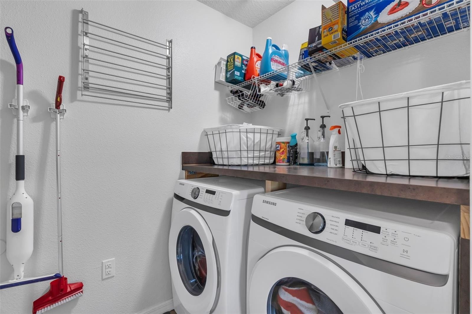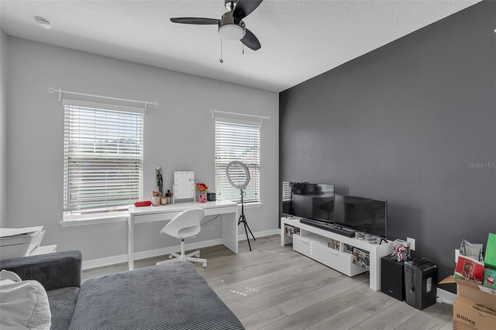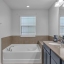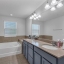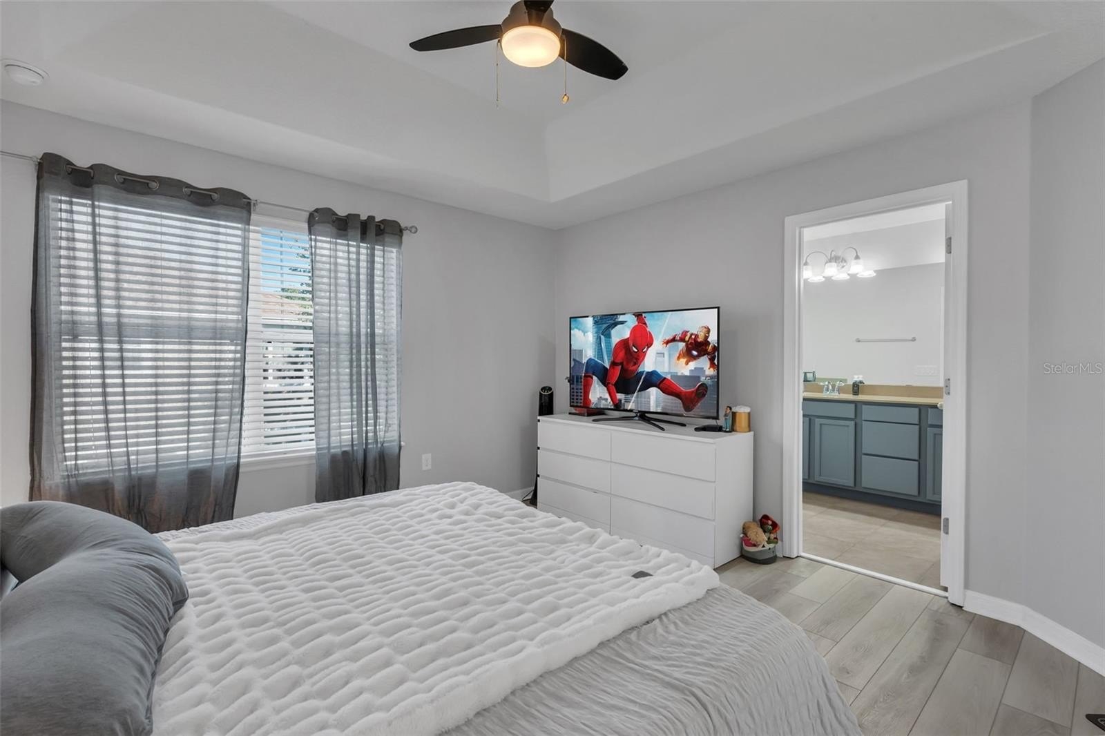 Heading upstairs, you’ll find the primary suite, a true retreat. Tray ceilings add architectural interest, while dual walk-in closets with ample storage. The en-suite bath features dual vanities, a separate shower and a soaking tub—creating a spa-like space to unwind. Two additional bedrooms upstairs are generously sized, one offering direct access to a full bathroom and both sharing easy access to the second bath. The upstairs laundry room adds convenience, with built-in shelving, a countertop workspace and a utility sink—making chores easier and more efficient.