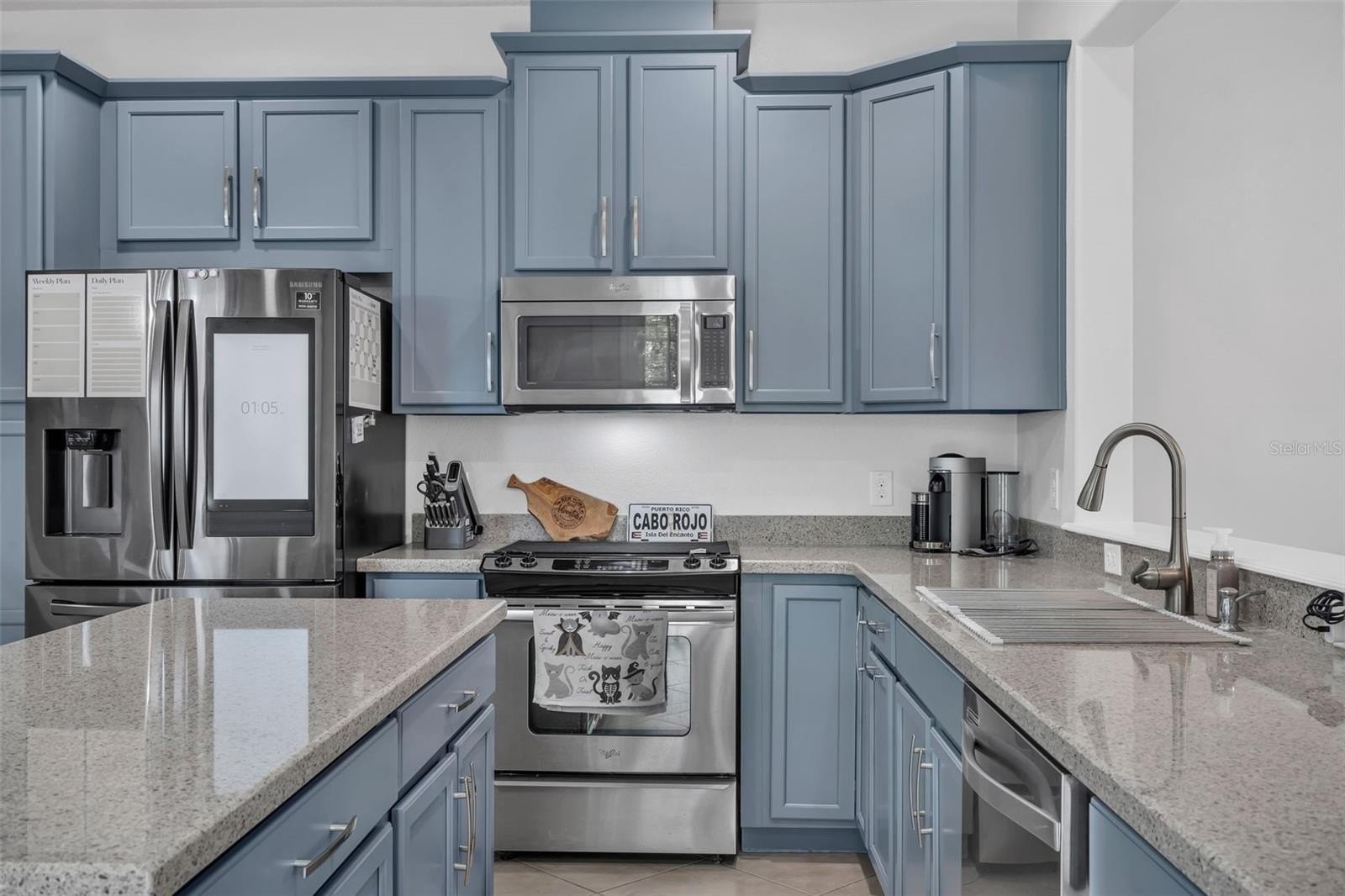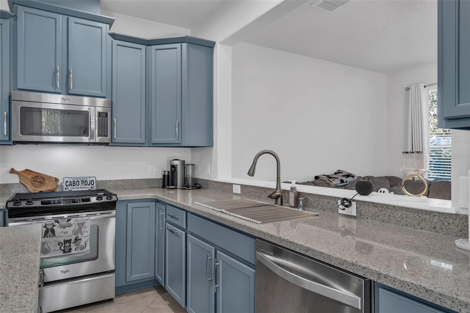 Adjacent to the living area is the sleek, well-appointed kitchen featuring granite countertops, 42” soft-close cabinetry, and a large island that invites casual dining or gathering with friends. Stainless steel appliances, generous prep space and thoughtful storage add both style and function. The dining area flows effortlessly from the kitchen, combining practicality and a sense of unity in the main living level.