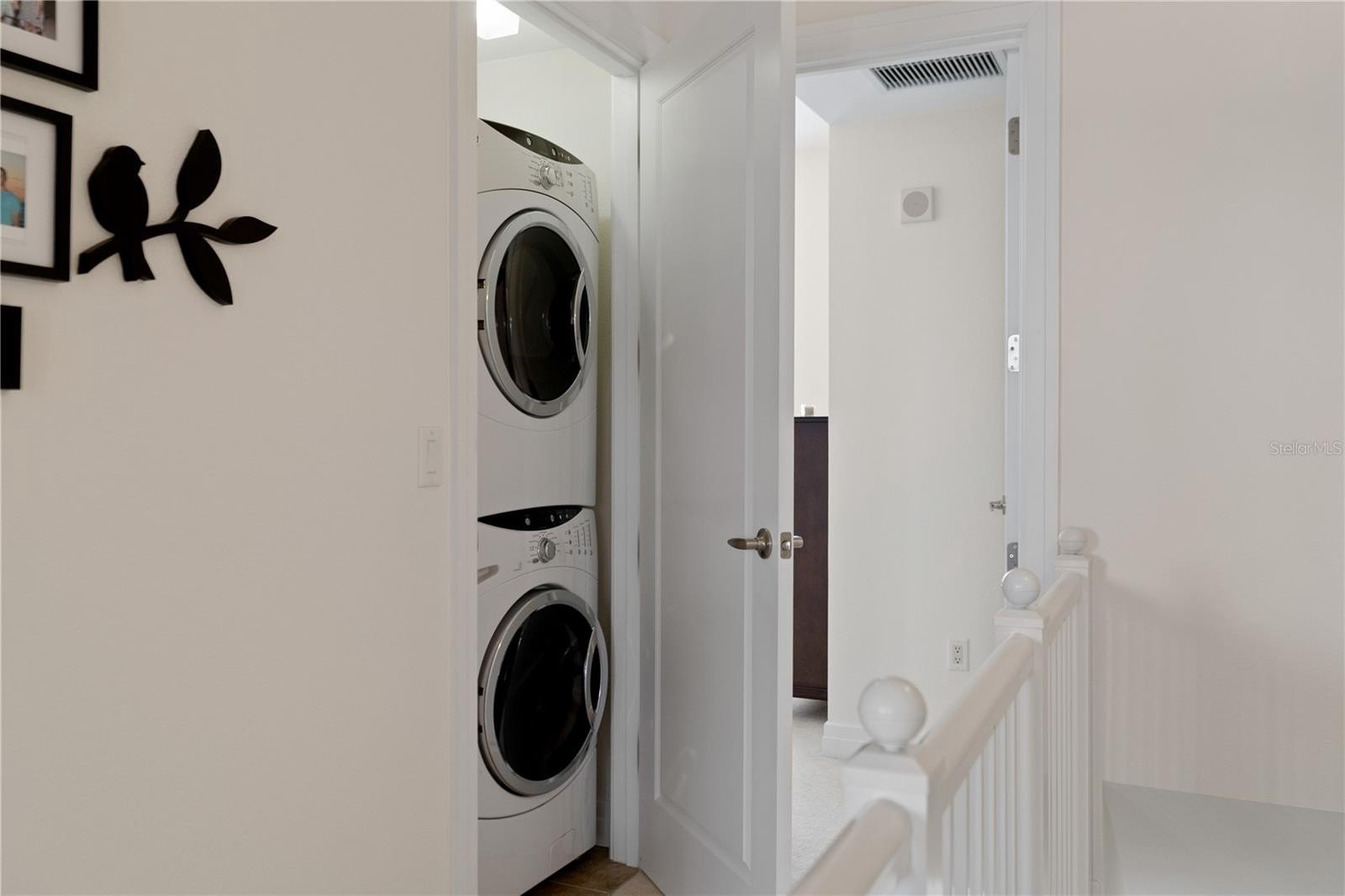 Upstairs, the primary suite impresses with dual closets (including a walk-in), a luxurious en-suite bath featuring dual vanities and a walk-in shower, and private patio access for peaceful mornings or evenings under the stars. The guest bedroom offers its own full bath and generous closet space, while an in-unit laundry between the bedrooms adds everyday convenience.