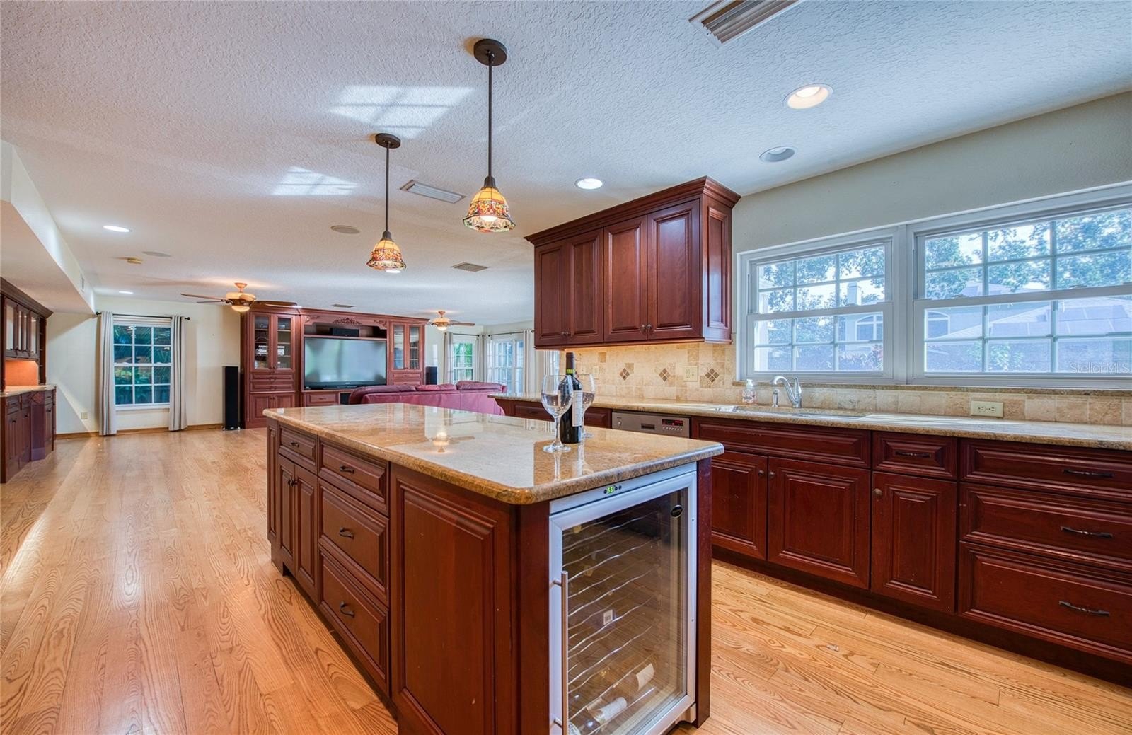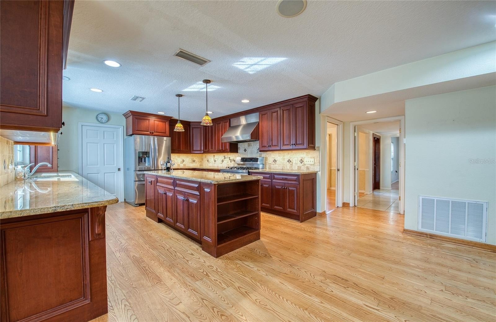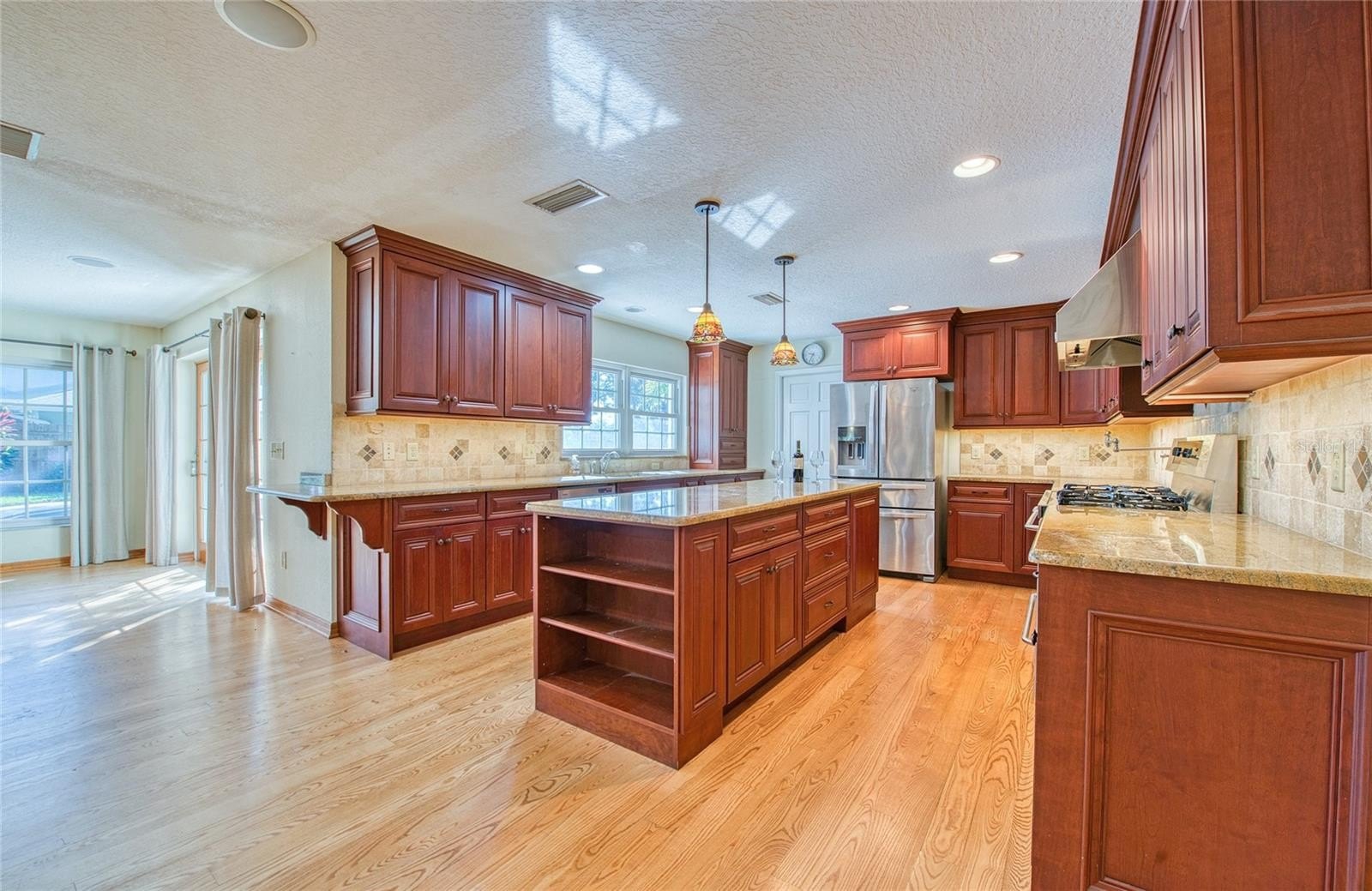 PRICE IMPROVEMENT! - This spectacular Countryside home in Clearwater is ready to nurture its next family. With 3,520 square feet of heated and cooled living space, it offers 5 spacious bedrooms, 3.5 bathrooms, and a spacious 3-car garage. Step outside and unwind among lush native Florida foliage, serenaded by the soothing sounds of a waterfall and koi pond. Mature oak trees shade the home and grounds. Irrigation system with private well sustains the vibrant yard and poolside landscaping, while the pool deck—crafted from exposed shell concrete with elegant travertine edging—adds a touch of coastal charm. The expansive kitchen and its storage are a chef’s paradise, featuring 30 feet of granite countertops, custom cherry cabinetry, a warming drawer, built-in wine cooler, and a dual-power gas/electric stove with five burners, one and a half ovens, and a convenient pot filler. Under-cabinet lighting sets a warm ambiance, and stainless-steel appliances beautifully complement the oak and ash wood flooring. Entertain effortlessly in the immense great room, complete with a custom-built entertainment center and a 73-inch Mitsubishi TV enhanced by a surround sound system. The large living room features a wood burning fireplace and a separate dining room is just steps from the kitchen. The downstairs 5th bedroom with full wall shelving and closets can be used as a very private home office. The master bathroom offers spa-like luxury with a whirlpool tub, walk-in shower, and double-sink vanity. Practical upgrades include: Roof replaced in 2016 with Owens-Corning Lifetime dimensional shingles with a transferable warranty. Downstairs AC replaced in 2024; upstairs in 2016. Rinnai tankless gas water heater replaced in 2022. Pool pump, pool filter system and pool sweep replaced in 2024. Hurricane-rated Anderson sliding doors and insulated impact resistant windows provide energy efficiency and a very quiet environment, while ensuring lasting protection in this high-and-dry, no-flood-zone location. Ideally situated between Tampa International and St. Pete-Clearwater airports, this home is just minutes from the charming downtowns of Safety Harbor and Dunedin, Countryside Westfield Mall, Countryside Country Club, Countryside Rec Center, and less than 30 minutes from the world-famous Clearwater Beach. No HOA fees. Owner Financing Possible!