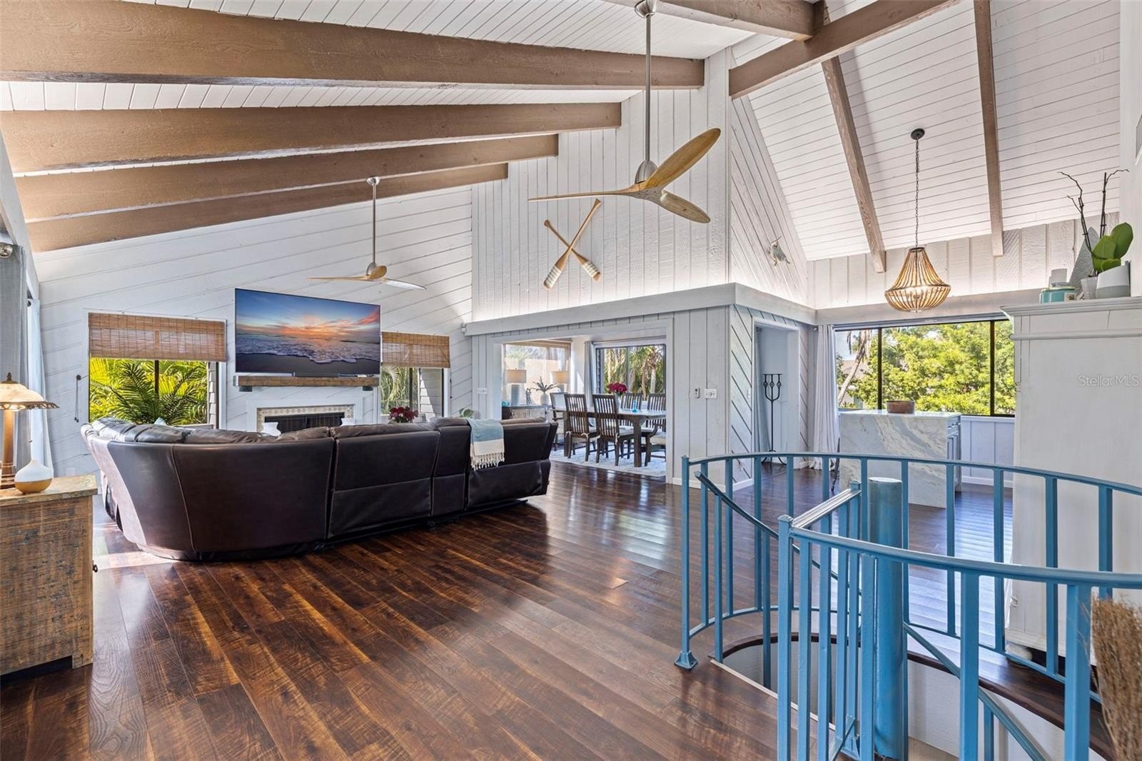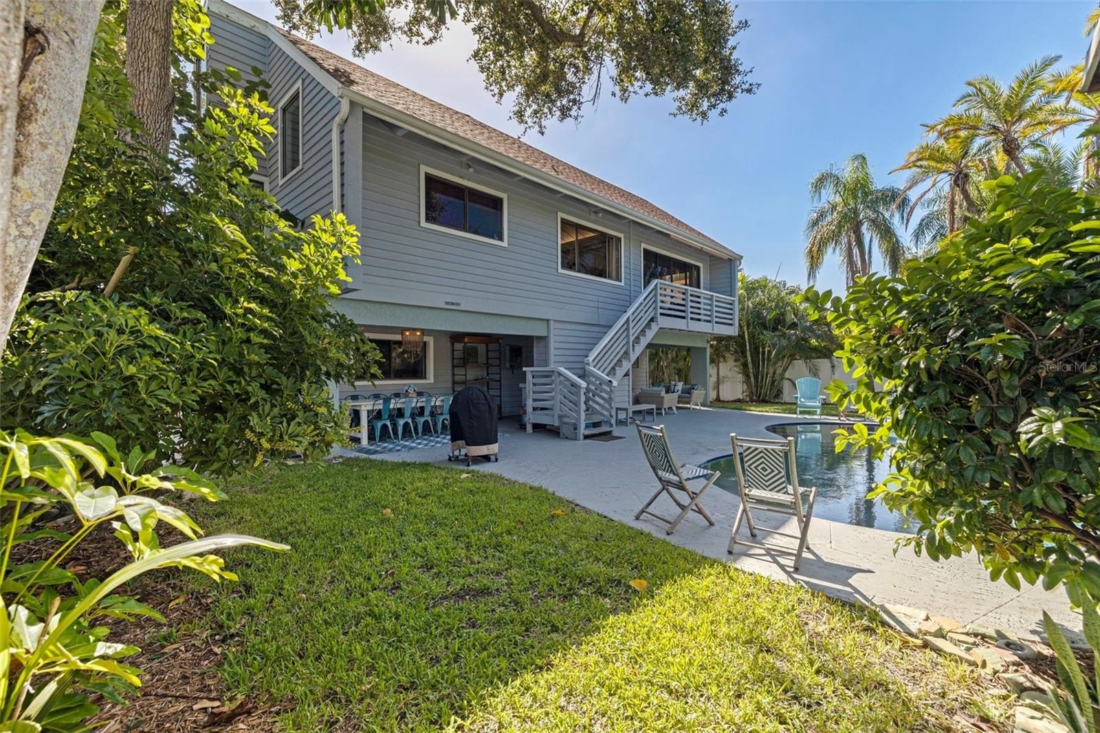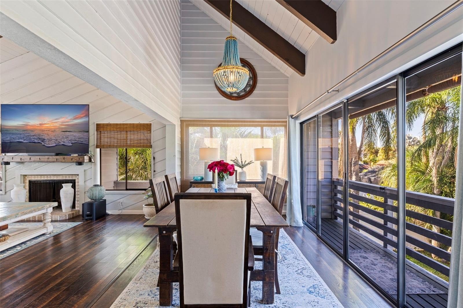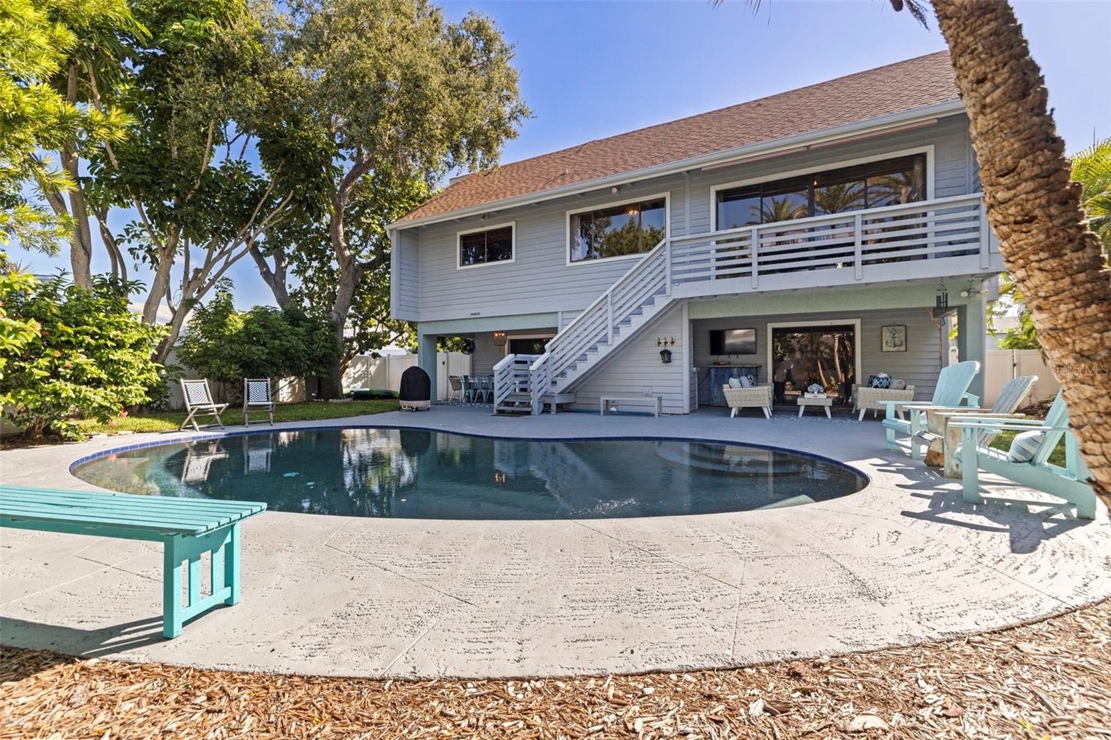 Experience true Florida living in this coastal, move-in ready, high & dry, two-story home located in Tierra Verde’s highly sought-after Sands Point neighborhood. Set in a quiet yet very vibrant and active waterfront community, this residence offers comfort, privacy, and peace of mind, having remained completely dry through the recent hurricanes. The welcoming, light blue front door opens to soaring ceilings with exposed beams, wood-look luxury vinyl floors, and abundant windows that fill the home with natural light. A sliding door connects seamlessly to the pool area, creating an easy indoor-outdoor flow. The main upper level offers a spacious living room featuring a wood-burning fireplace and a cozy formal dining corner, blending into the stunning updated kitchen. The kitchen showcases elegant countertops, ample cabinet space, and a sleek island that connects the dining and kitchen areas while offering convenient casual counter seating. Around the corner a spacious guest bedroom with dramatic ceilings, a full closet, and a beautifully updated bath. The expansive primary suite on the east side features an office nook or space to expand the already generous walk-in closet, plus a stunning ensuite bath with an oversized walk-in shower. The lower level is accessible via staircase and offers another private bedroom with ensuite bath. There is a bonus family/playroom with walkout access to the pool, and a two-car garage with laundry area, an additional refrigerator, water softener, and plenty of storage. In addition to the garage parking, the large driveway provides convenient space for multiple cars, perfect for extended family and guests. Out back, enjoy a fully fenced oasis with in-ground pool, ample space for entertaining, a setup ideal for an outdoor entertaining kitchen, plus a shed tucked in the corner for tools and water toys. The landscaping is low-maintenance, lush, and private, perfectly embracing the Florida lifestyle.