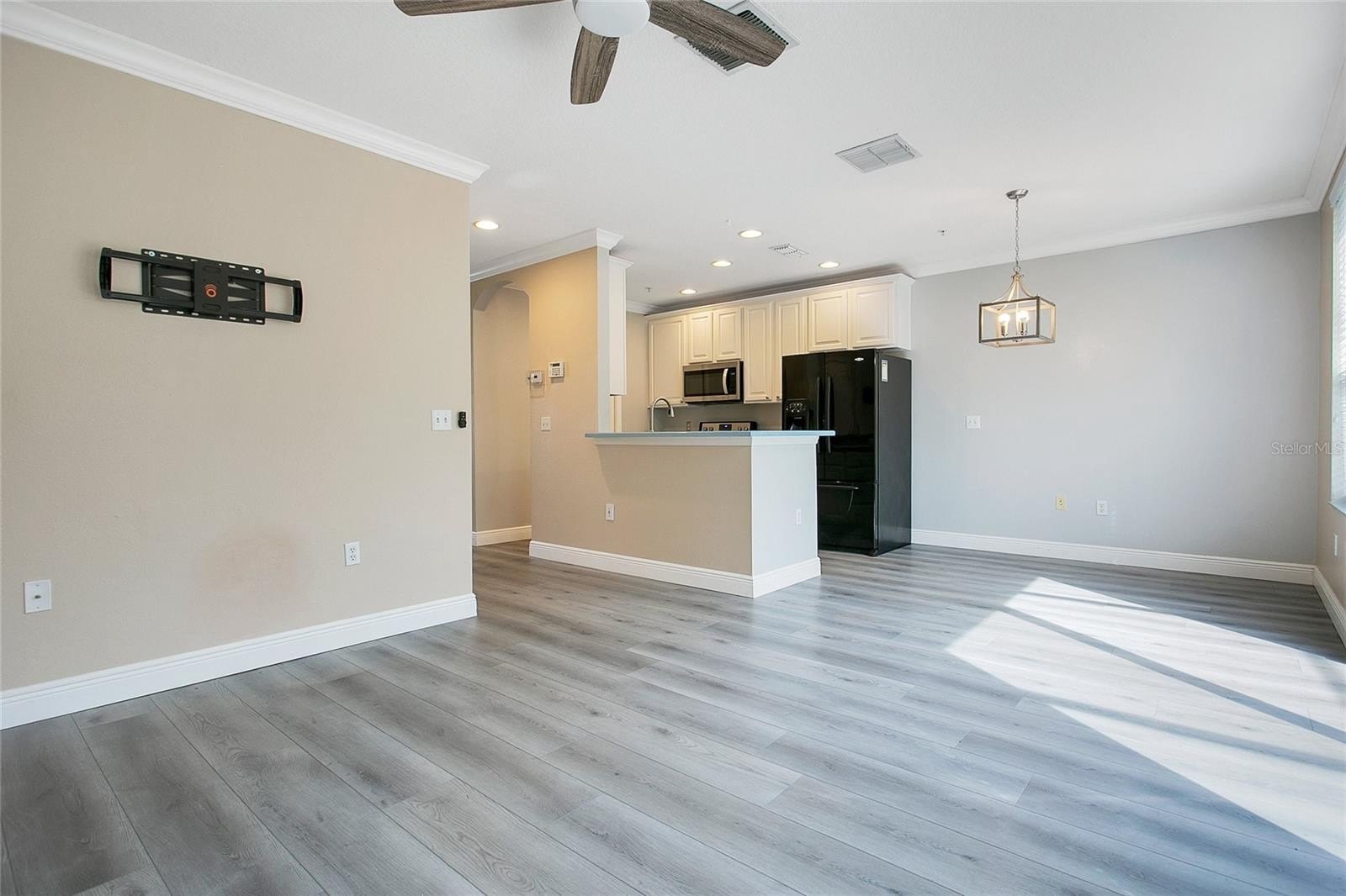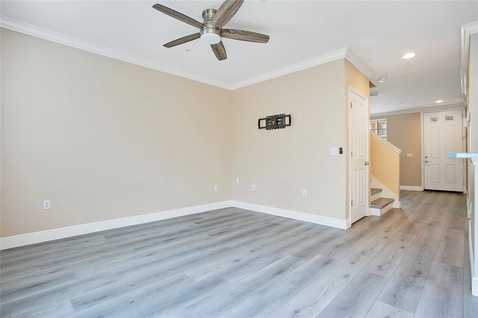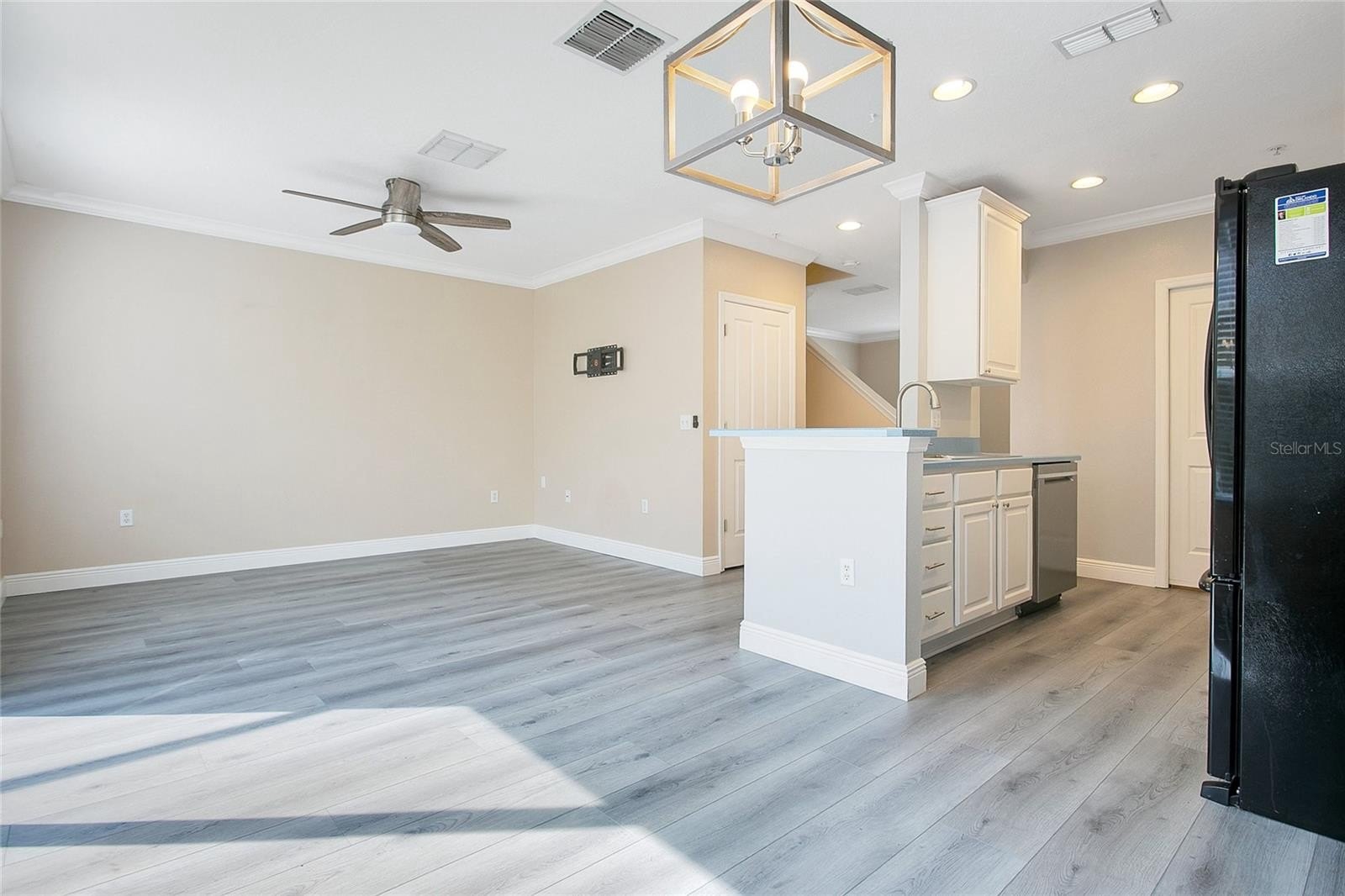 The kitchen shines with an upgraded sink, sleek hands-free faucet, USB outlets on the island, and a modern LED fixture in the pantry. The spacious living area features elegant crown molding and an upgraded ceiling fan, creating a warm, welcoming space for relaxing or entertaining. Upstairs, the primary suite offers comfort and function with built-in USB outlets for easy charging.