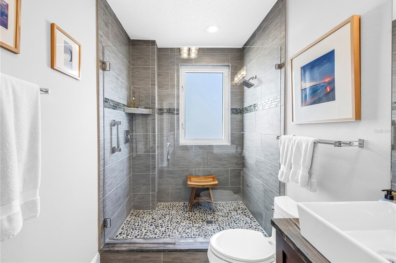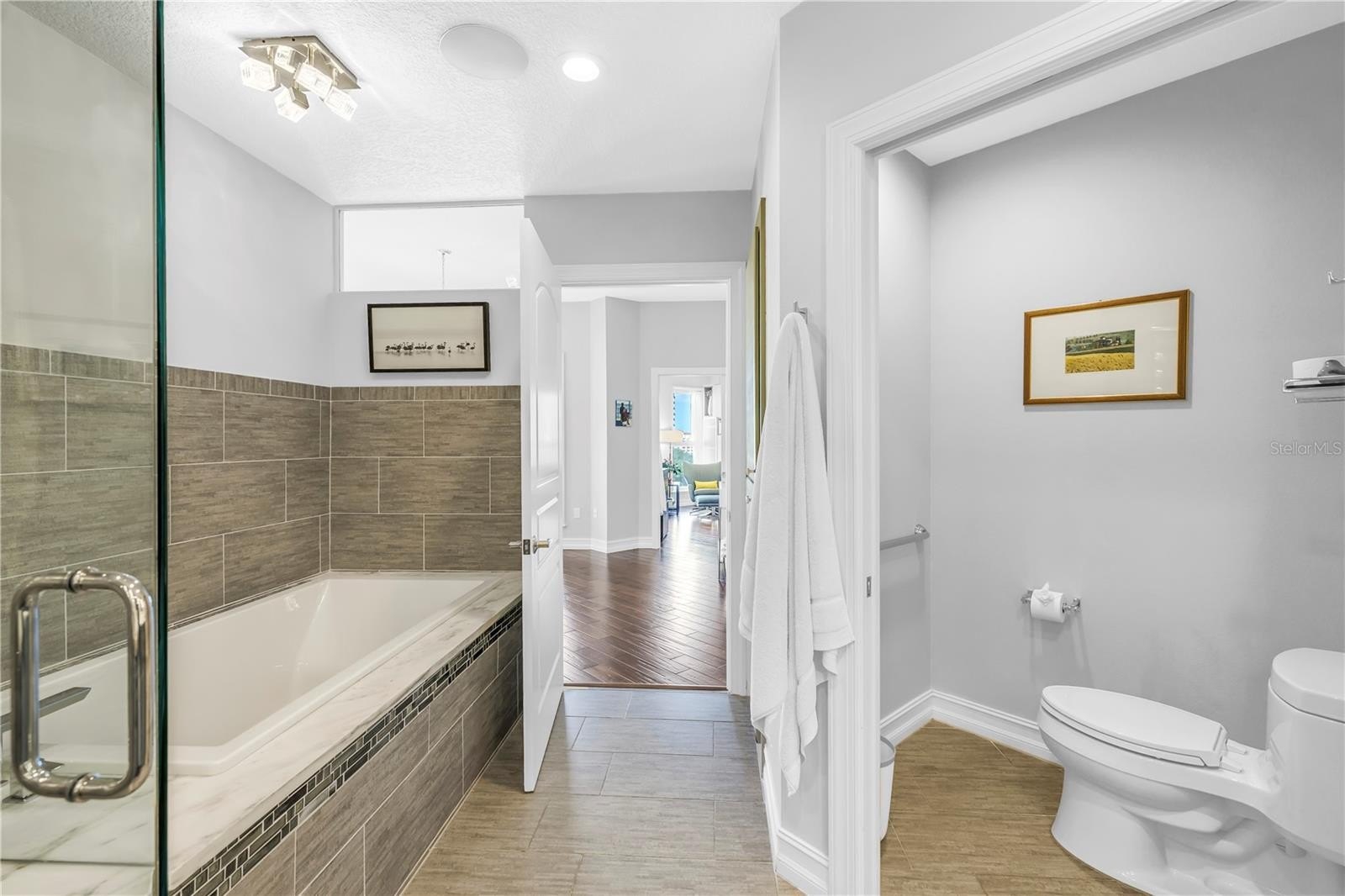 The primary suite is a private retreat designed for relaxation, complete with a deep soaking tub, oversized walk-in shower with dual showerheads, dual vanities, and generous custom closets. A spacious guest bedroom and a versatile den or office — easily used as a bedroom—provide flexibility for guests or work-from-home living. A full laundry room adds everyday convenience.