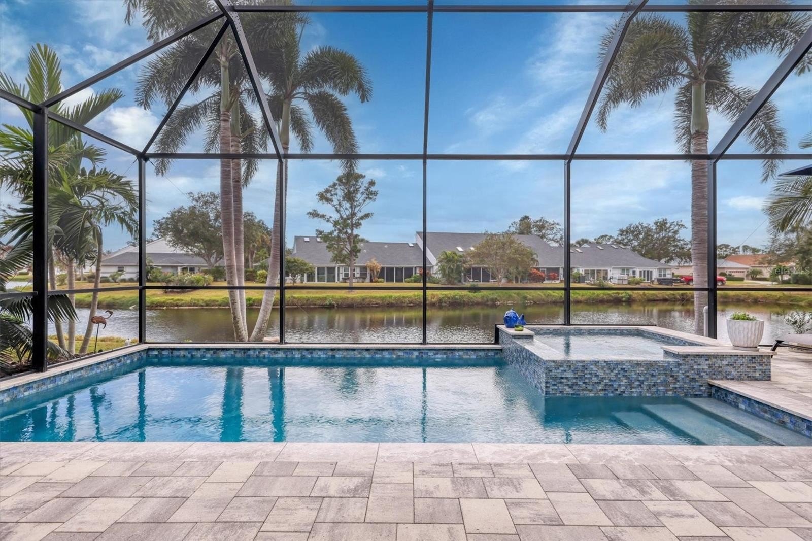 the saltwater pool and spa (2021) surrounded by travertine and a paver