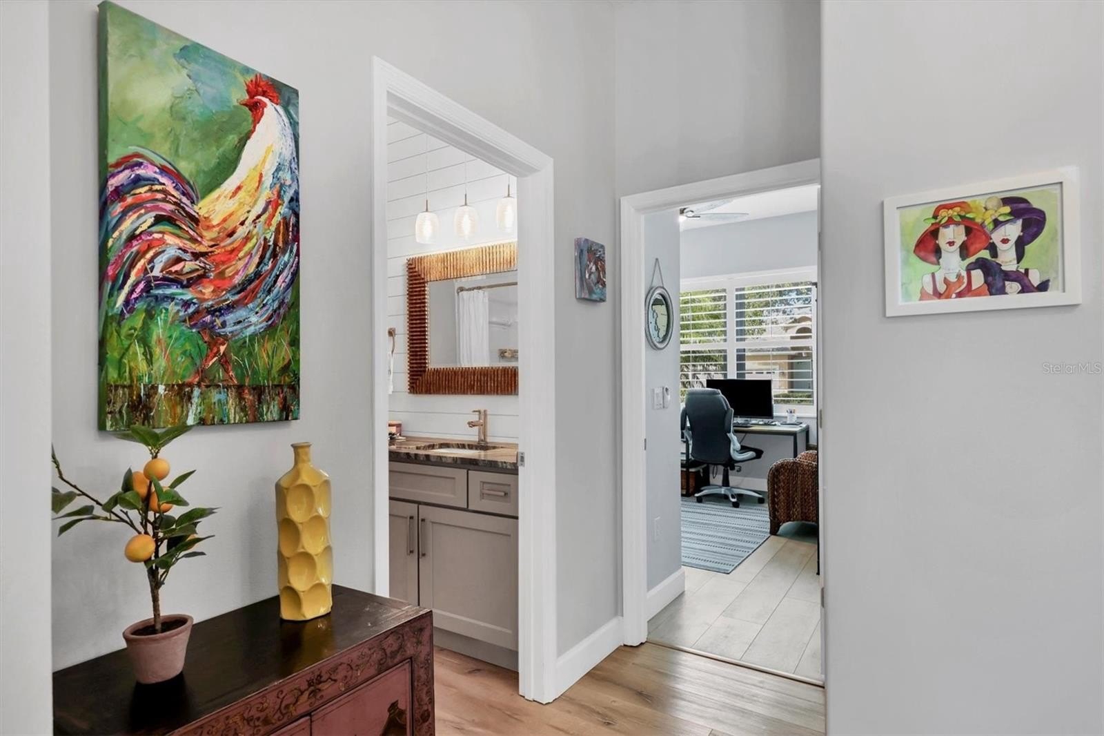 plantation shutters, and share a stylish hall bath with a tub/shower