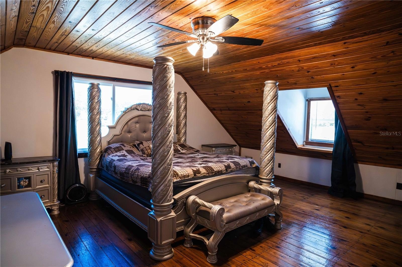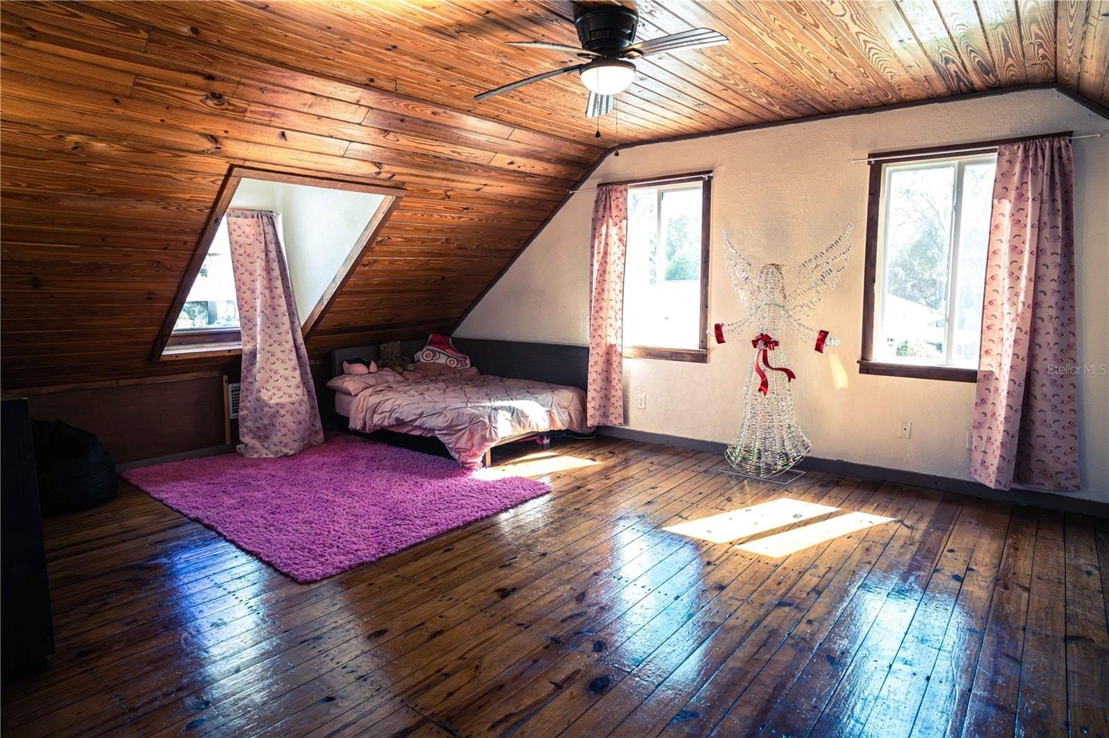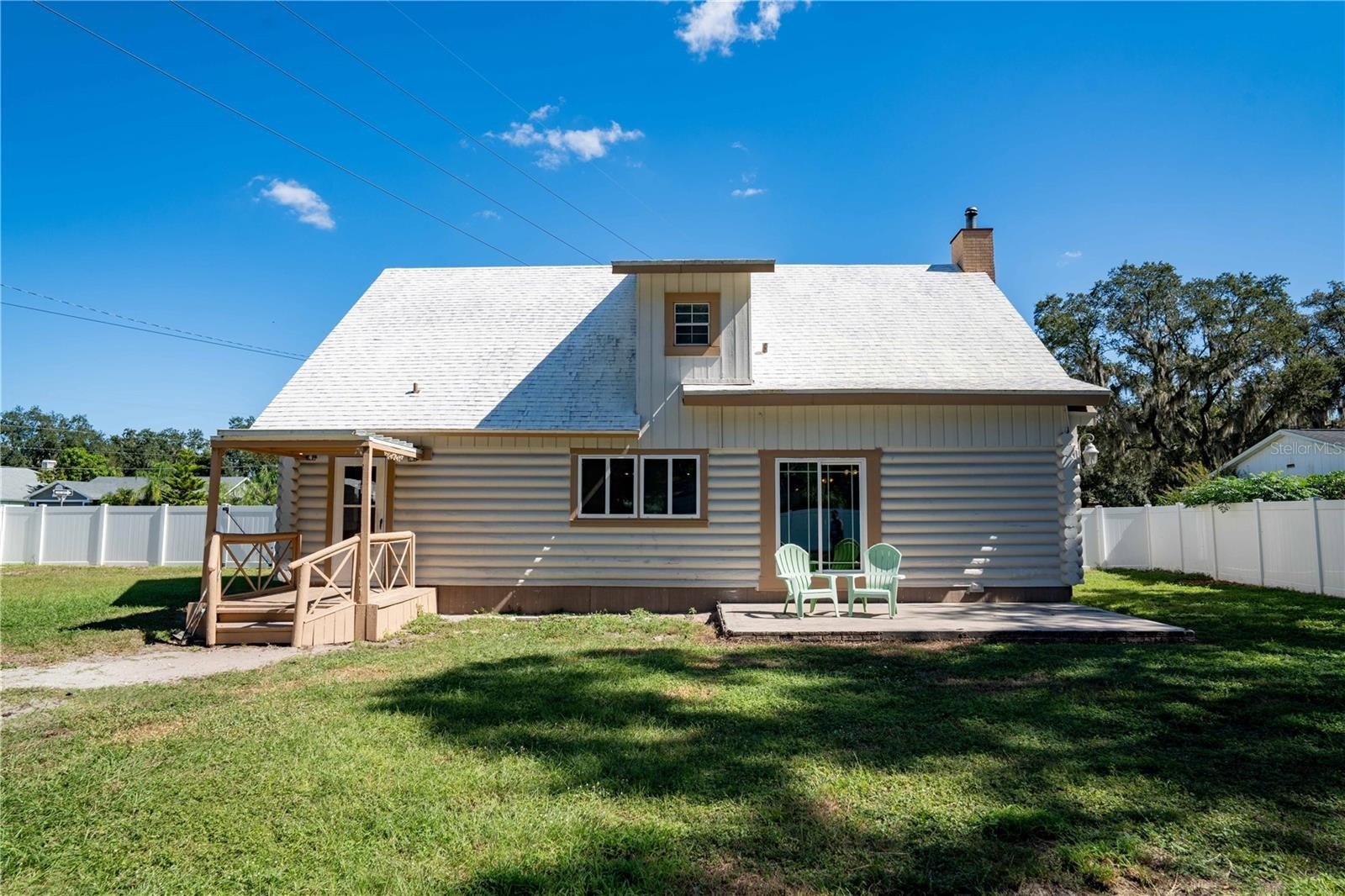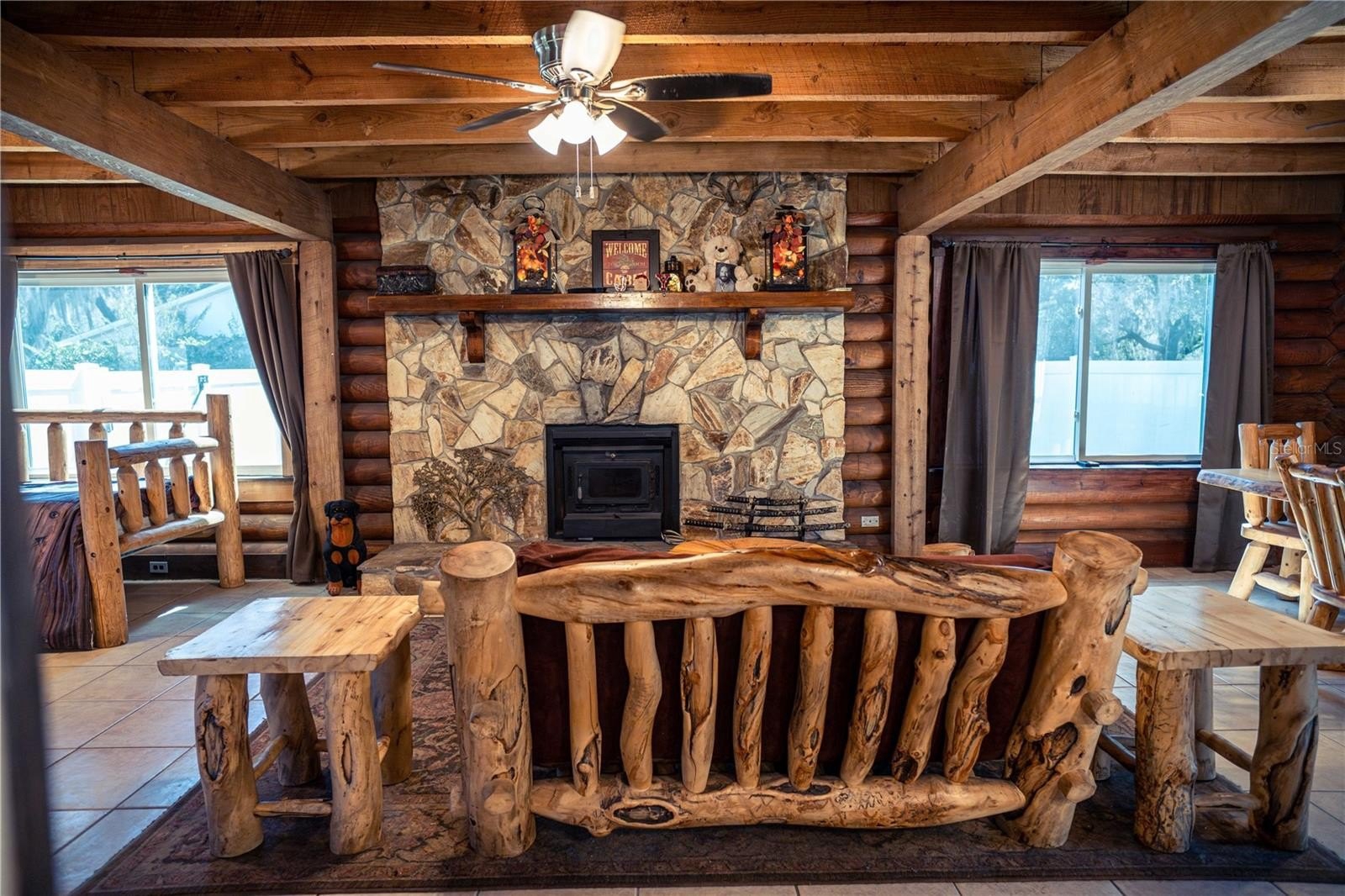 Relax, you’re Home! Custom Built, Beautiful Renovated CEDAR Log Cabin that brings the mountains to Florida! Complete with rocking chair-ready 40 ft long front porch, fireplace and large shaded landscaped lot. Step inside and be greeted with silence from thick Cedar log walls, solid Cedar doors & ceilings, and see exquisite wood craftsmanship with real antler bone accents throughout the home. Nestle in front of the stone wood burning fireplace on a cold night with hot cocoa in the open concept great room that opens to the dining room and large kitchen that has custom Cedar cabinets & tile countertops, SS appliances that includes a Double Dutch oven & deep freezer, double pantry with storage, and separate laundry room. Tile throughout first floor. Light candles and relax in the downstairs NEW updated bathroom with lighted jacuzzi tub, imported Italian stone tile, quartz countertop and lighting. The Cedar stairs lead upstairs to Cedar hardwood glazed floors & ceilings in the 2 extra-large quiet bedrooms across the hall from each other for privacy. The 2nd bathroom has imported Italian stone tile from floor to ceiling, Quartz countertop and NEW lighting. Backyard is perfect for relaxing & entertaining with a large patio and plenty of yard space. Enjoy your hobbies in the 10x20 shed with roll up door, electric, ac, shelves tables, insulated including ceiling, & separate fuse box, With connected carport (11’ w x 25’L x 7’h ) with new paint, roof/2025, & high tech security light.