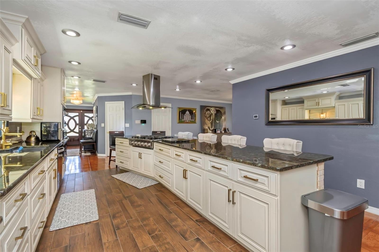 Step through elegant double doors into this light-filled 3-bedroom, 2-bath home featuring a spacious great room with soaring volume ceilings and abundant natural light. The open-concept layout includes a beautifully updated kitchen with granite countertops, gas cooktop, convection microwave, and convection oven—plus ample counter seating that flows seamlessly into a cozy living area, perfect for entertaining or relaxing.