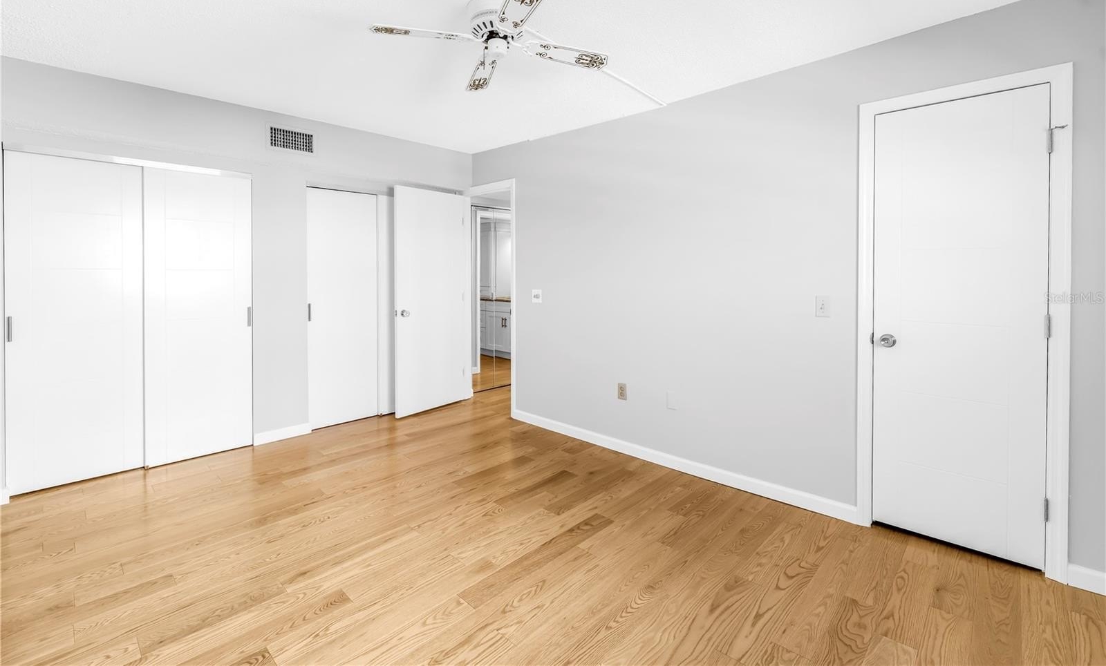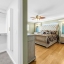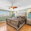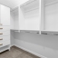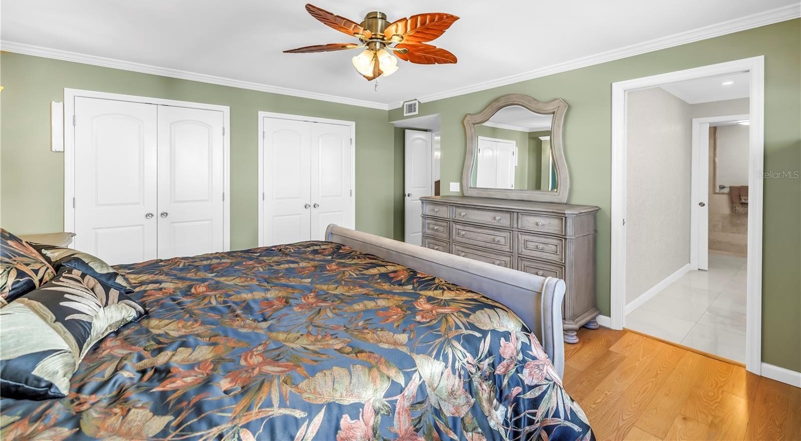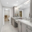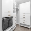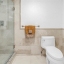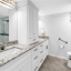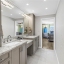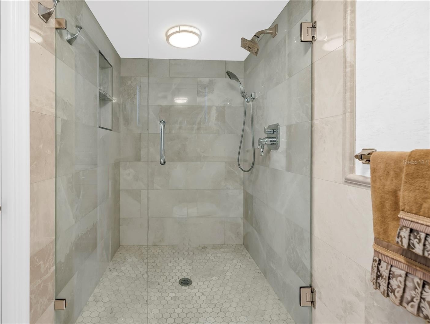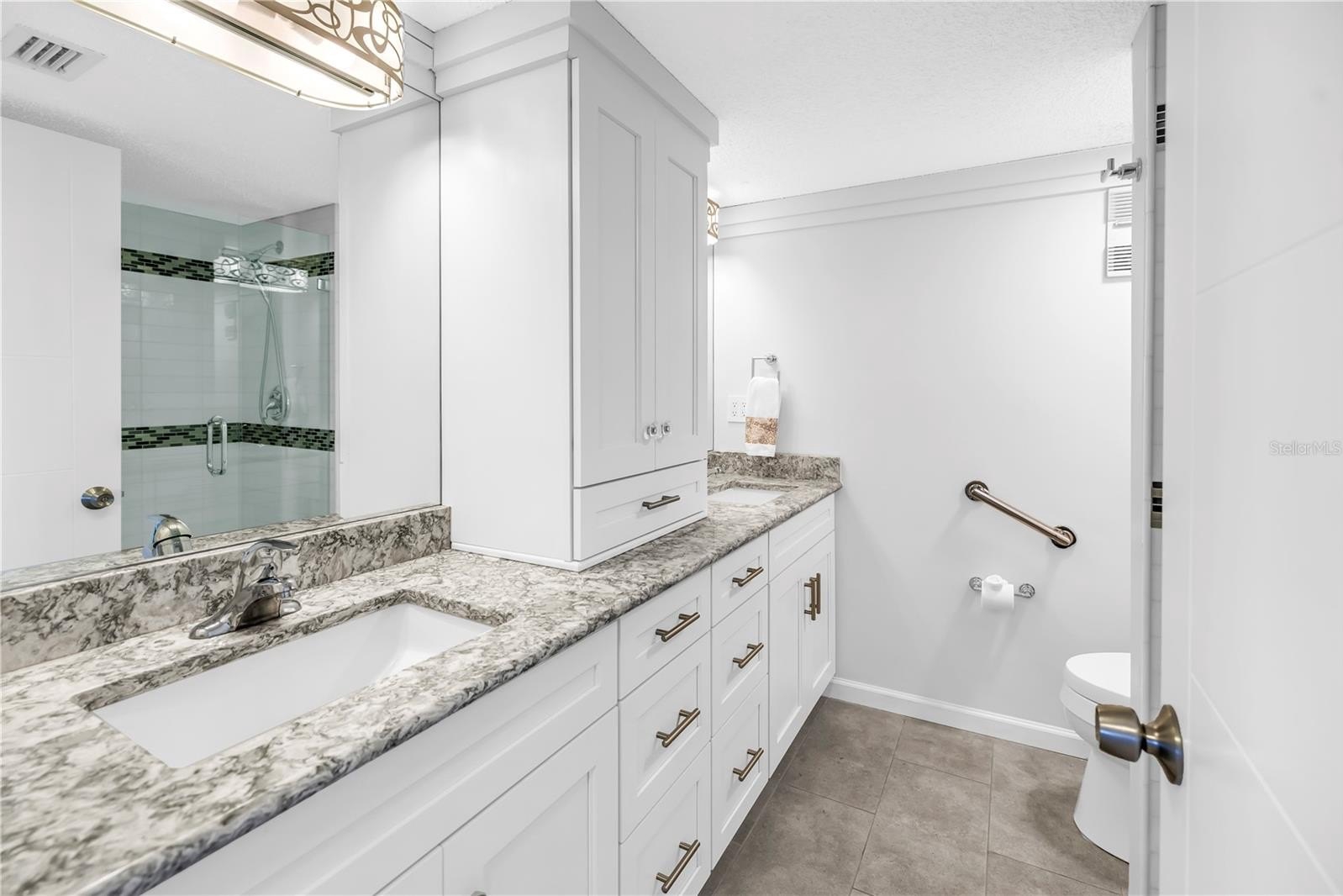 The primary suite is a sanctuary of comfort and style, boasting custom California Closets with illuminated shelving, a grand walk-in with built-in cabinetry and integrated ironing center, and Hunter Douglas electric shades. The ensuite bath is equally impressive, featuring a private water closet and a marble-clad shower with multiple shower heads — a spa-inspired retreat for ultimate relaxation.