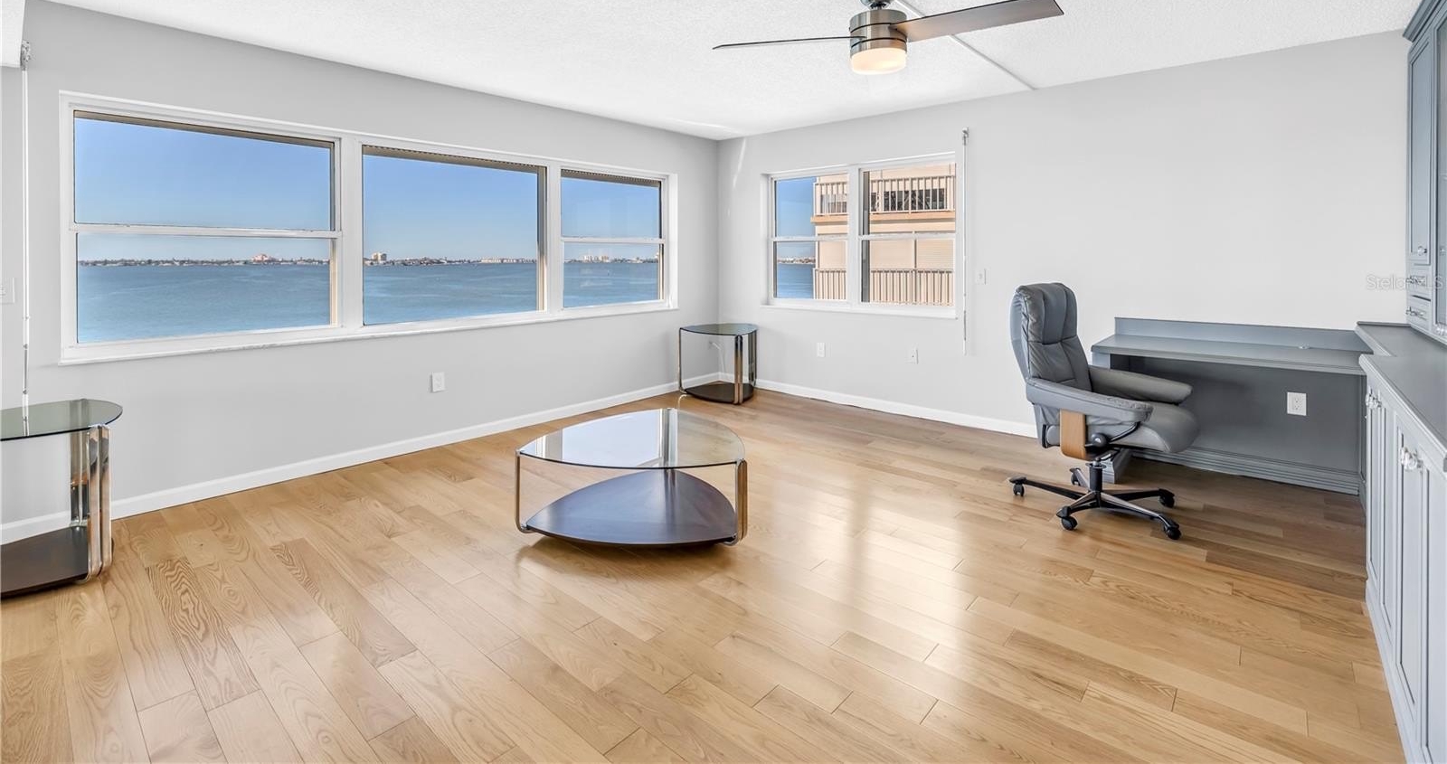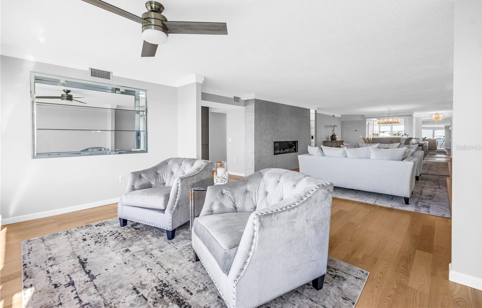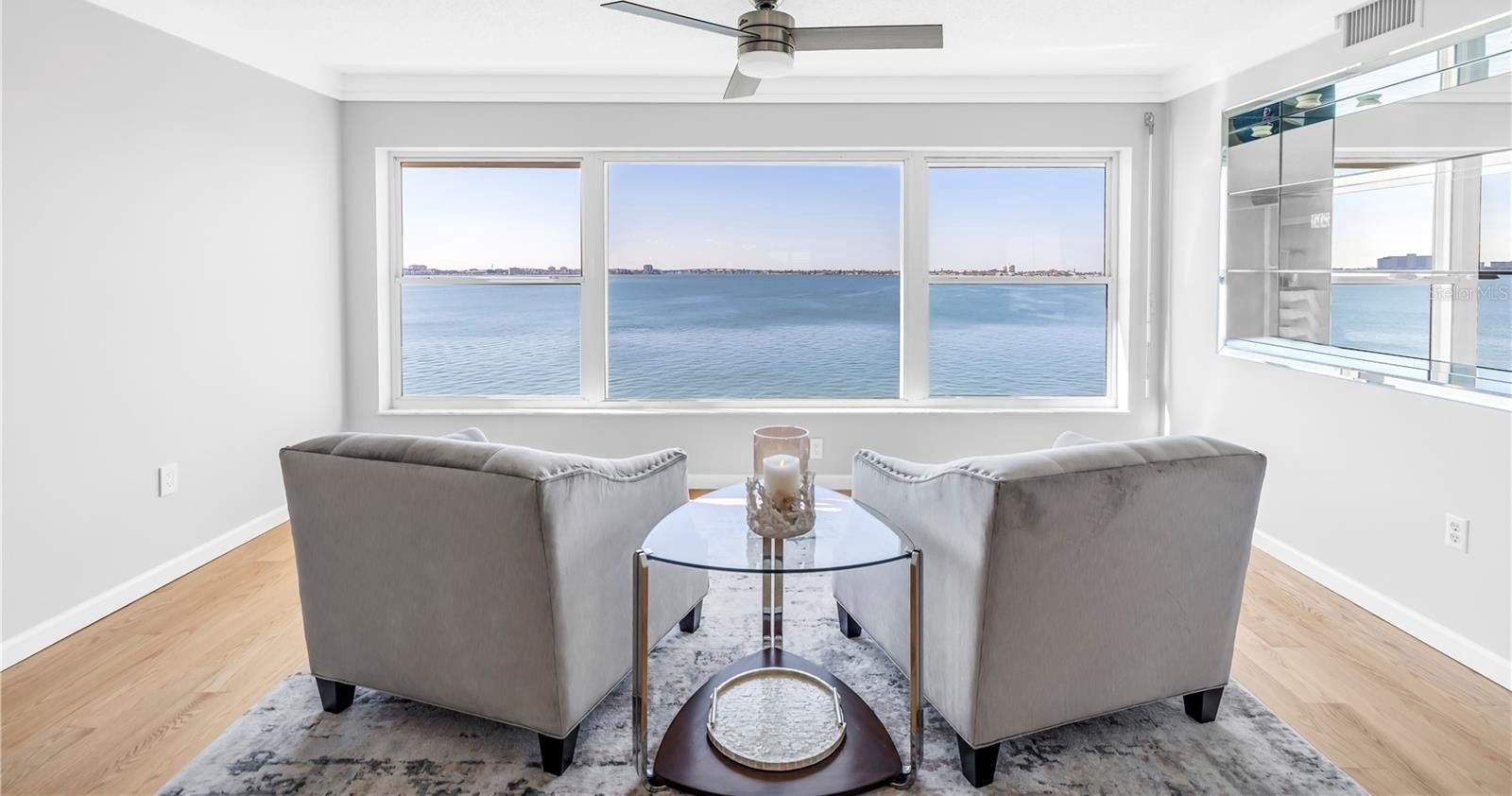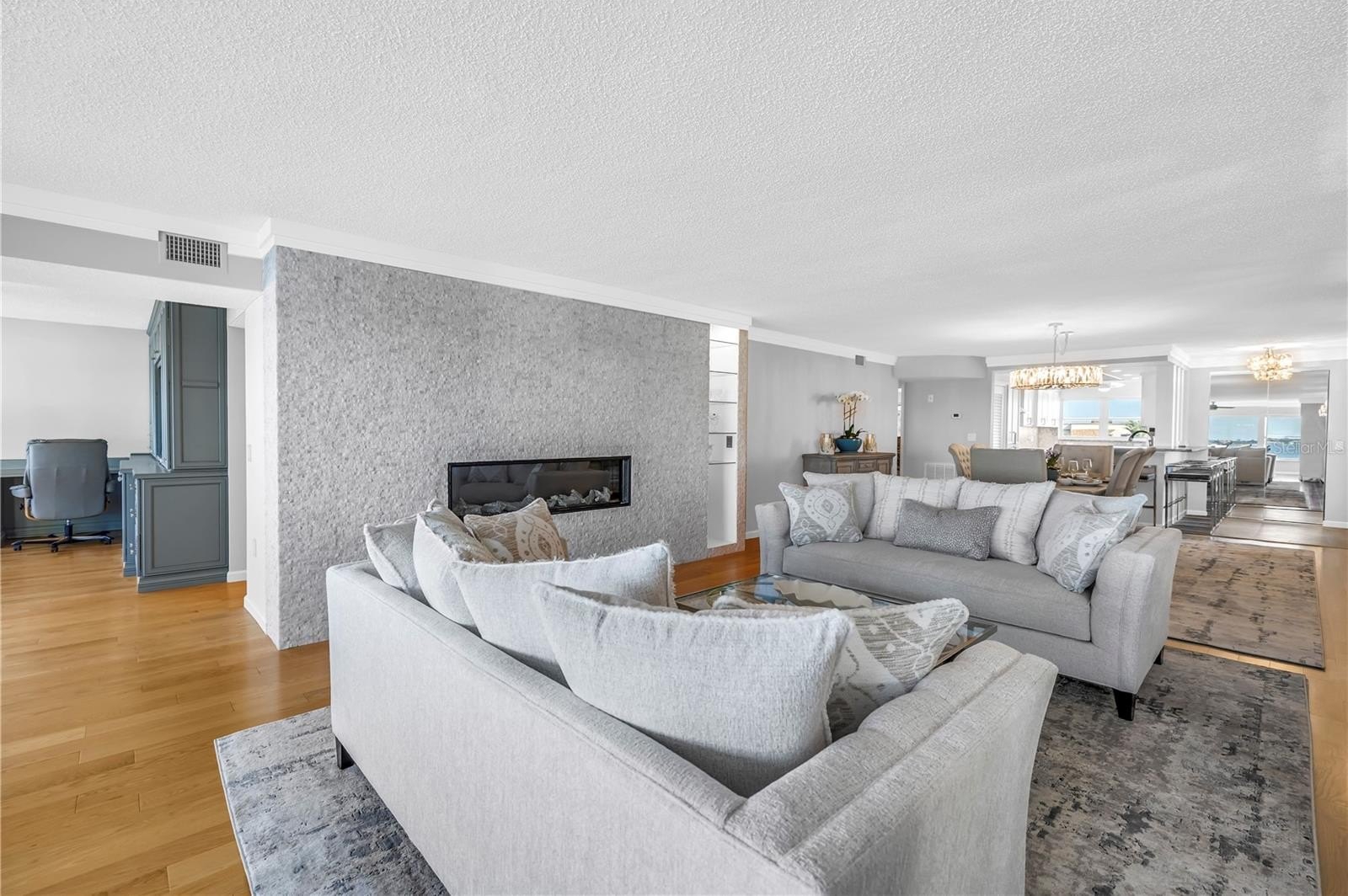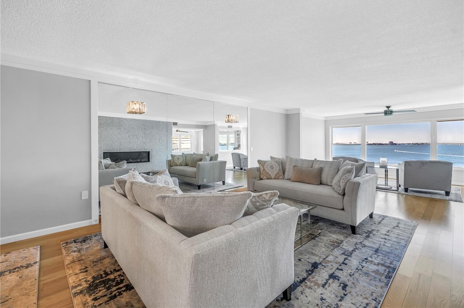 In the living area, a wall of glass captures a mesmerizing panorama — from the soft evening glow of the Don Cesar to the twinkling lights of the Tierra Verde Bridge and passing cruise ships gliding through the Gulf. The statement stone accent wall and electric fireplace infuse the space with warmth and understated luxury.