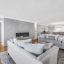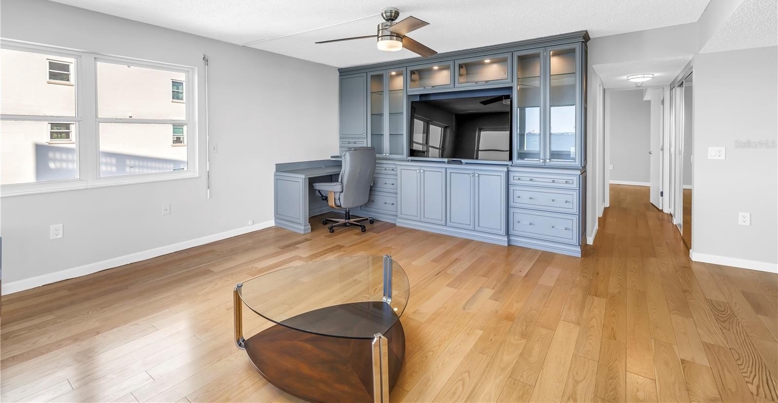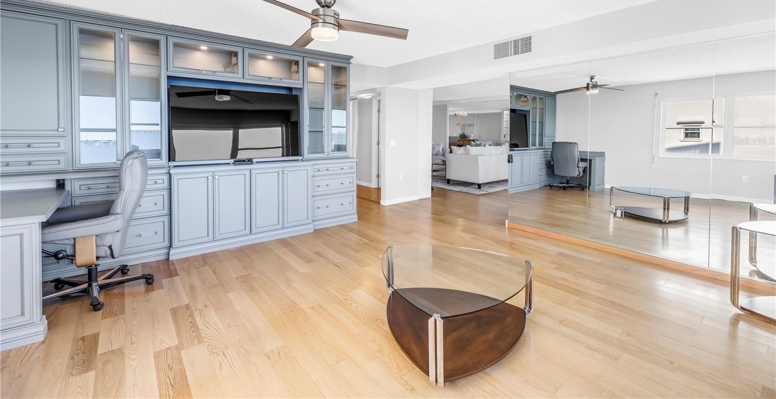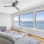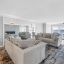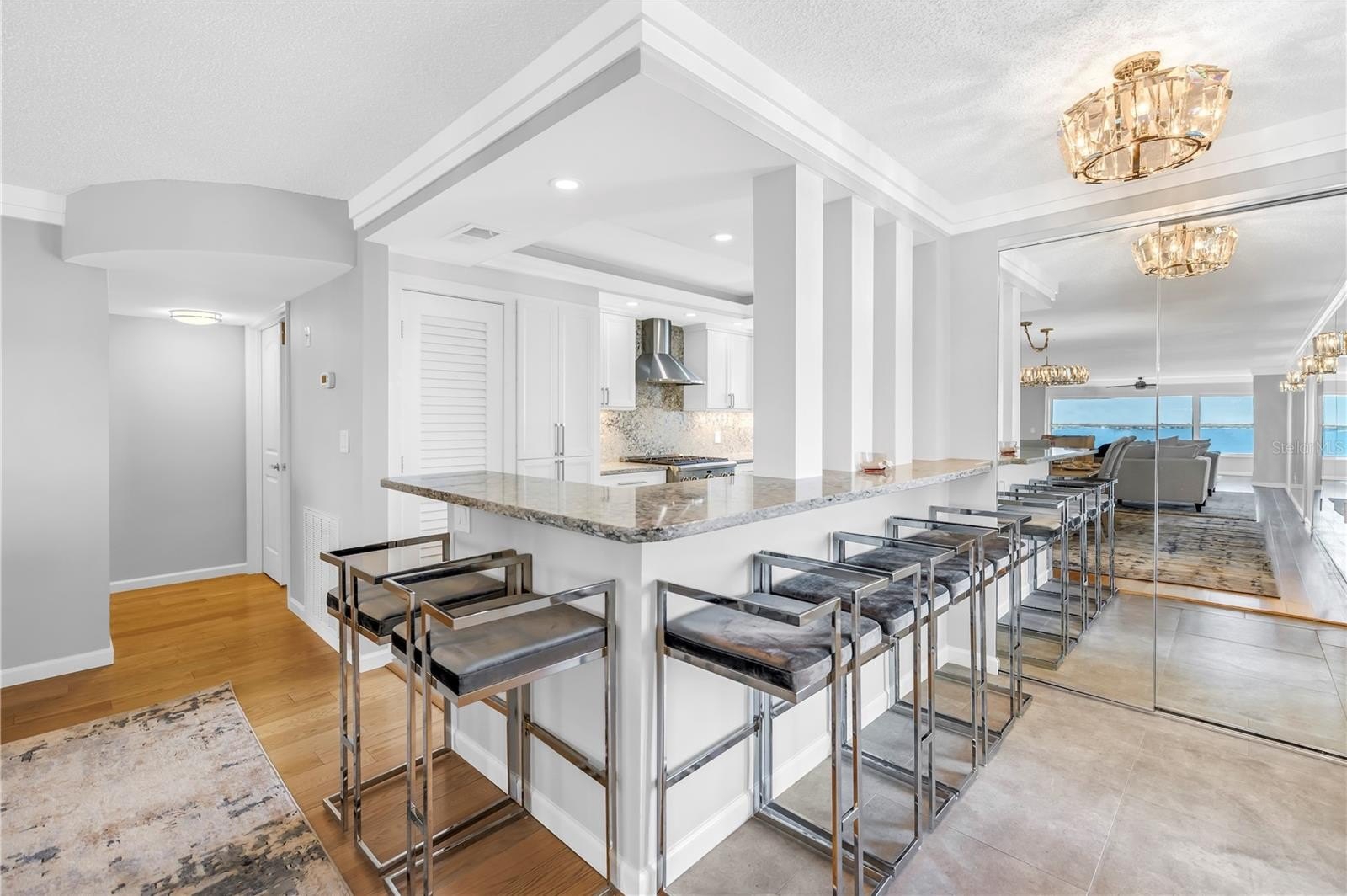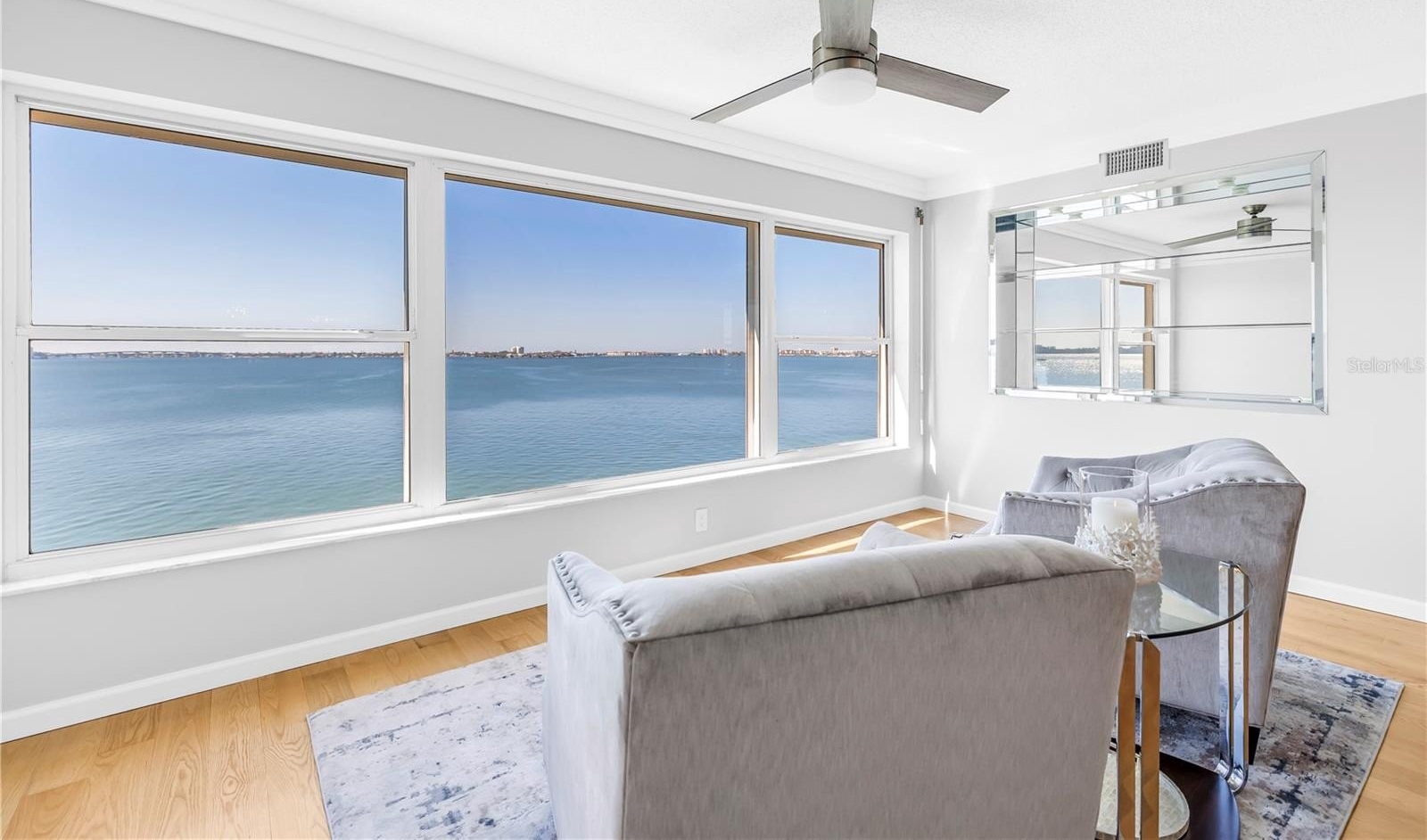 In the living area, a wall of glass captures a mesmerizing panorama — from the soft evening glow of the Don Cesar to the twinkling lights of the Tierra Verde Bridge and passing cruise ships gliding through the Gulf. The statement stone accent wall and electric fireplace infuse the space with warmth and understated luxury.