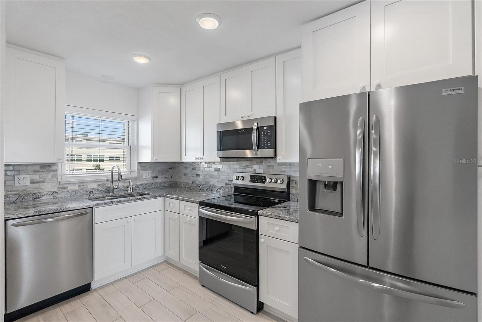 This beautifully updated condo features a gourmet kitchen with granite countertops, custom 42-inch wood cabinetry, a tiled backsplash, and a spacious breakfast island. The open floor plan flows seamlessly into a light-filled Florida room framed by walls of impact windows, showcasing spectacular water views.
