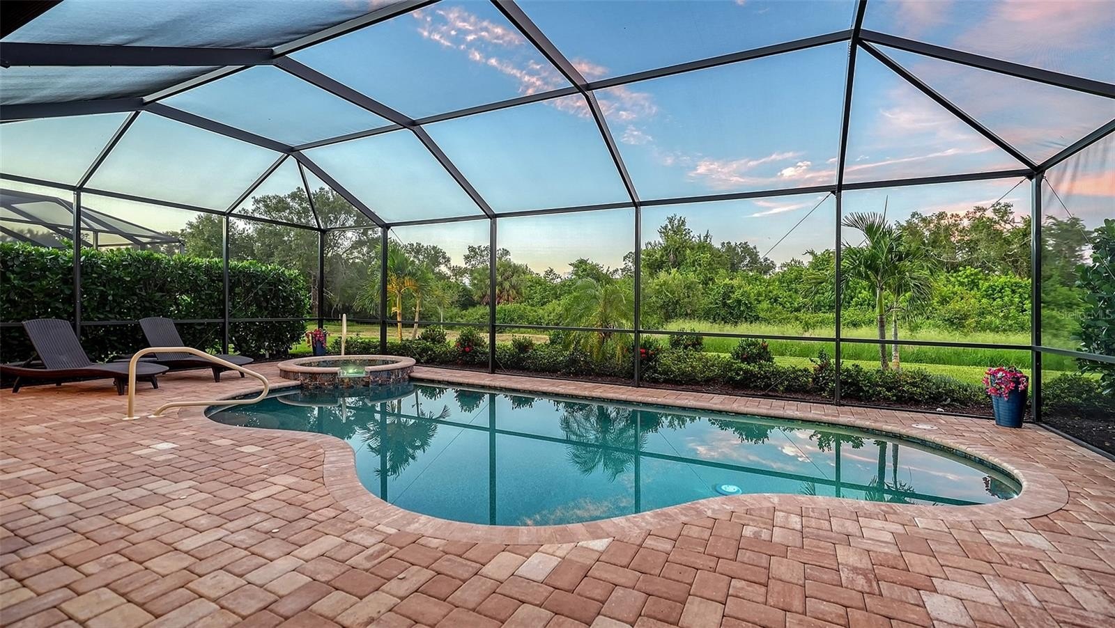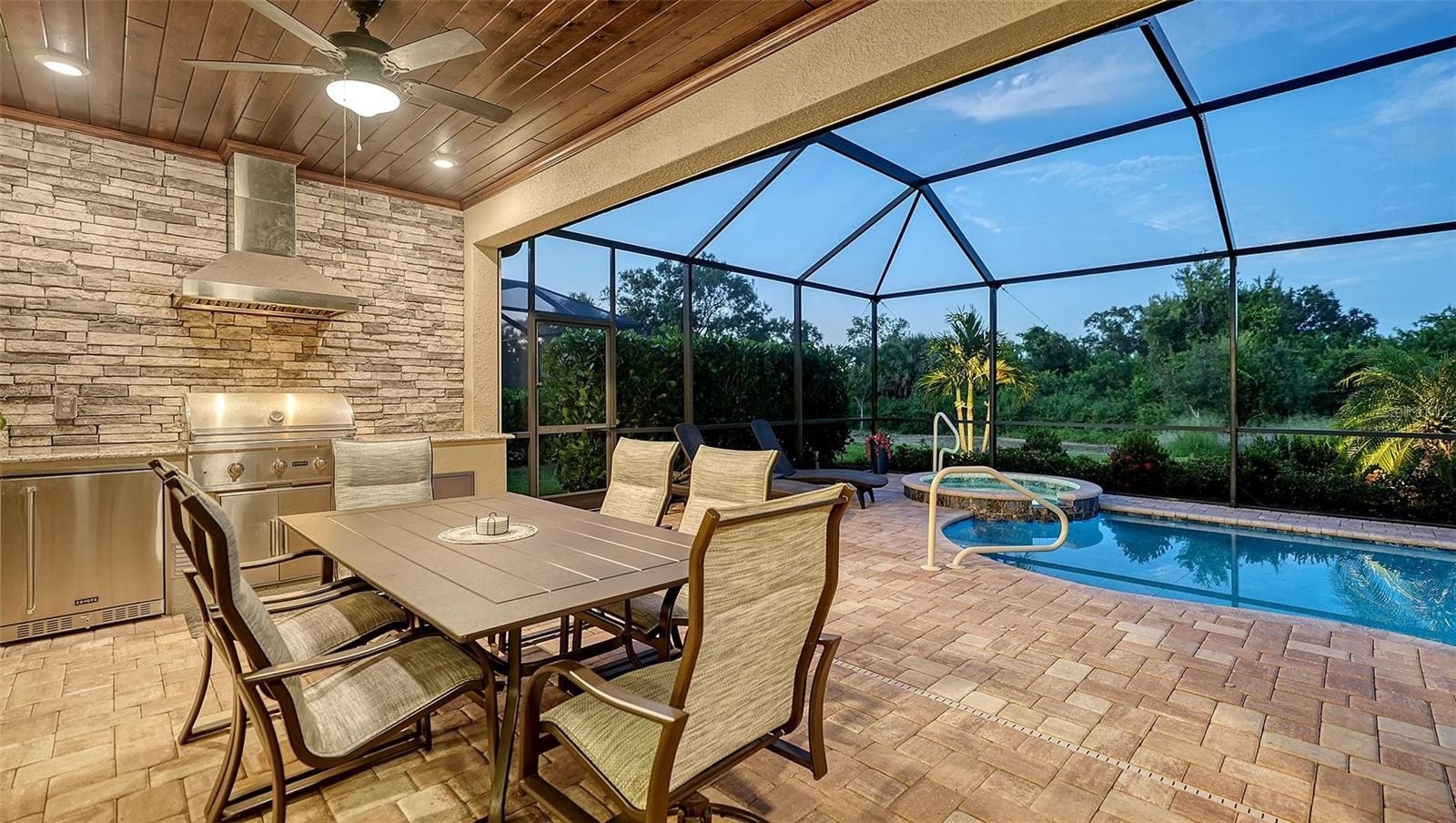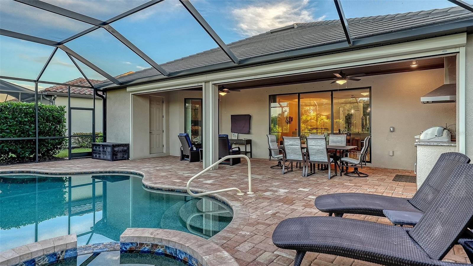 Designed for entertaining, the expansive screened lanai includes Powered Hurricane Storm Shades, a Heated Pool, Relaxing Hot Tub, and fully equipped Outdoor Kitchen. The home also includes IMPACT GLASS Windows and a WHOLE-HOME GENERATOR for peace of mind and safety.