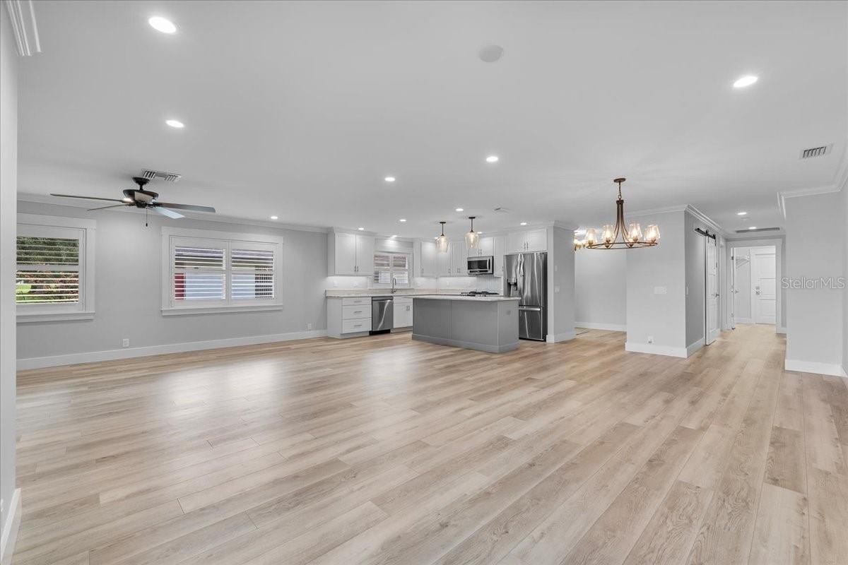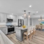 The chef’s kitchen boasts granite countertops, under-cabinet lighting, a center island, and high-end appliances including a gas range and Wi-Fi-enabled refrigerator. Elegant touches like crown molding, pocket doors, recessed lighting, and luxury vinyl flooring add warmth and sophistication throughout.
