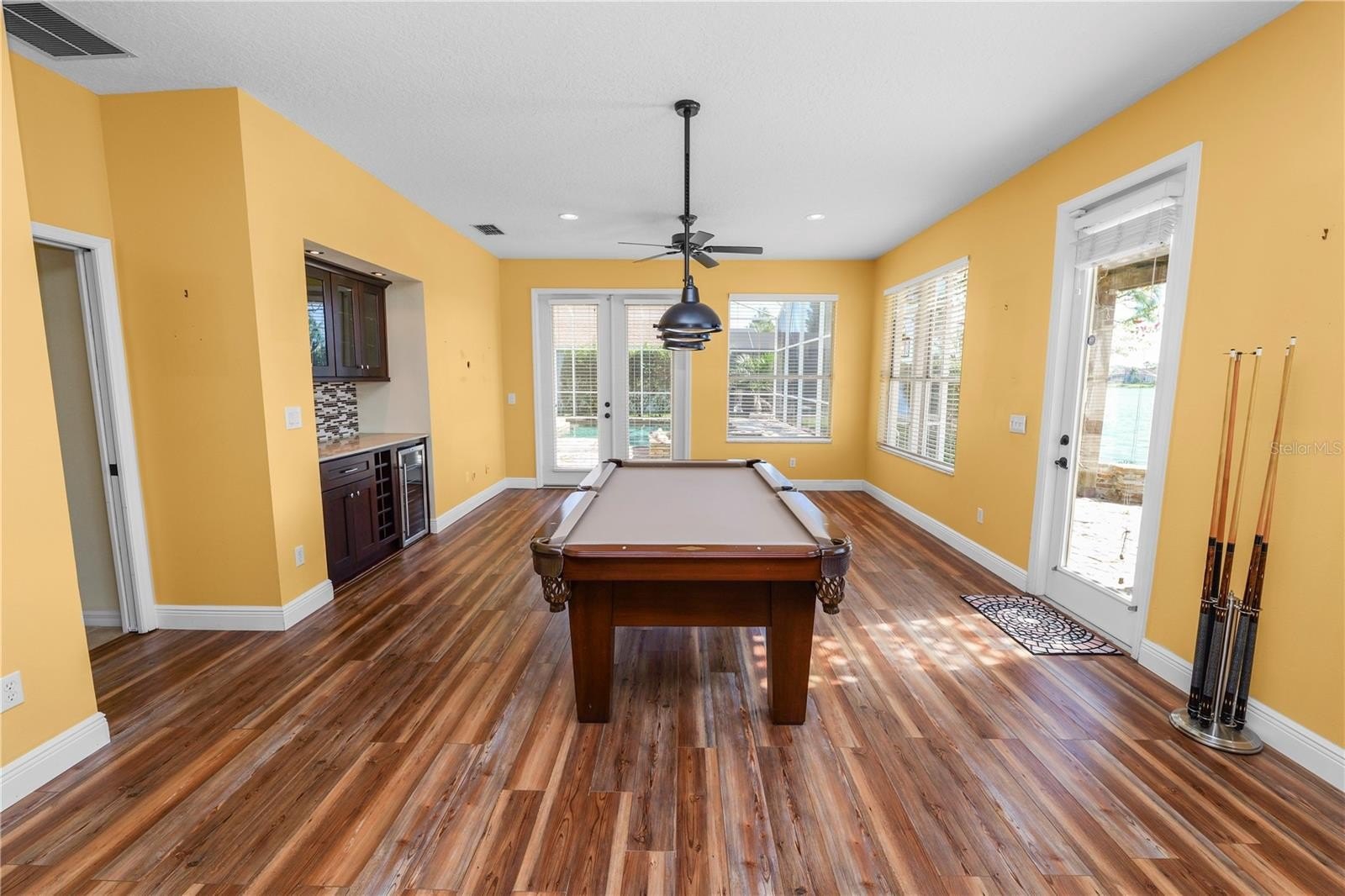 This lakefront Calabay Cove property has manicured grounds with gorgeous flower gardens in the front and a sparkling pool overlooking the serene waters of Lake Calabay. The 4/5-bedroom home is just as beautiful inside, with tile/wood floors, high ceilings, crown molding and large windows – which let in lots of natural light & showcase the water views. French doors in master bedroom, living room, family room and game room give you easy access to the pool and pergola areas. Just off the foyer, you’ll find the 5th bedroom or use as a dedicated home office, formal living room with French doors accessing the pool area and a formal dining area. At the rear of the floorplan, the family room is open to the kitchen and includes a wood burning fireplace and custom built-ins. The kitchen features shaker cabinetry, granite countertops, pro-style appliances, a center island and a breakfast nook. Just steps away, the backyard oasis includes a covered patio for entertaining, plus a completely screened-in pool & spa surrounded by a stone deck. Outside the enclosure, the pergola-covered patio is lined by another garden and provides a great spot to admire the lake. The back wing of the house has a BONUS recreation/game room with a dry bar and access to the patio and pergola. The spa-like master ensuite includes custom tilework, a double vanity, a soaking tub and a separate shower. Two guest rooms down the hall share an updated Jack & Jill bathroom with all the same high-end finishes found throughout the rest of the home. The laundry room off the 3-car garage also has granite countertops and tons of storage. Calabay Cove is a gated community with easy access to schools, parks, trailheads and highways. Plus, The Loop shopping mall, Publix and numerous dining options are all just 5 minutes from your front door. Less than 20 minutes to the theme parks, 25 minutes to the airport and 1 hr to the beach! Enjoy the most breathtaking sunrise and sunset from the pool and pergola areas. This lovely home's roof was replaced 10/22. Third car garage converted into a workshop with wall-mounted A/C. Pool table in game room remains with the property. Custom designed dinette set with bench also remain.