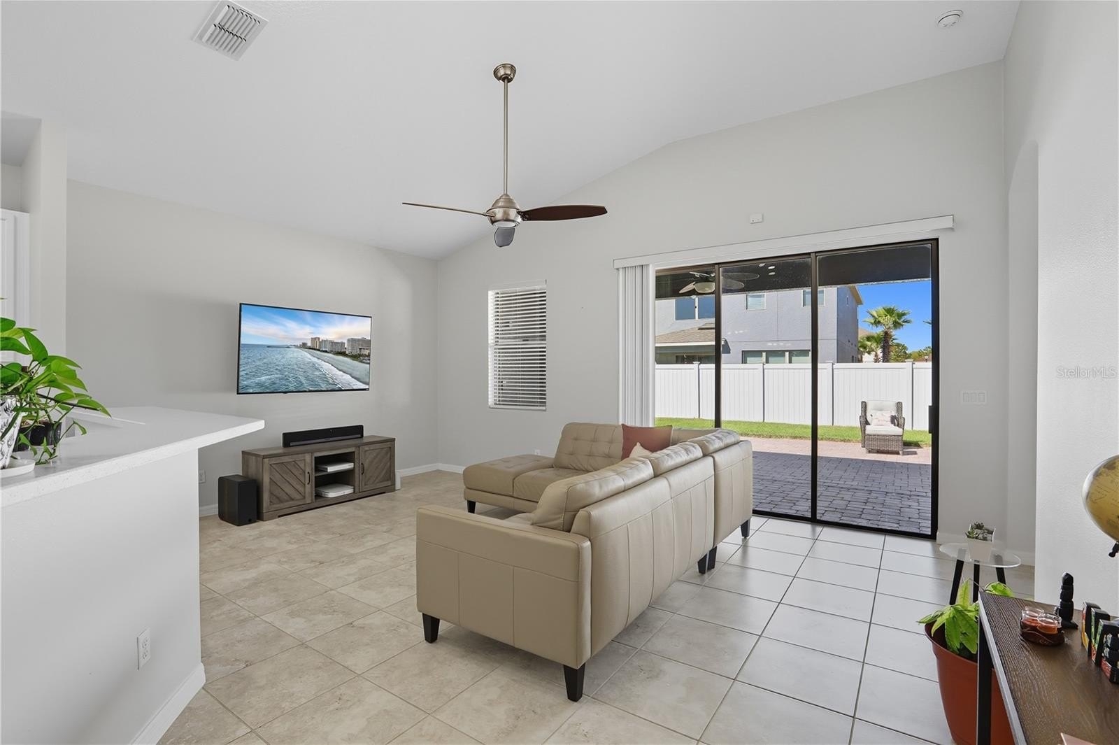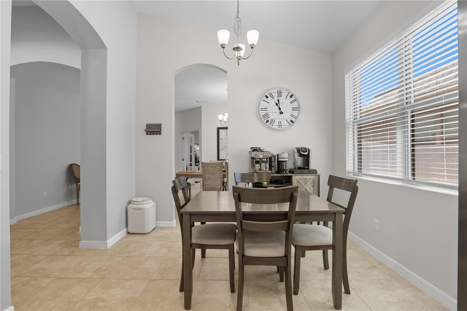 Inside, the easy-flow layout showcases vaulted ceilings, multiple arched openings, and durable tile flooring across the main living areas. The kitchen is the heart of the home updated hardware, solid-surface countertops, mosaic tile backsplash, and stainless-steel appliances including a gas range—all opening to the living area for seamless everyday living and entertaining. A sunny casual dining space sits just off the kitchen, while a separate dining/flex area near the foyer adds options for hosting, a home office, or hobbies.
