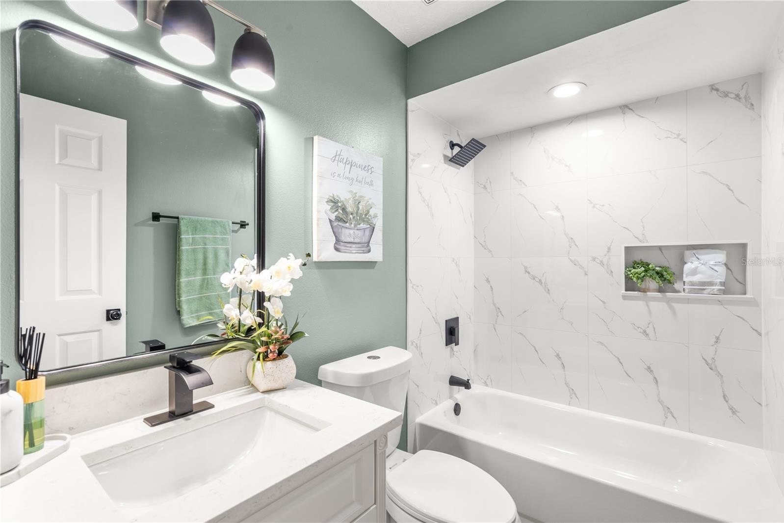 The two additional bedrooms are spacious and filled with natural light, perfect for family or guests. The guest bathroom has been completely renovated, featuring new tile, new bathtub, modern fixtures, mirrors, faucets, and stylish hardware throughout.