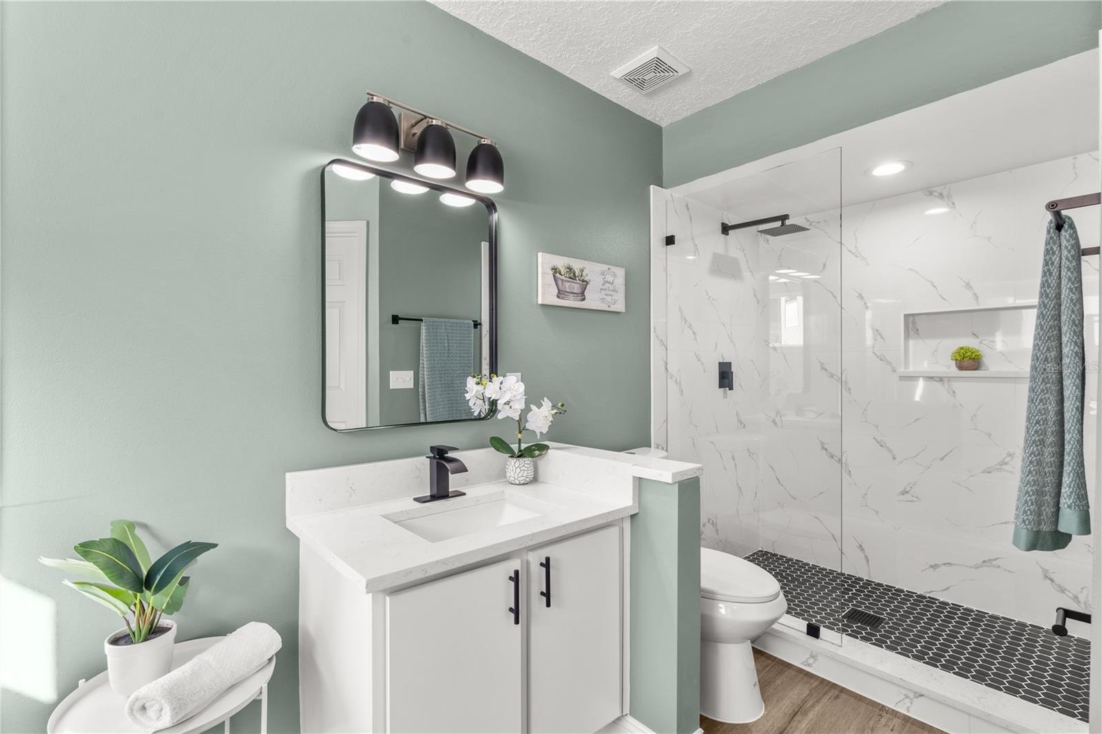 The primary suite offers generous space and comfort, including a bonus room/den ideal for a home office, nursery, or private lounge. The luxury primary bathroom features two separate showers with stylish tile, a new frameless glass panel, and all new fixtures, faucets, mirrors, and elegant hardware, creating a spa-like experience.