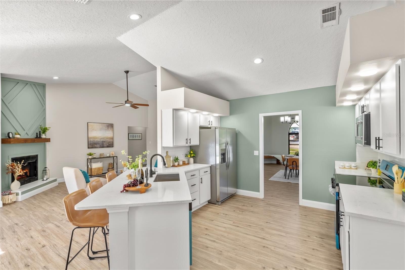 The designer kitchen is a true highlight, featuring gleaming quartz countertops, soft-closing cabinets, recessed lighting, and brand new stainless-steel appliances that elevate the home’s modern aesthetic. The open layout flows seamlessly into the large family room with vaulted ceilings and a cozy fireplace, perfect for gatherings, while the formal living-dining combo offers additional entertaining space.