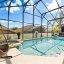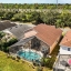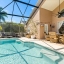The spacious backyard is a private retreat, featuring a screened-in pool, hot tub, and large deck for BBQs or relaxing in the Florida sun. Large sliding doors connect the indoor living spaces to this tropical oasis, offering seamless indoor-outdoor entertaining.